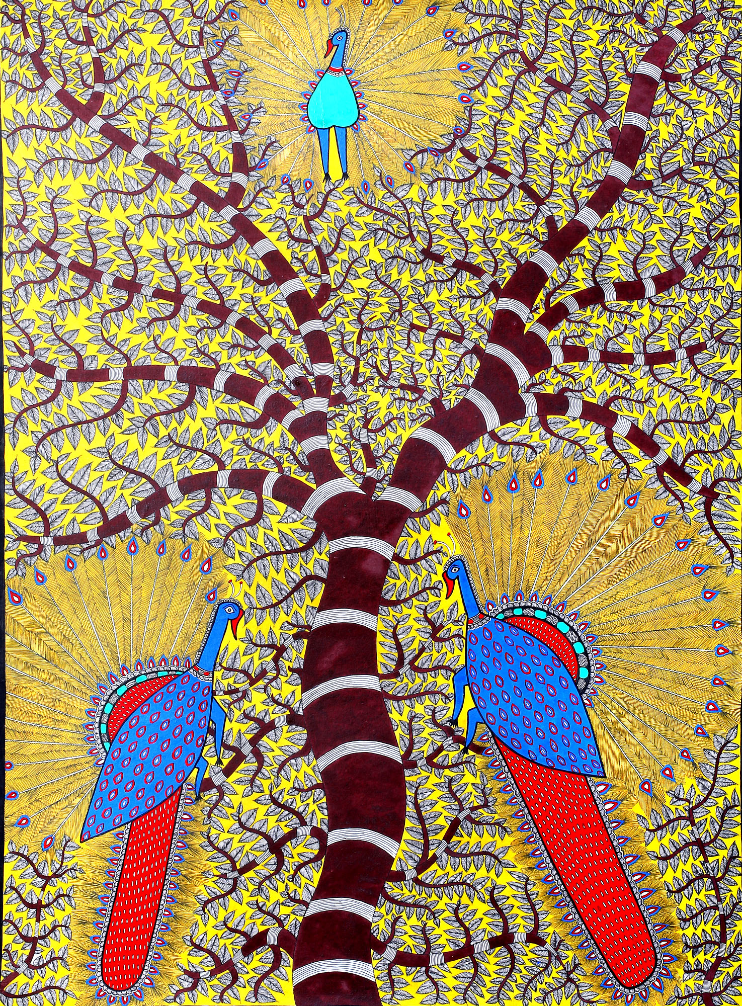 28" Tree of Life Painting with Full of Birds | Madhubani Style