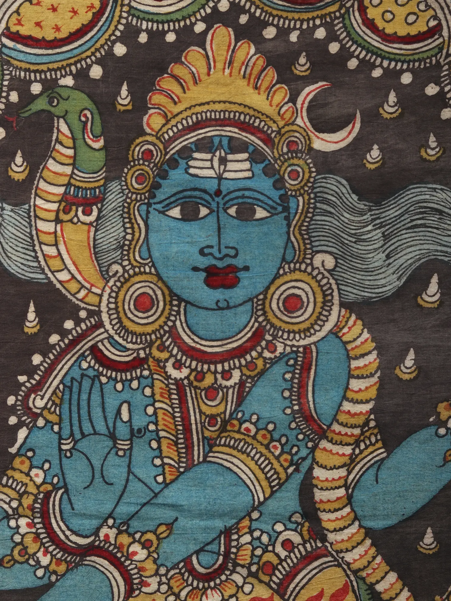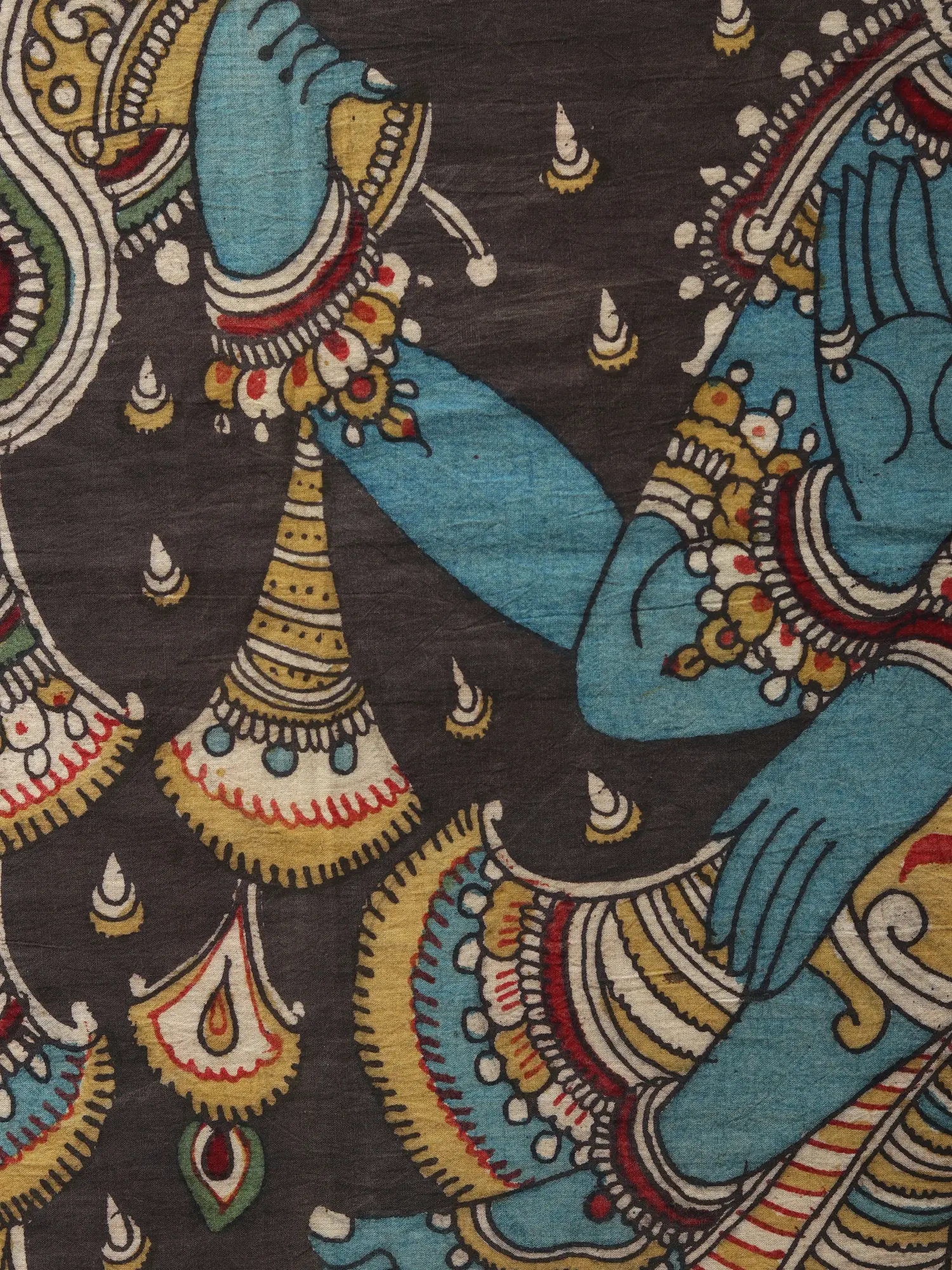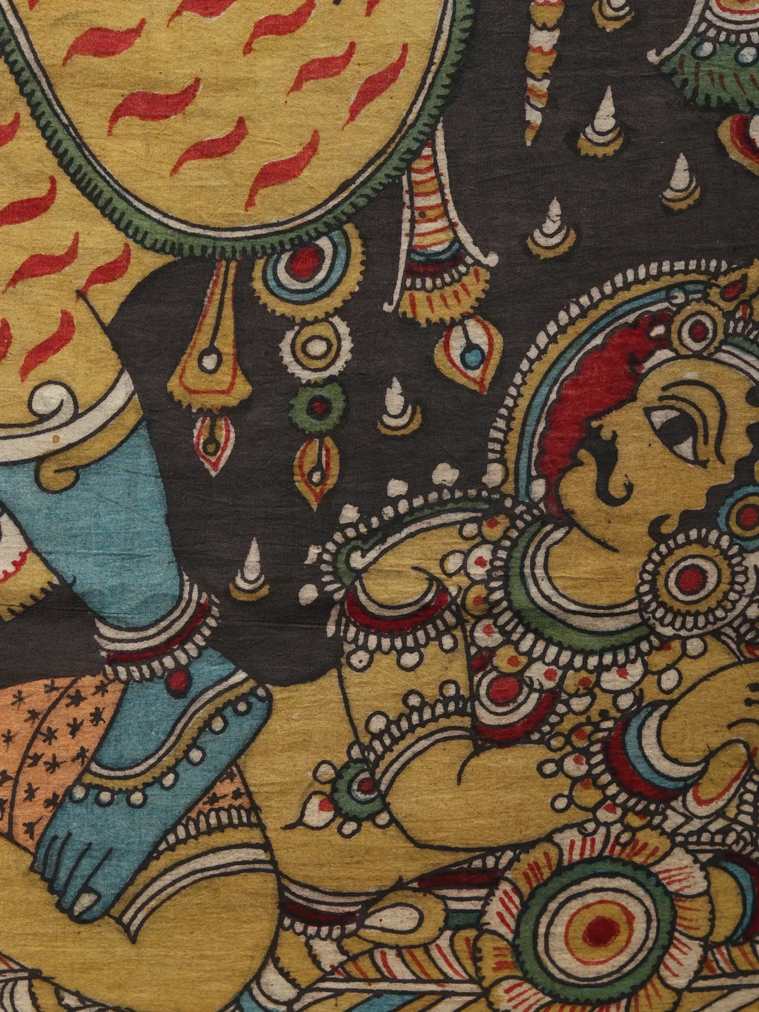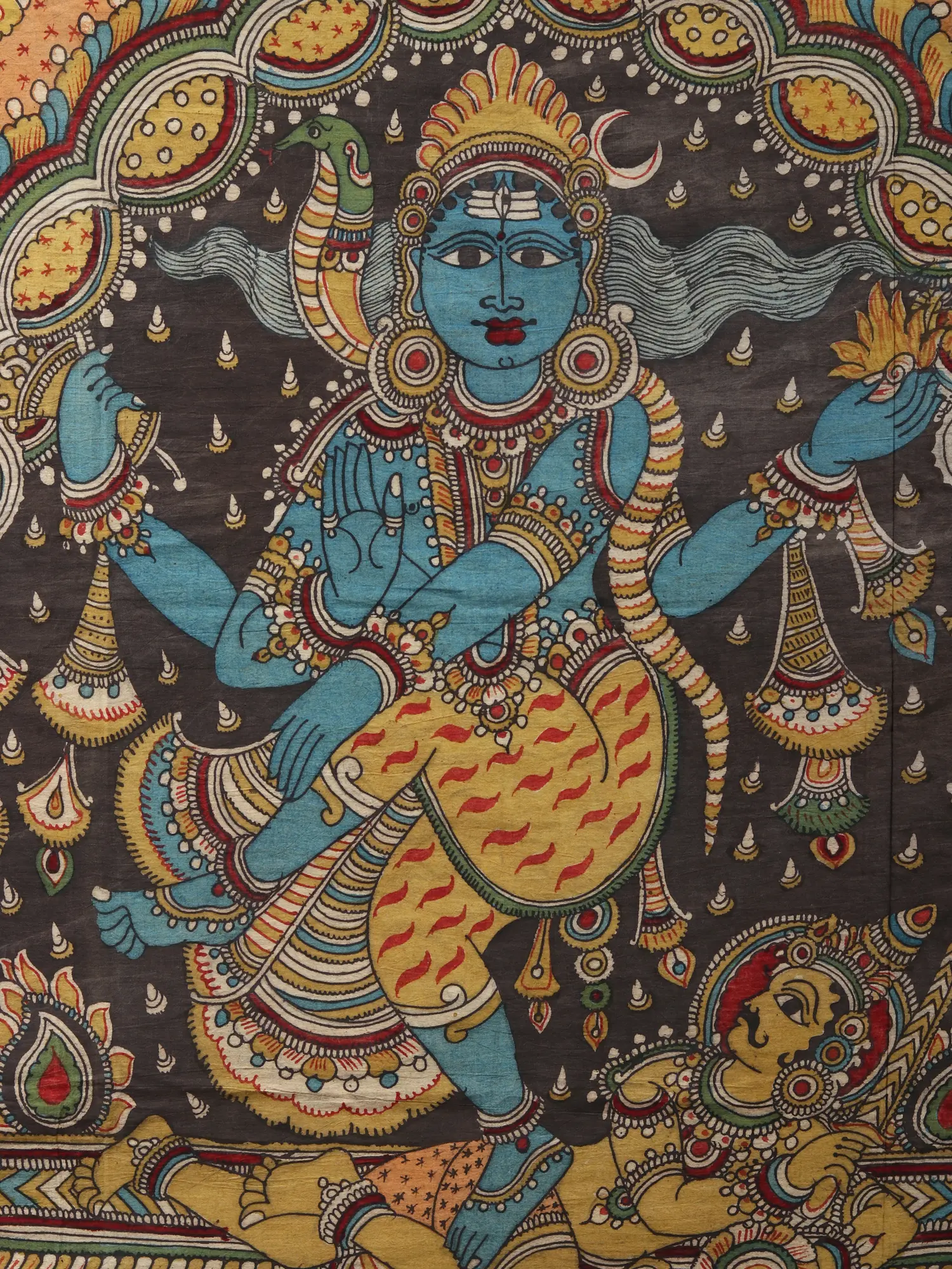 Kalamkari art, originating from the Indian subcontinent, has deep roots in storytelling and religious epics. This depiction of Shiva as Nataraja specifically draws from Shaivite traditions, embodying the philosophical concepts of creation, preservation, and destruction that underpin Hindu cosmology. Each brushstroke carries the weight of centuries of cultural and spiritual significance, offering a glimpse into a rich philosophical tapestry.