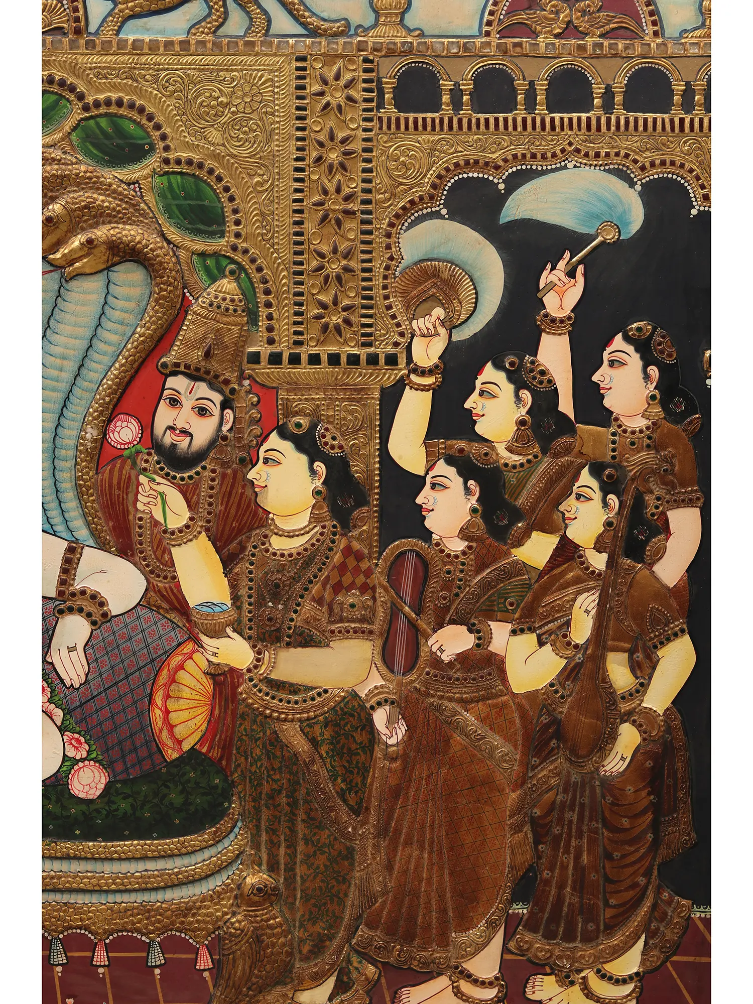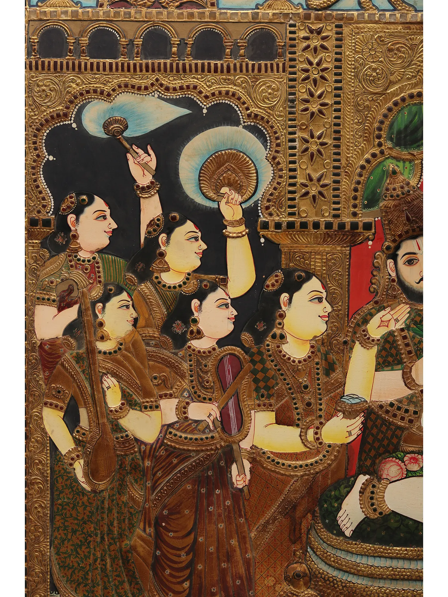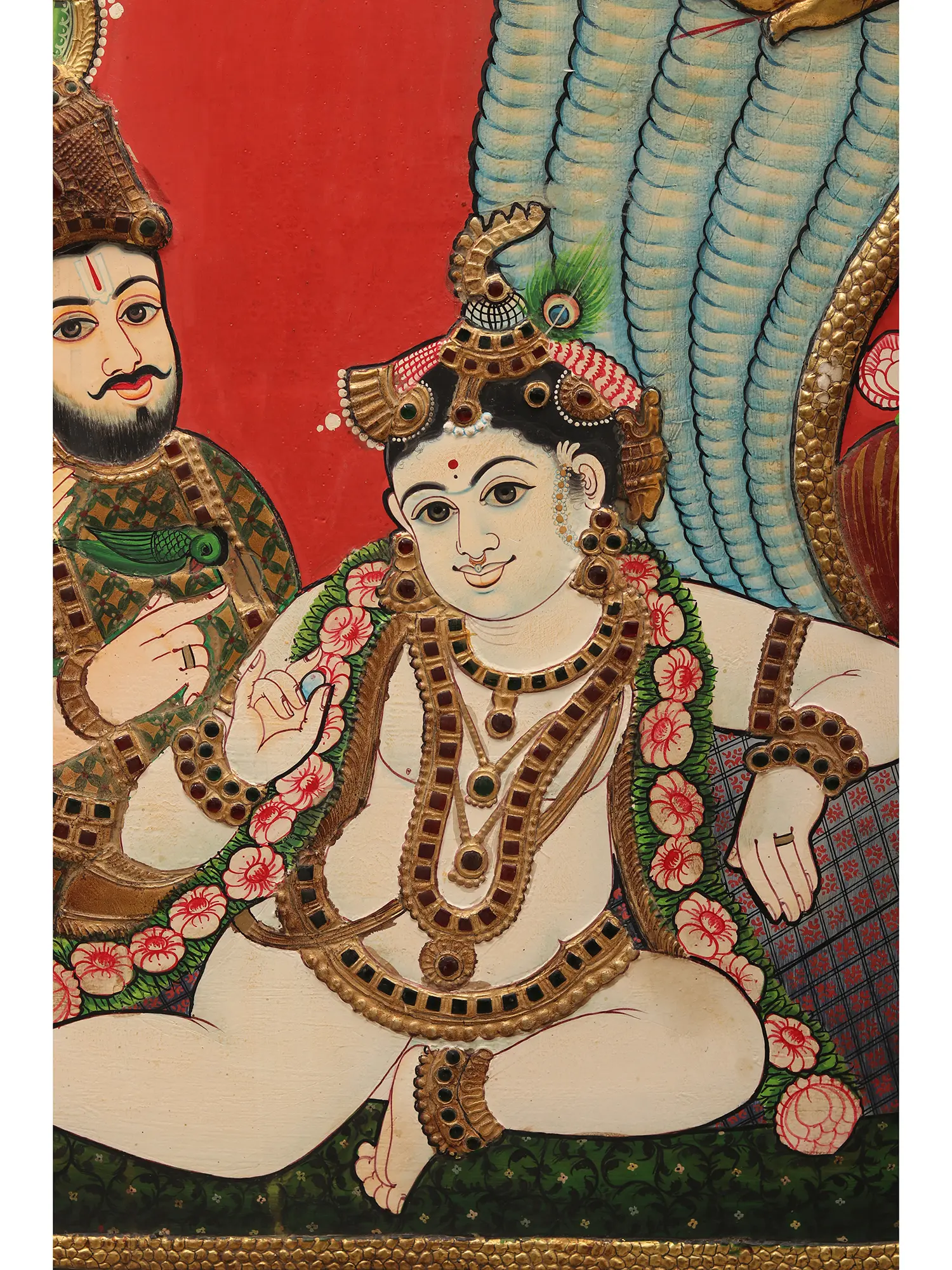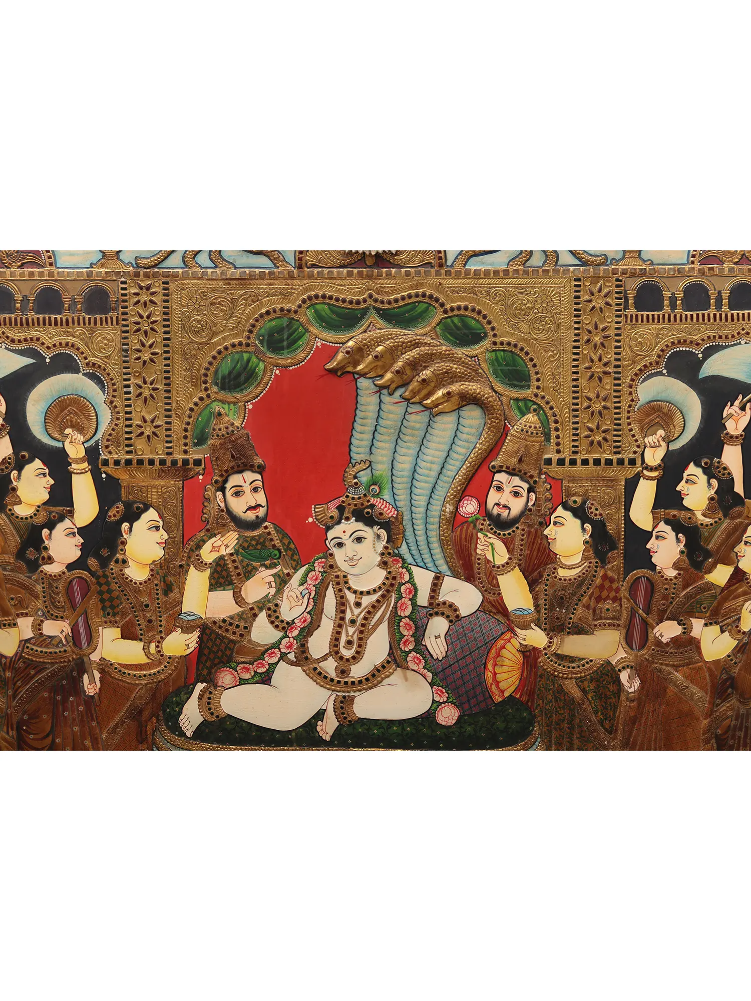 This painting depicts Lord Krishna in a regal court (darbar), using traditional colors and 24 Karat gold accents to accentuate his heavenly and royal character.