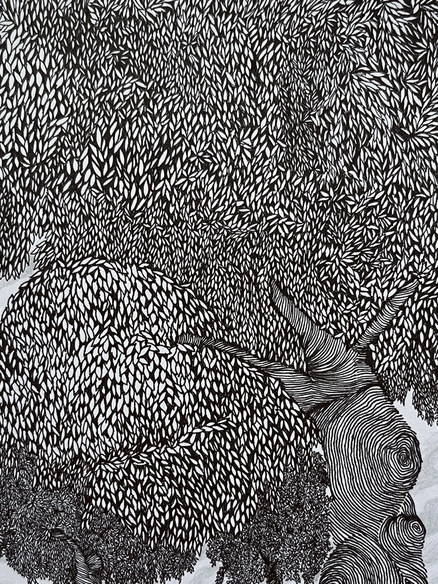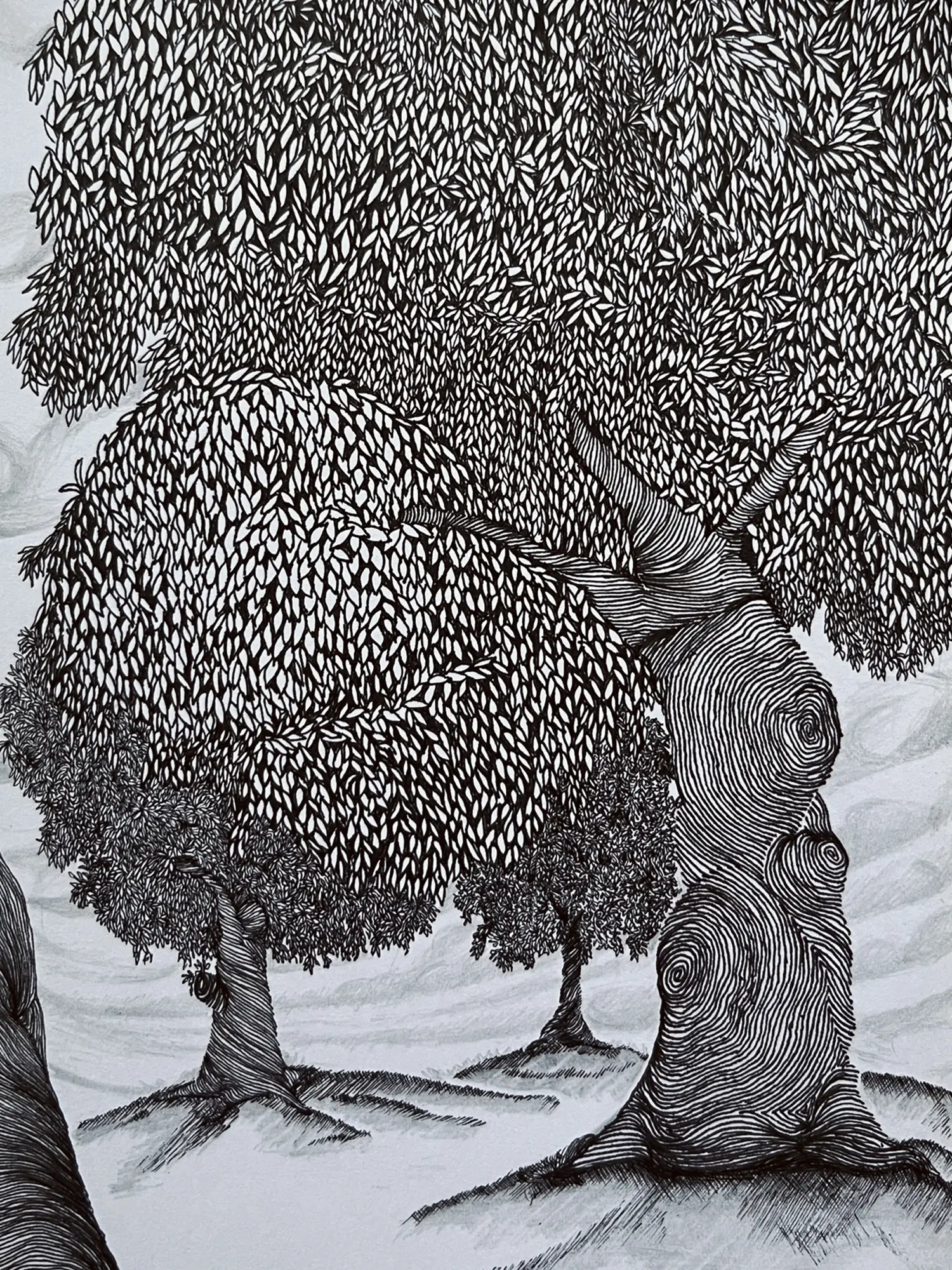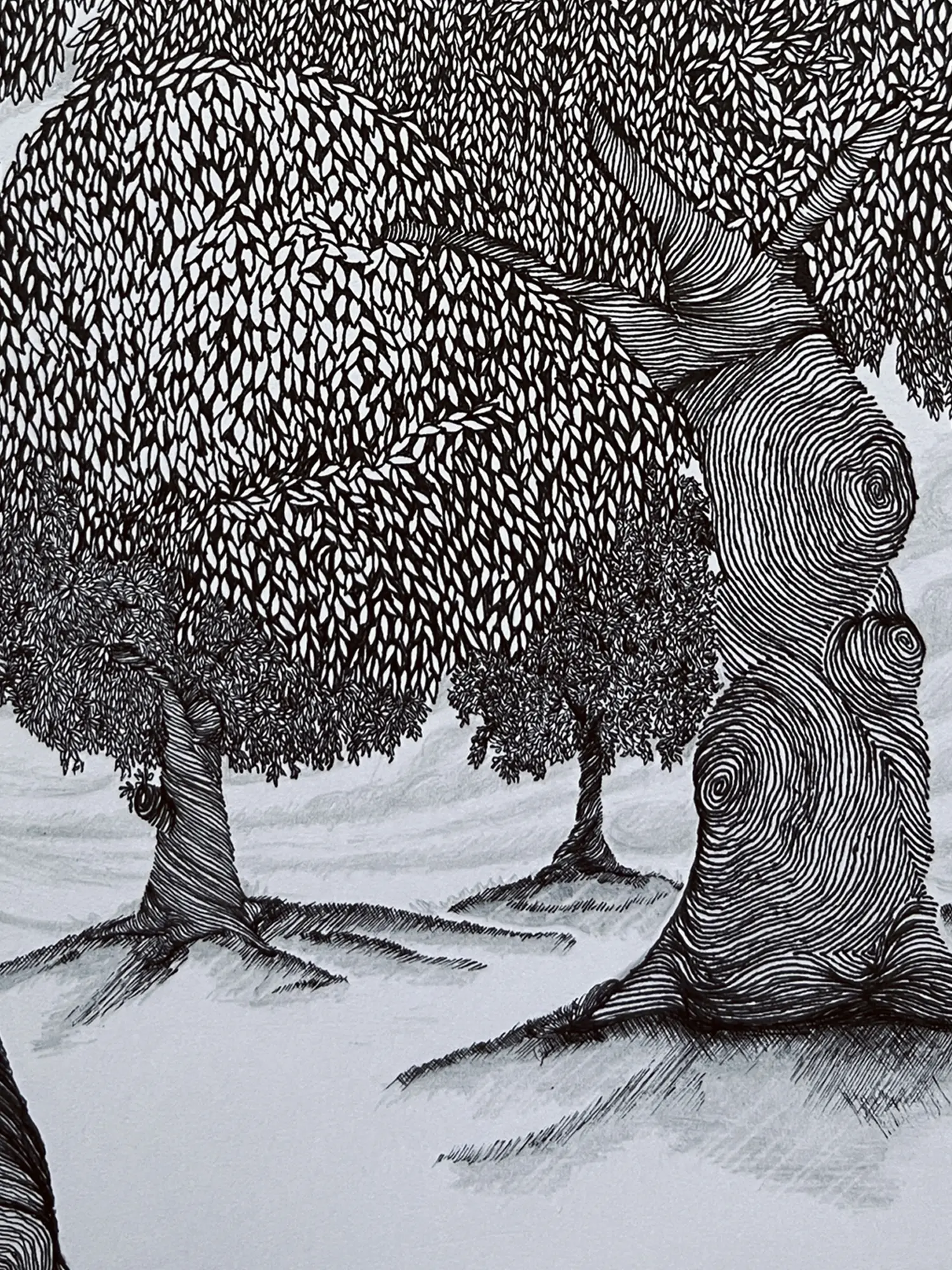 The ink art captures the essence of trees and woods in a display of fluid lines and intricate patterns. Each tree becomes a testament to nature's grandeur and resilience, its branches reaching skyward in silent reverence. Seeing the dense foliage and dappled sunlight, viewers are transported to a realm of natural wonder and untamed beauty, where the whispers of the woods echo with ancient wisdom and eternal mystery.