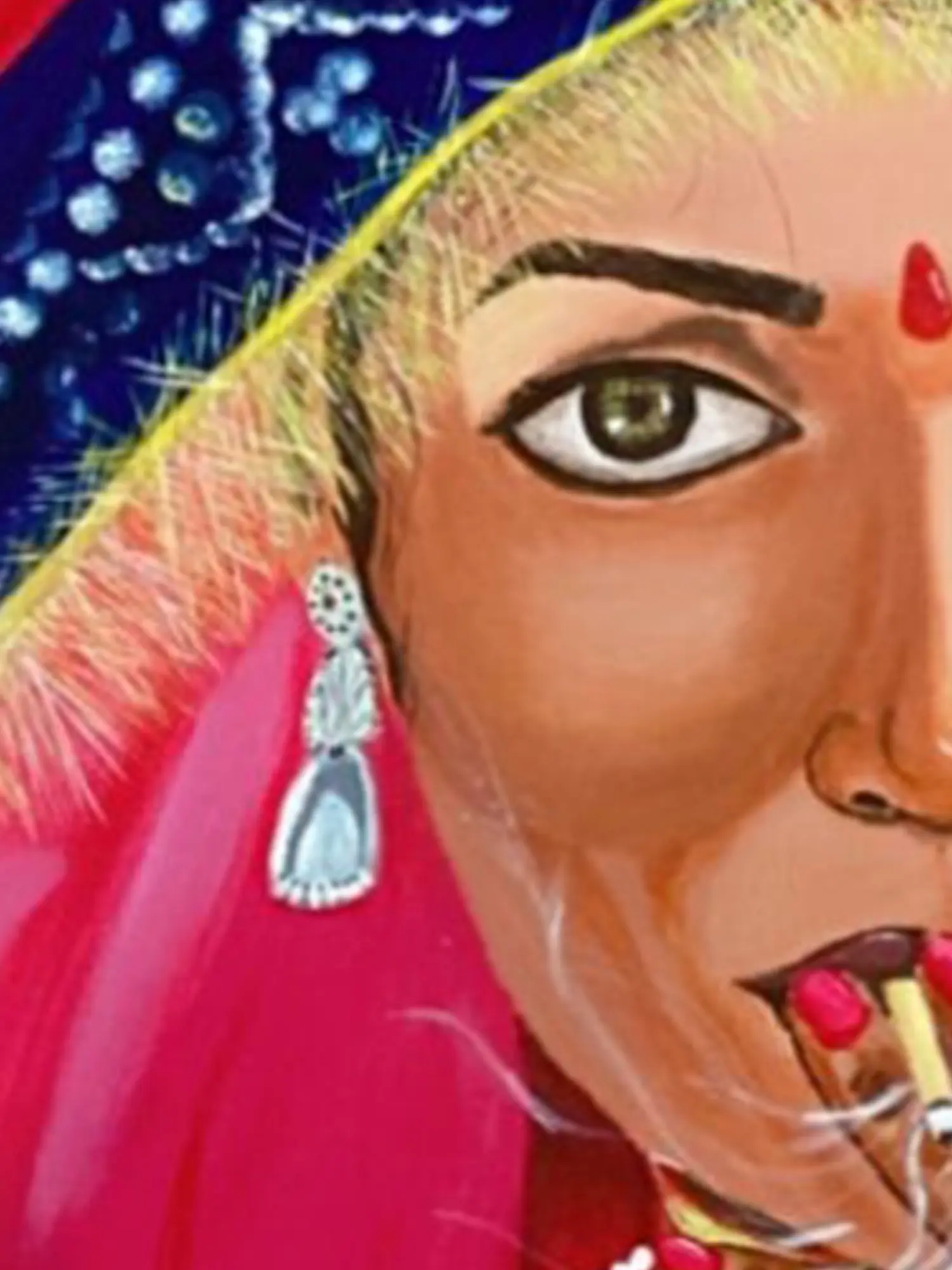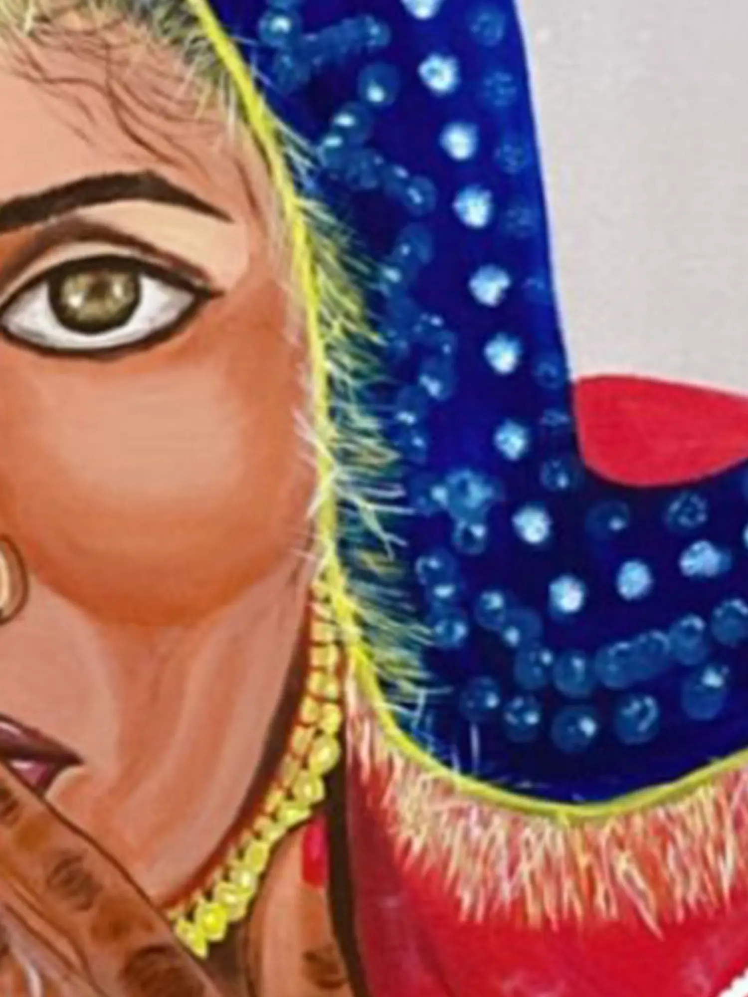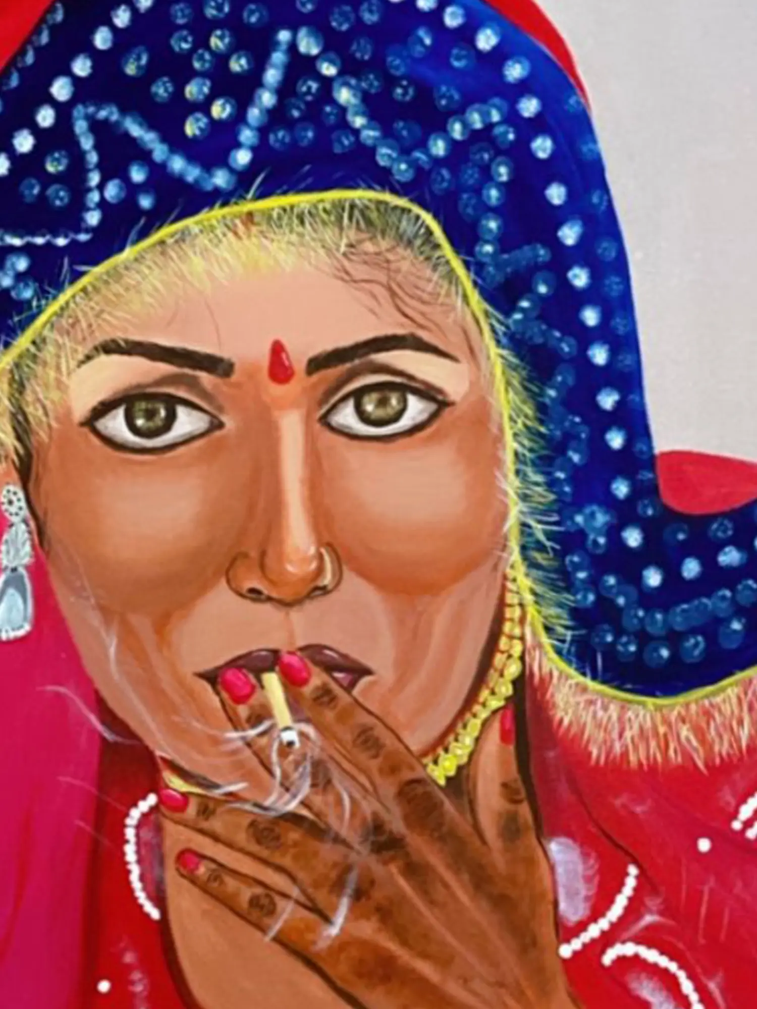 Crafted with dedication and skill, this piece showcases the vibrant brilliance of acrylics on a stretched canvas. The artist, Manmeet Kaur, employs a rich palette and confident application to bring forth the textures of fabric and the nuances of skin tone. Each layer of paint contributes to a tactile and visually engaging surface, a testament to artisanal quality.