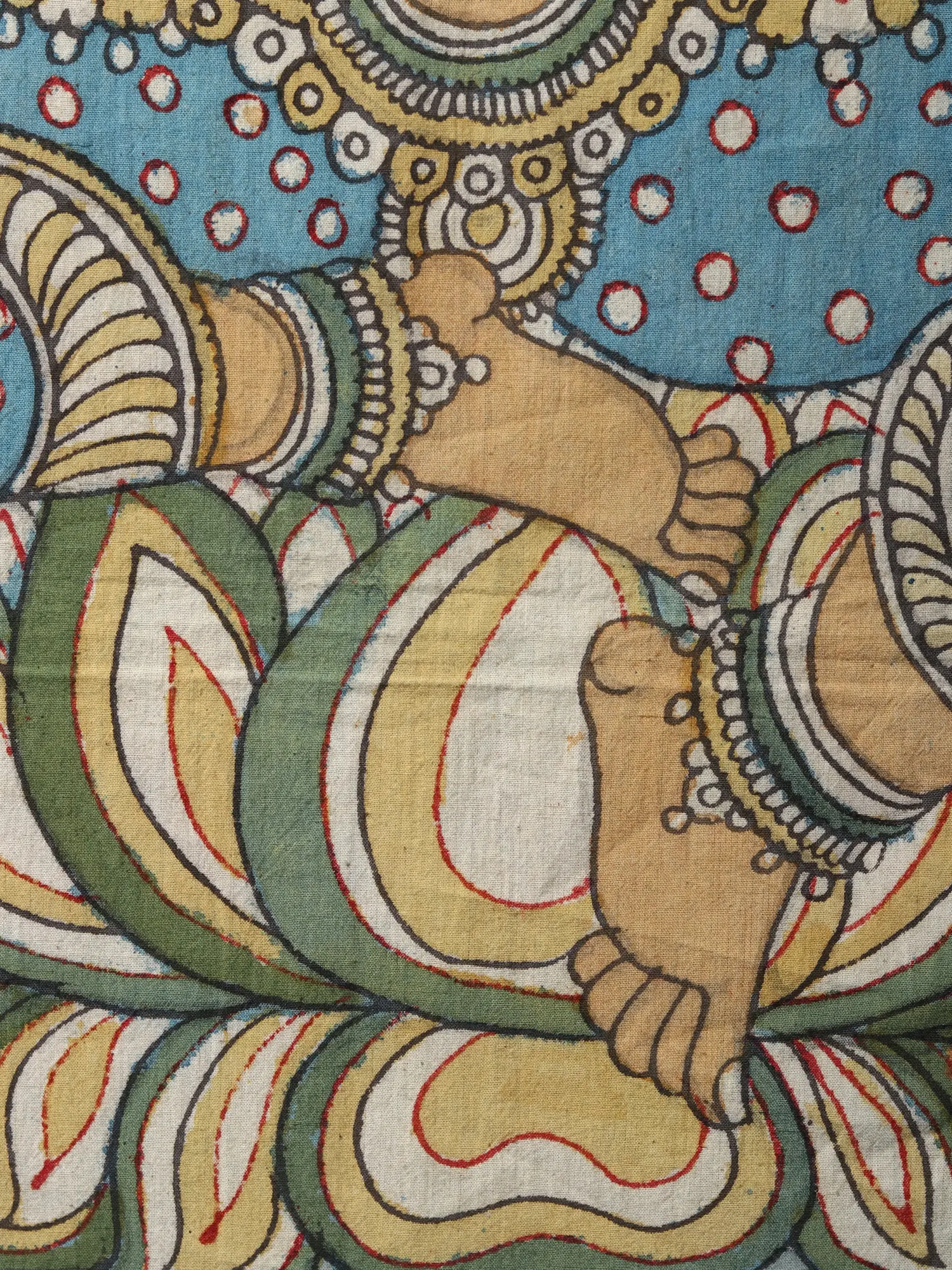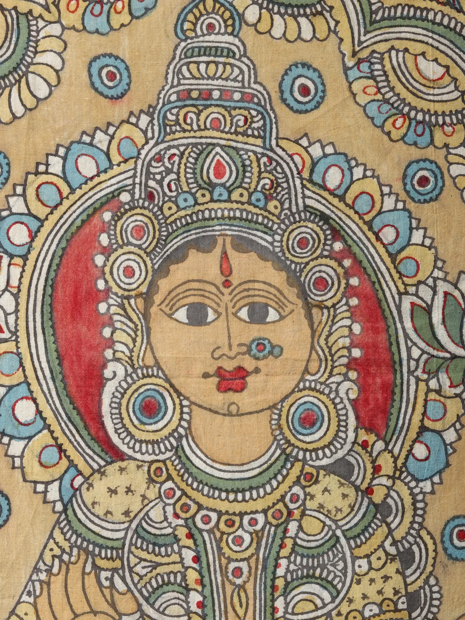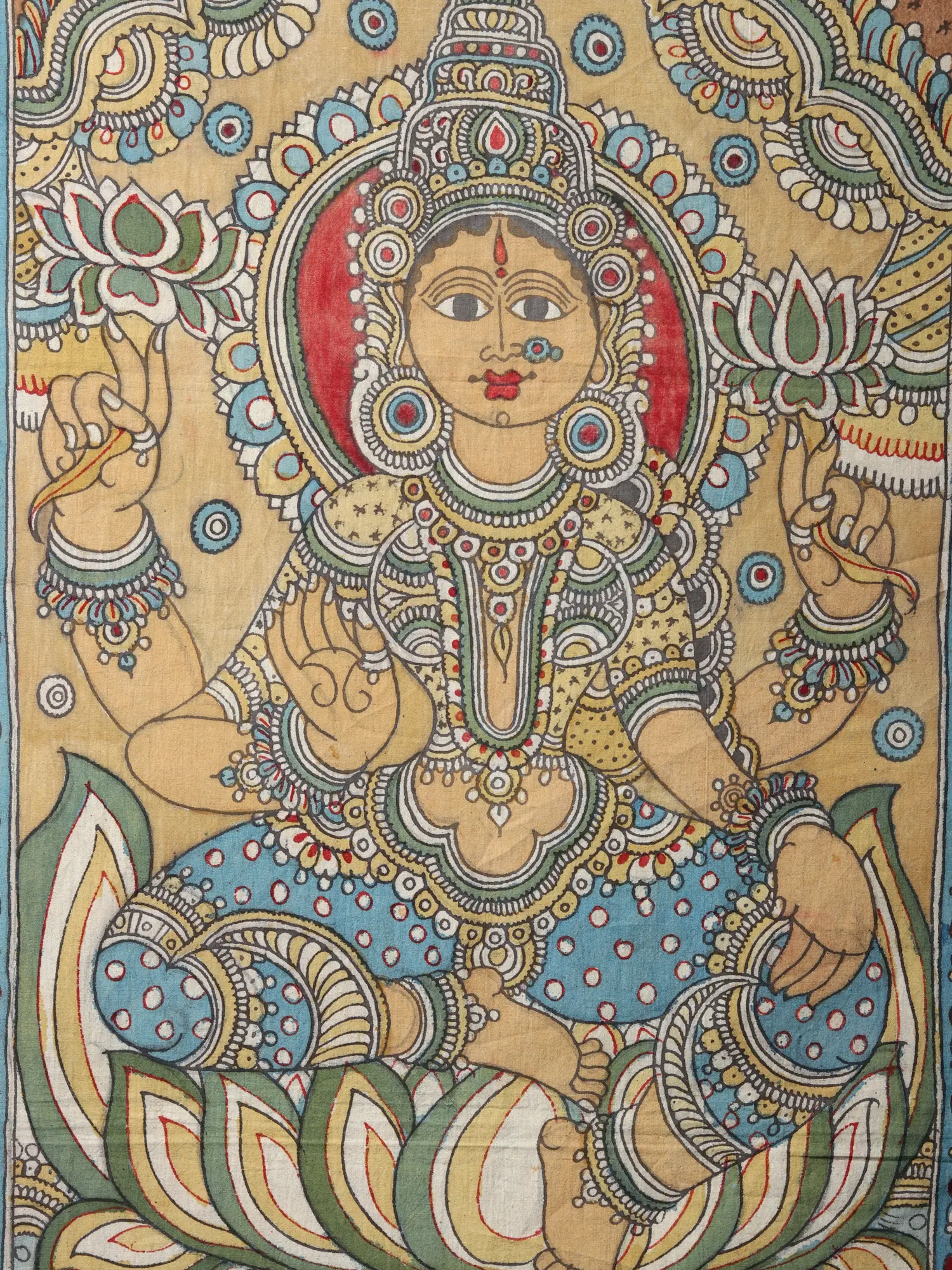 Kalamkari paintings serve as cultural custodians, preserving traditions and making divine imagery accessible through art. The intricate craft breathes life into gods and goddesses, democratizing spirituality. A stellar example is the Kalamkari on cotton portraying Devi Lakshmi seated on a lotus. The meticulous strokes on the canvas not only capture the goddess's divine grace but also contribute to the cultural continuum.