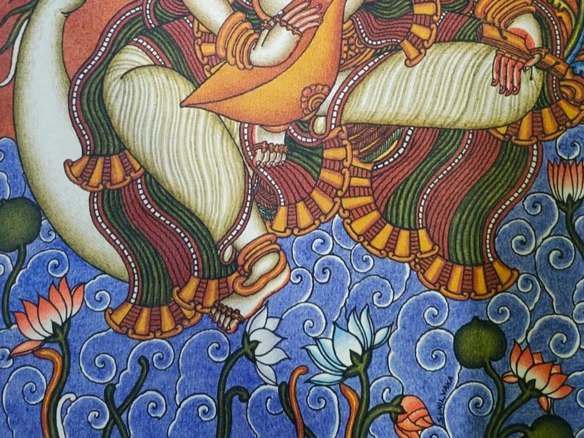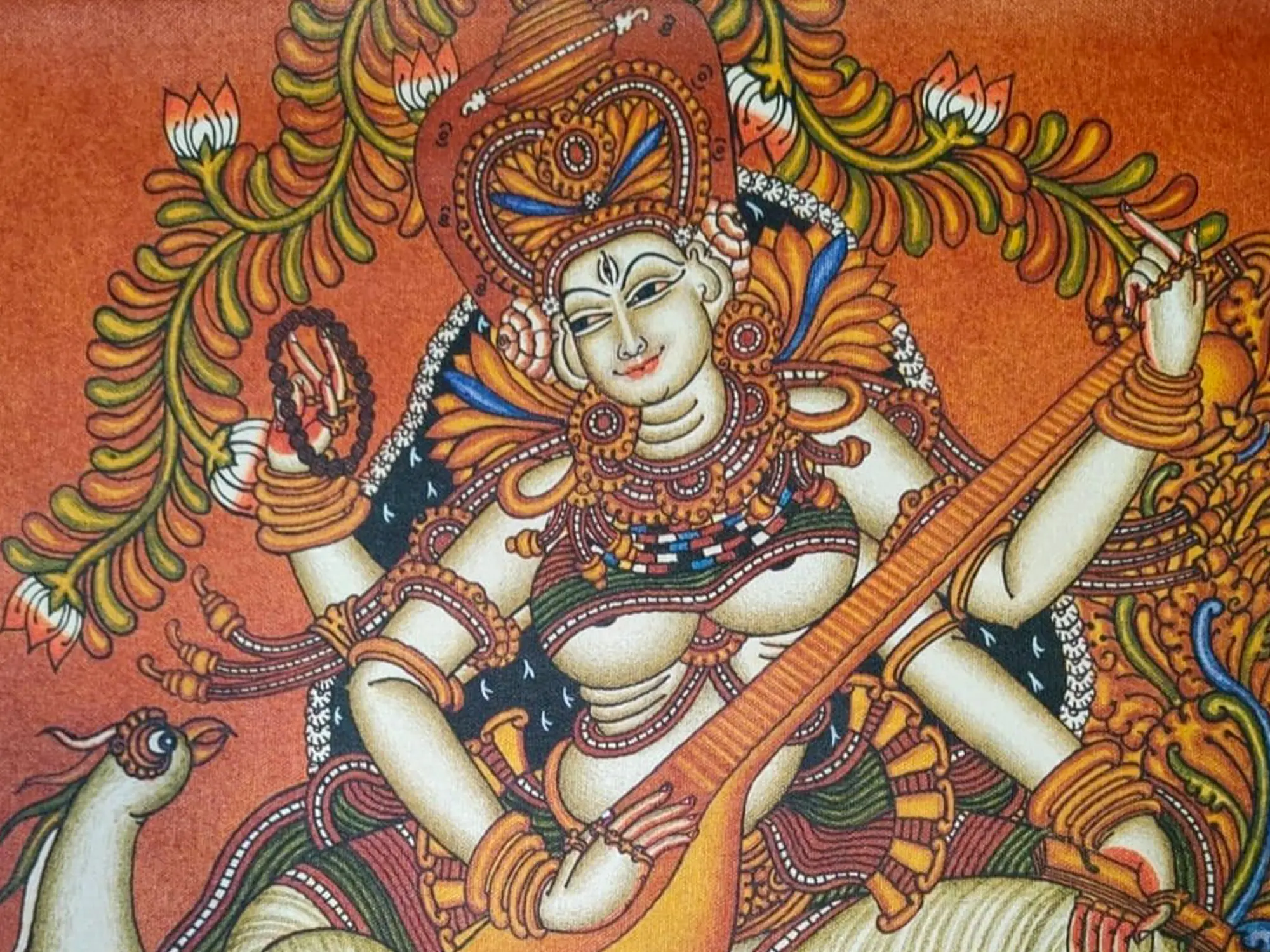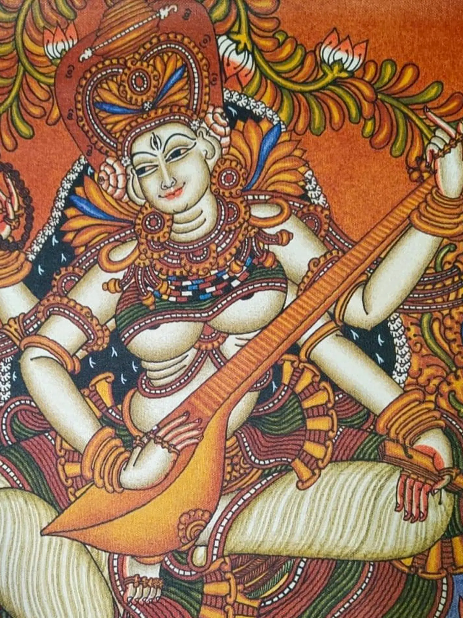 Pay homage to the divine embodiment of wisdom and knowledge with 'Devi Saraswathi'. In this captivating painting, the goddess sits upon her celestial throne, adorned with symbols of learning and enlightenment. With her gentle gaze and serene countenance, she inspires devotees to seek wisdom in all its forms, from the written word to the melodies of the soul. As the colours dance upon the canvas, they invoke the spirit of creativity and inspiration, inviting viewers to embrace the eternal quest for knowledge and understanding.