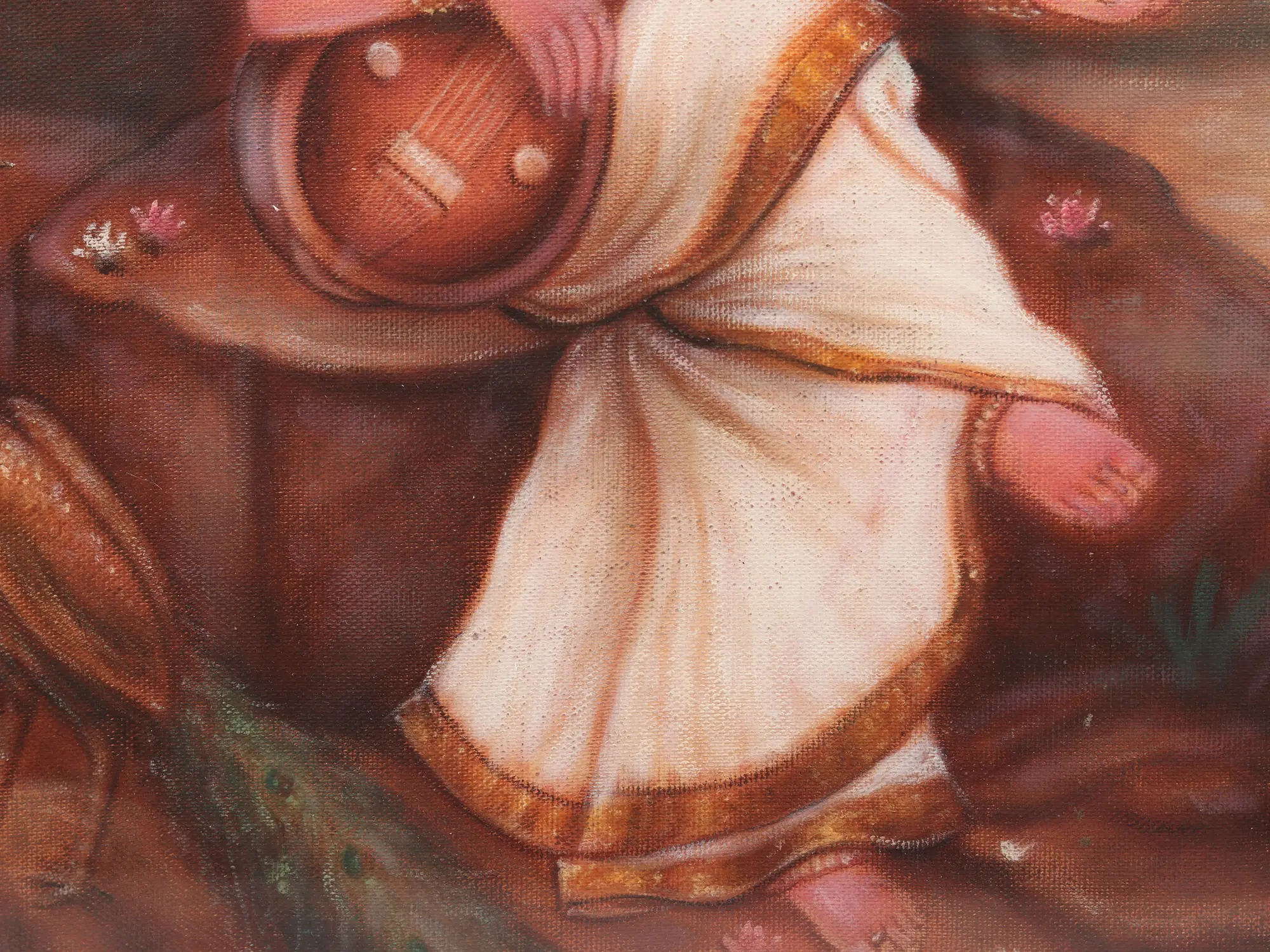 This framed oil painting of Devi Saraswati is a breathtaking rendition inspired by the iconic work of Raja Ravi Varma. Executed with reverence and meticulous detail, the artist pays homage to the classical style while infusing a contemporary touch. The traditional oil painting technique used in this masterpiece elevates the canvas, creating a luminous portrayal of the Hindu goddess of knowledge and the arts. Devi Saraswati, resplendent in vibrant hues, radiates a divine aura as she sits gracefully with her veena.