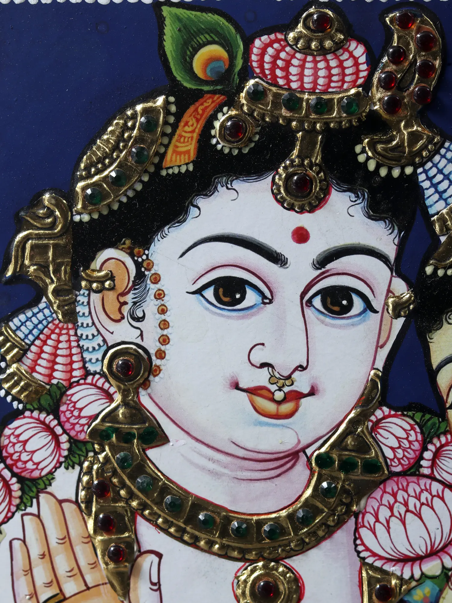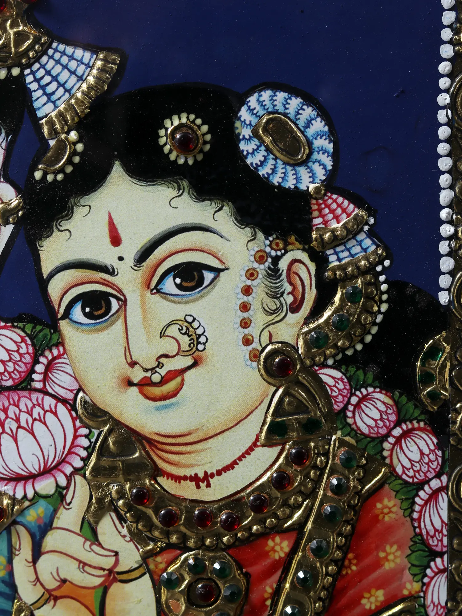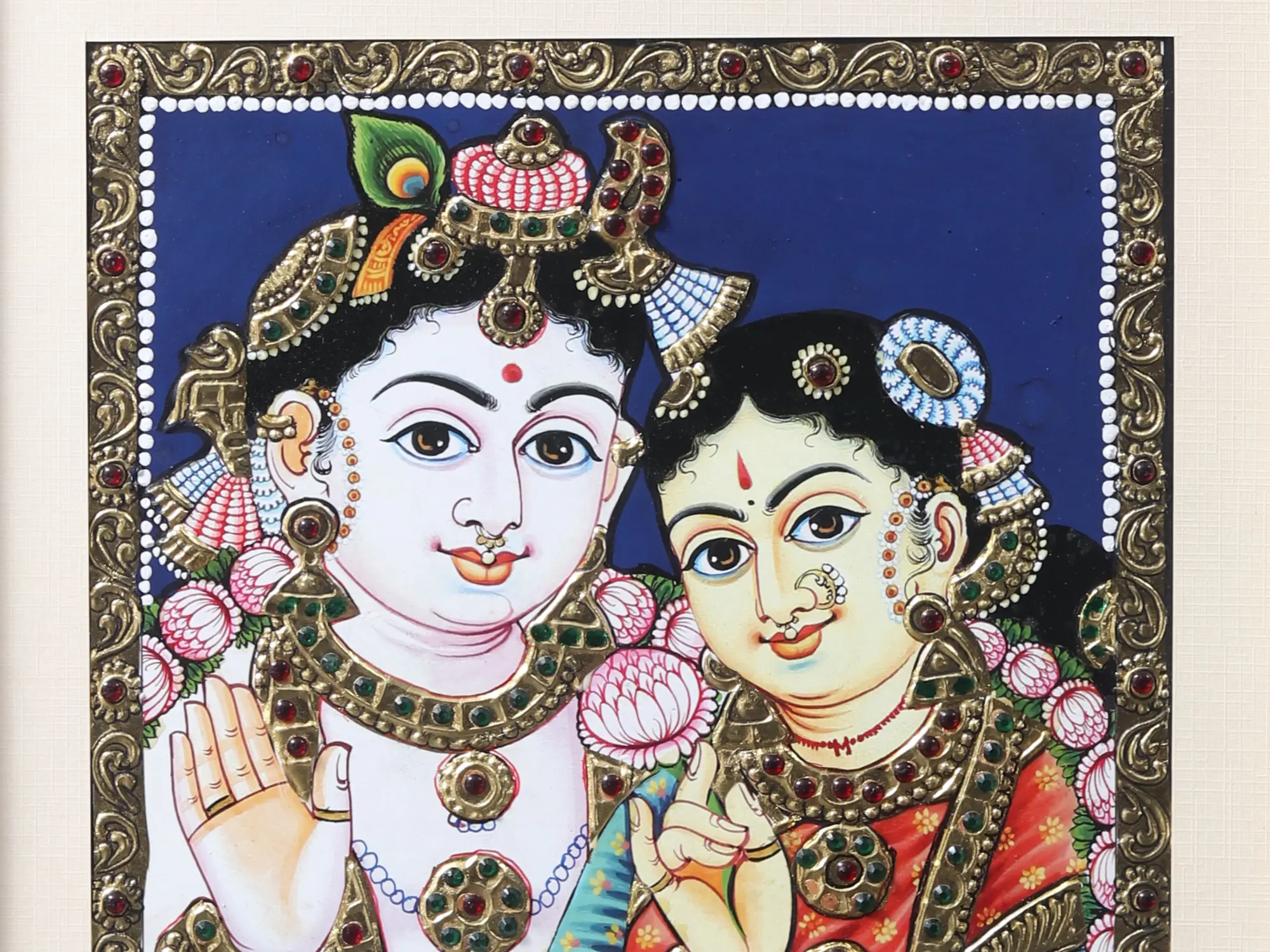 The divine pair, Radha and Krishna, embodying love's quintessence, grace this Tanjore painting, framed in exquisite beauty. Their eternal love story is etched in every stroke, and the golden accents symbolise the radiance of their love. As you behold this creation, you are invited to witness the eternal dance of Radha and Krishna, a love story that transcends time and space. Let their divine love inspire and uplift your soul.