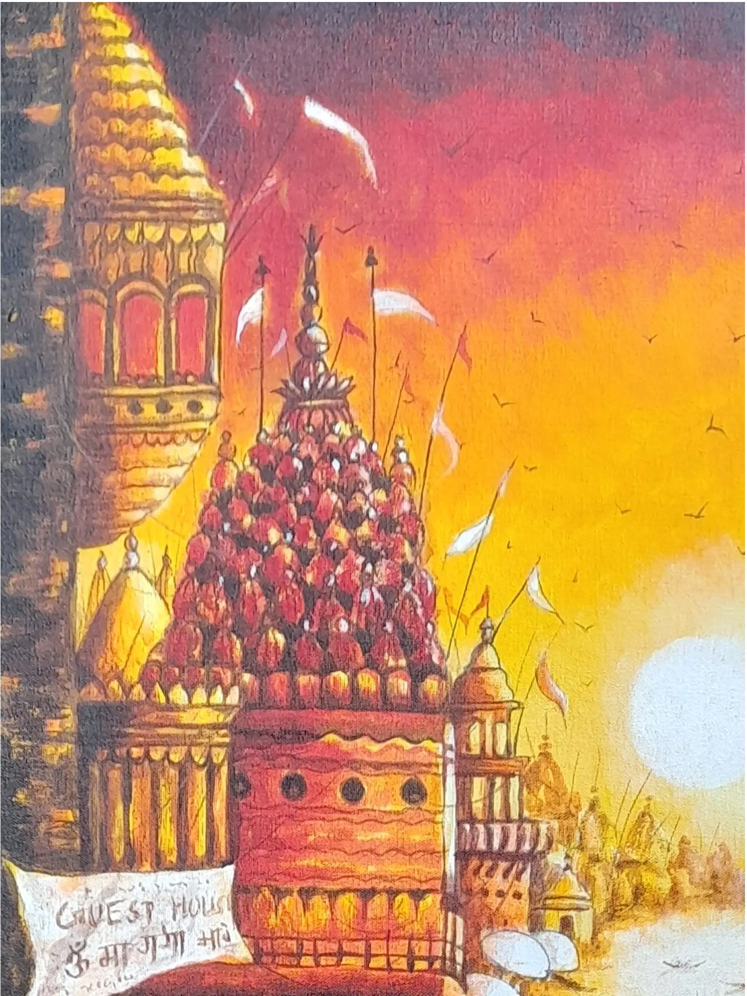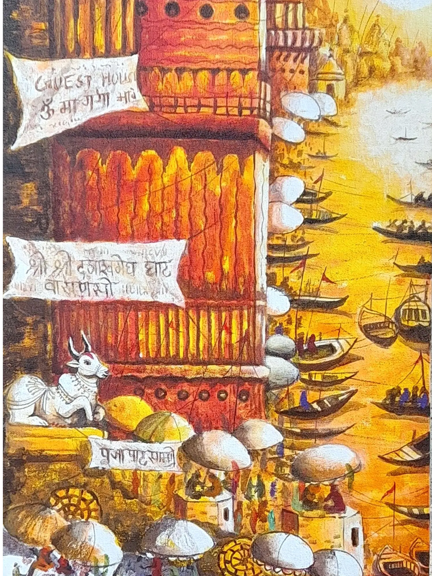 Each stroke of acrylic on this expansive canvas is a testament to the artist’s profound connection to his subject. The rich textures and luminous colors are meticulously built up, revealing the depth and complexity of the scene. You will appreciate the careful attention to detail, from the architectural grandeur of the ghats to the intimate portrayal of the devotees.