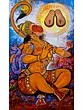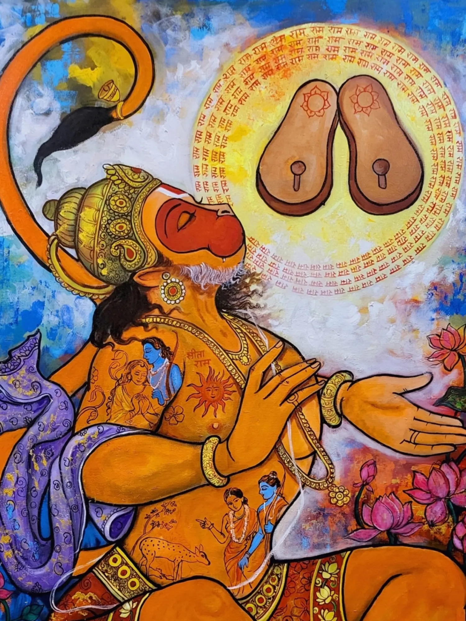 This striking artwork captures the essence of Hanuman, the mighty Vanara (monkey-god) revered in Hinduism for his unparalleled devotion, strength, and unwavering loyalty to Lord Rama. The painting is a vibrant tapestry of color and symbolism, inviting the viewer into a world where the divine and the earthly intertwine. Hanuman, depicted in a posture of reverence, embodies humility and unwavering faith. The artist masterfully portrays Hanuman's iconic features – his monkey-like face, powerful physique, and the symbolic gada (mace), a representation of his strength and valor. The use of acrylics on canvas brings a rich texture and depth to the artwork, enhancing the dynamic energy that radiates from the subject. The artist also depicts the padukas of Rama in the sky, thus symbolizing His presence.