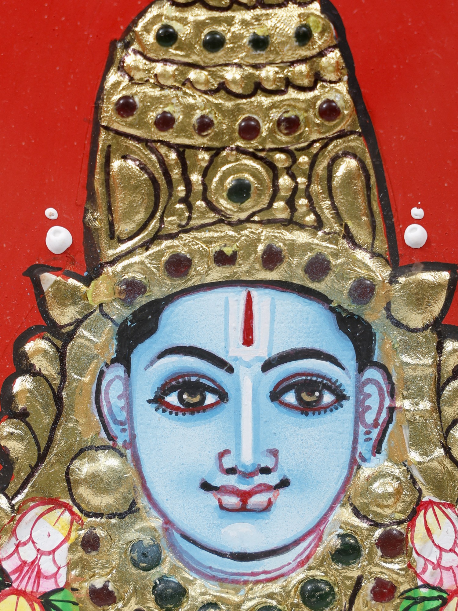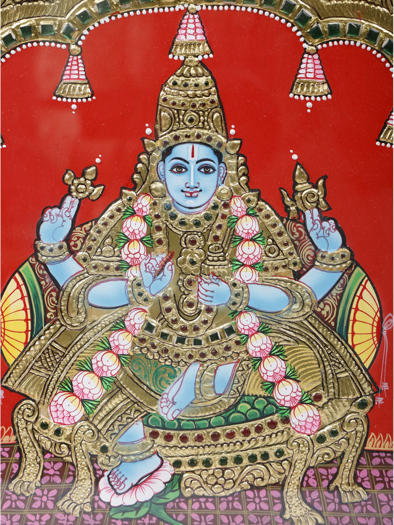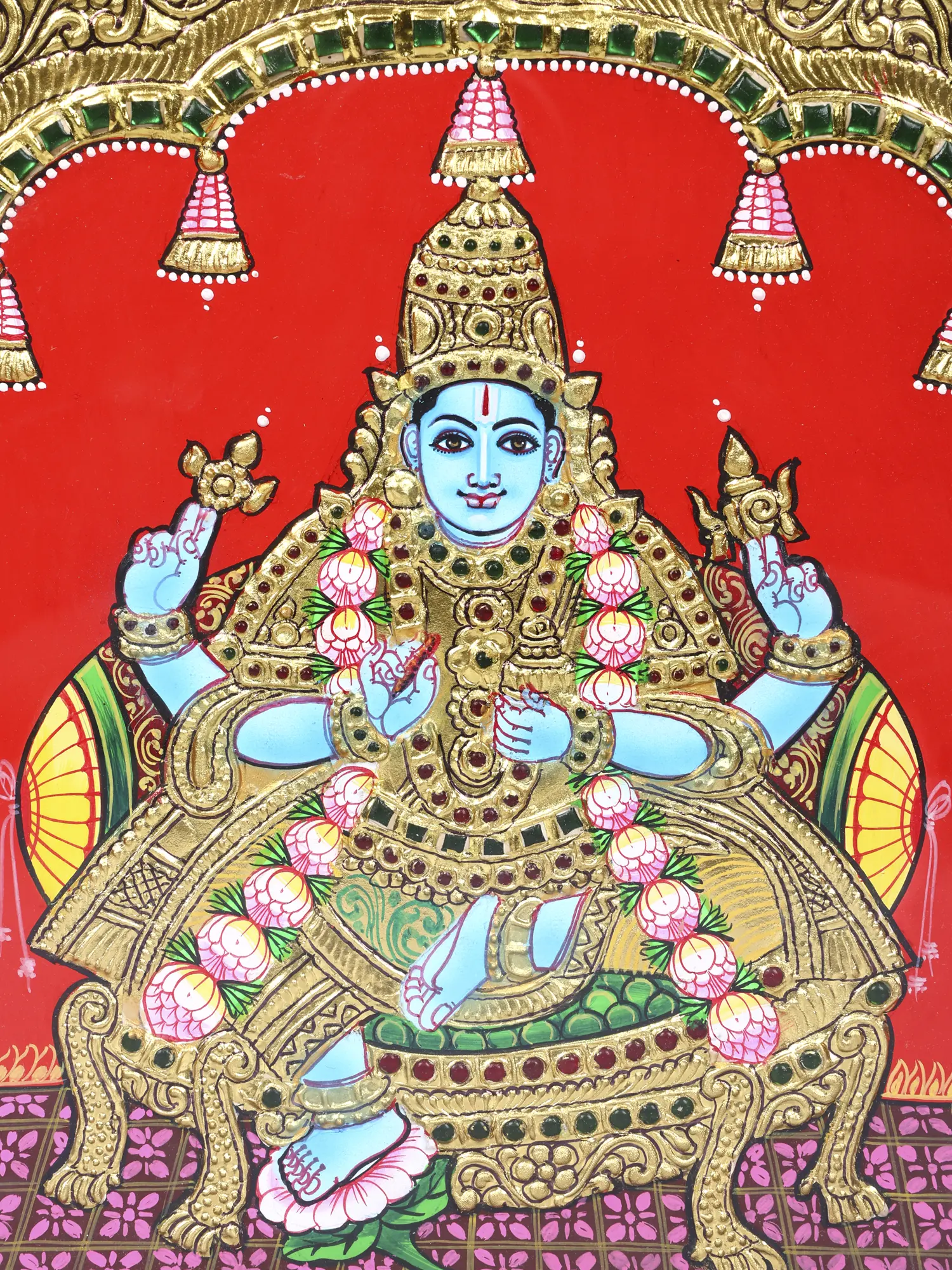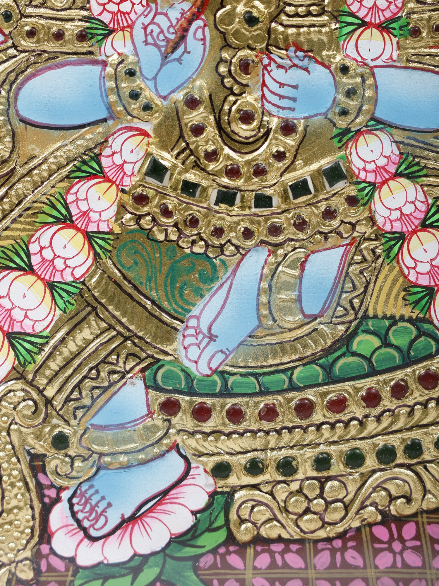 Each detail of the painting is embellished with 22-karat gold, enhancing the rich textures and luminosity, encased in a wooden frame making this a portable shrine of Dhanavantari.