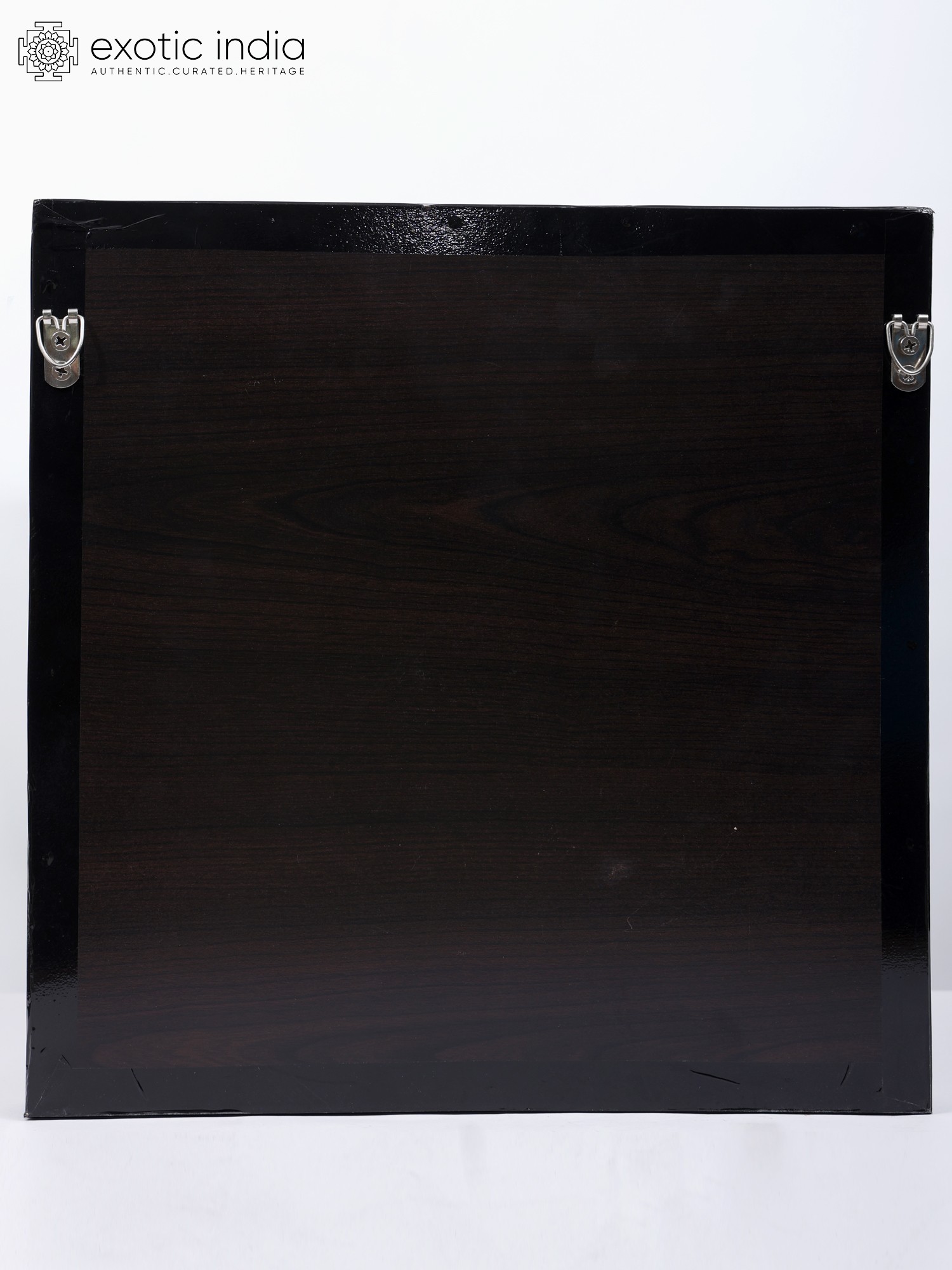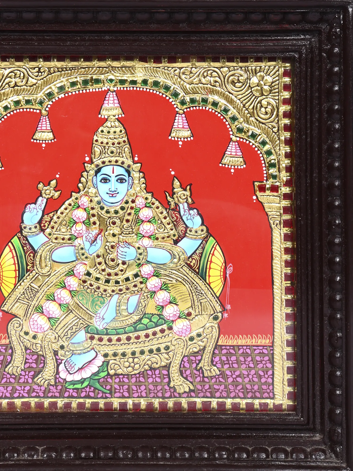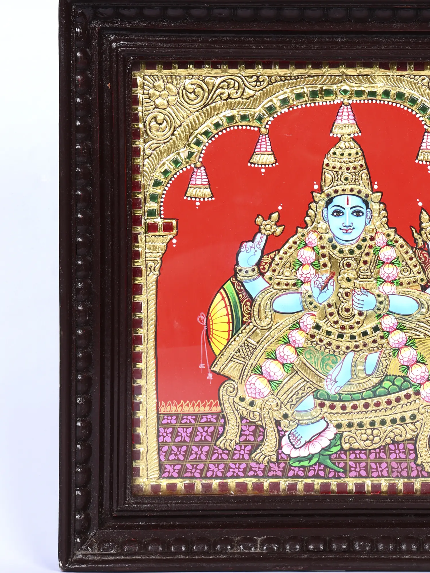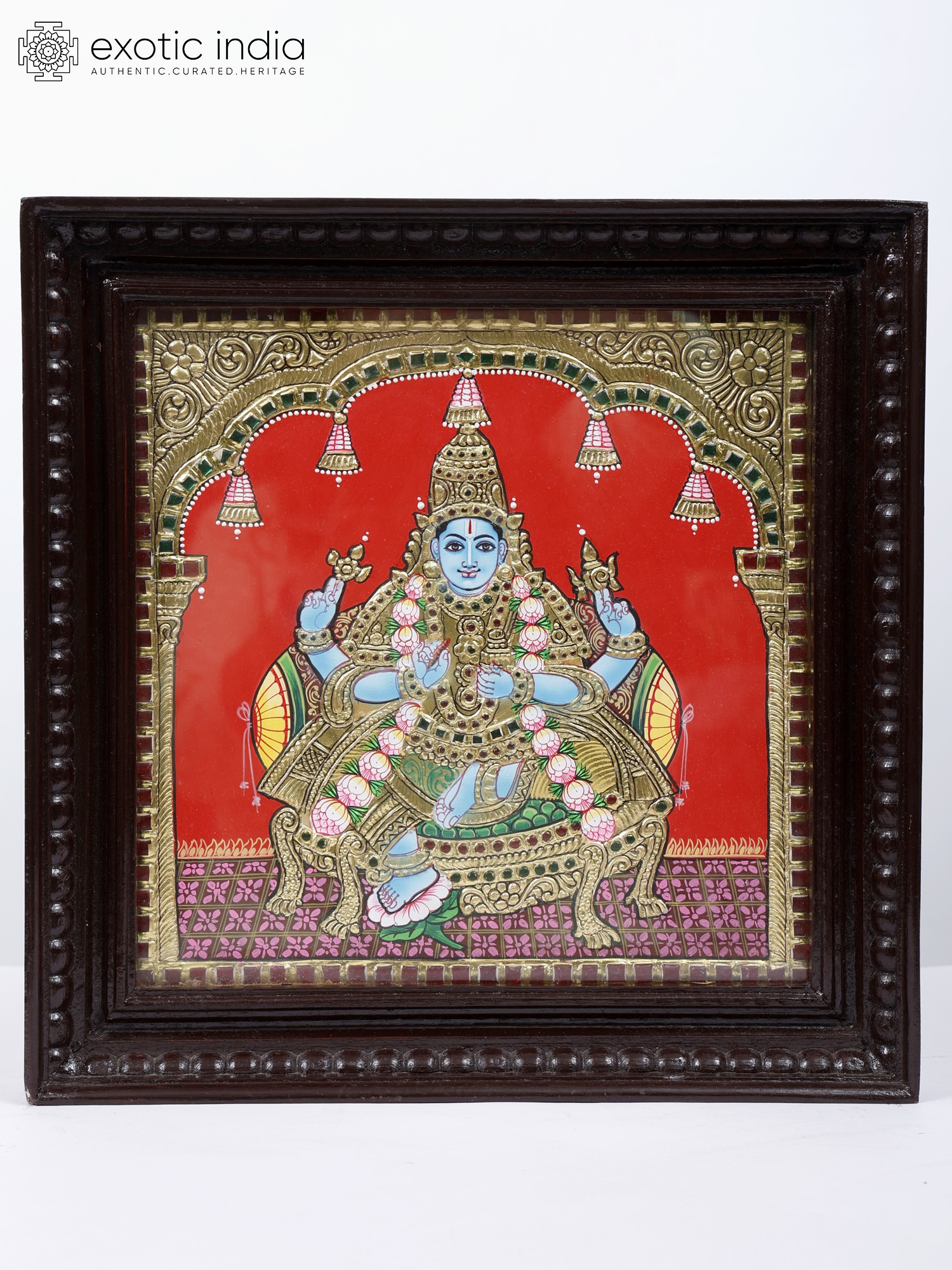 Each detail of the painting is embellished with 22-karat gold, enhancing the rich textures and luminosity, encased in a wooden frame making this a portable shrine of Dhanavantari.