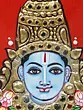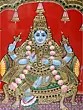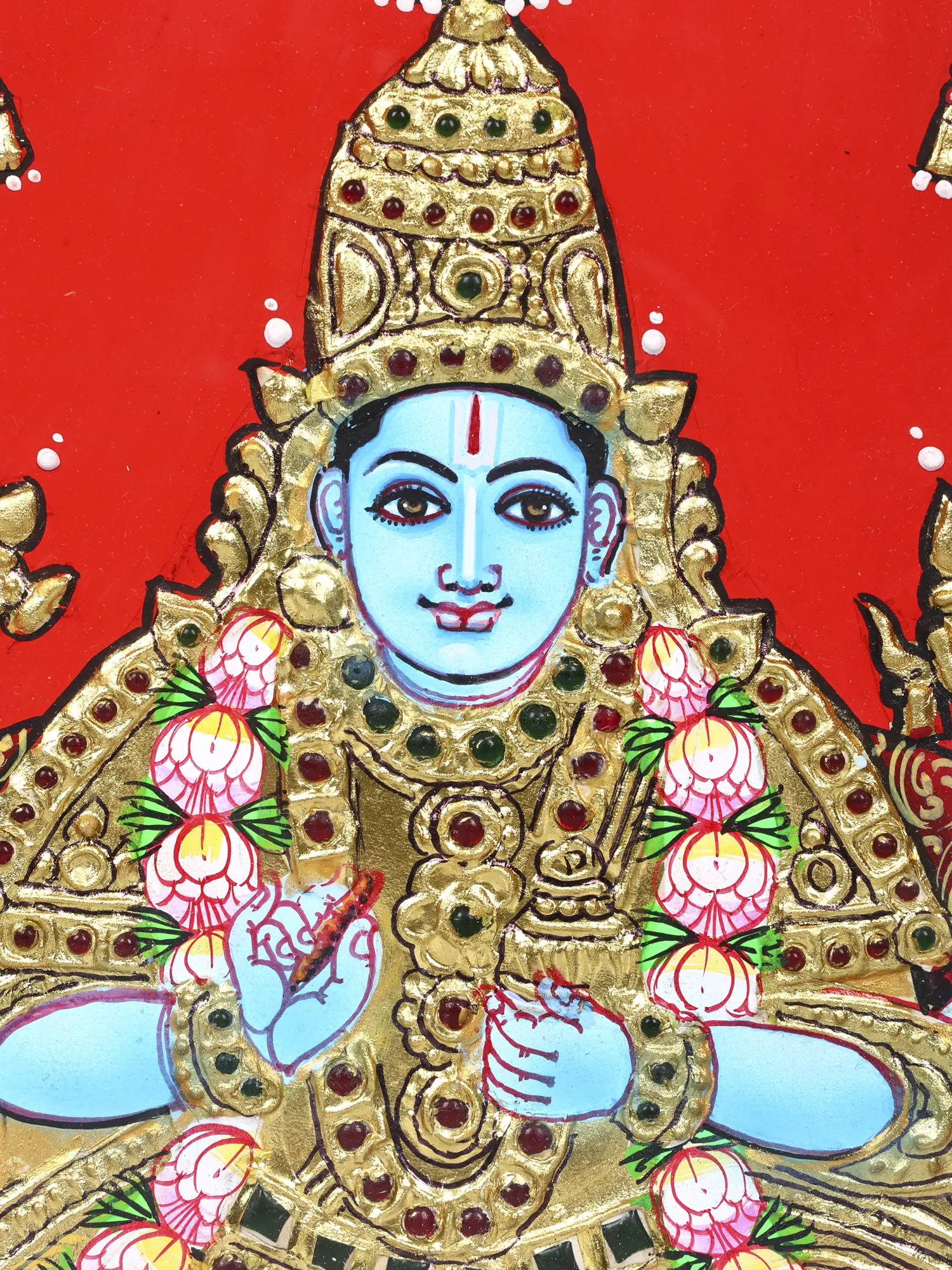 With his blue skin and royal attire, Dhanvantari embodies the splendor of Lord Vishnu, enthroned on a royal throne against a rich red background.