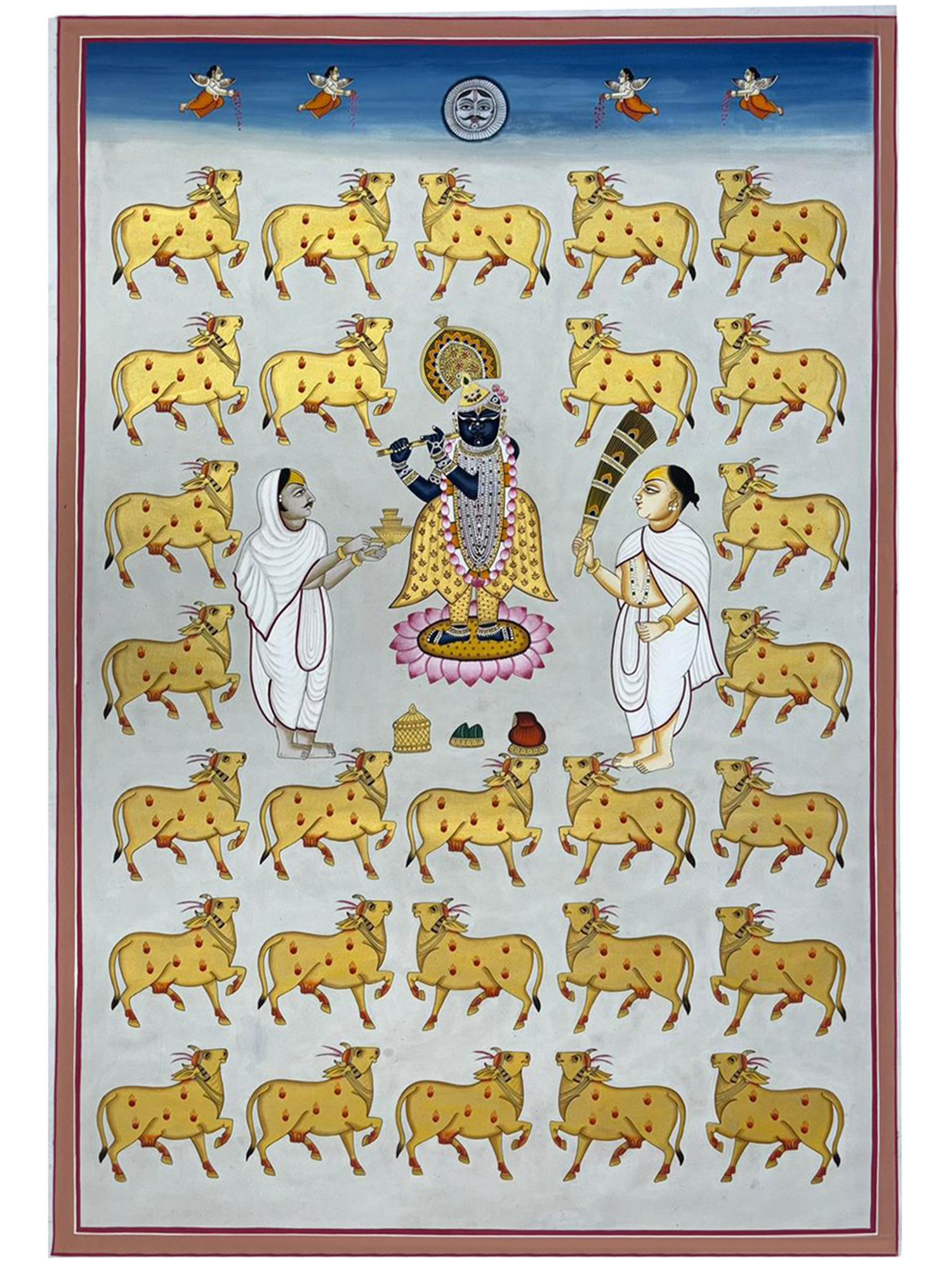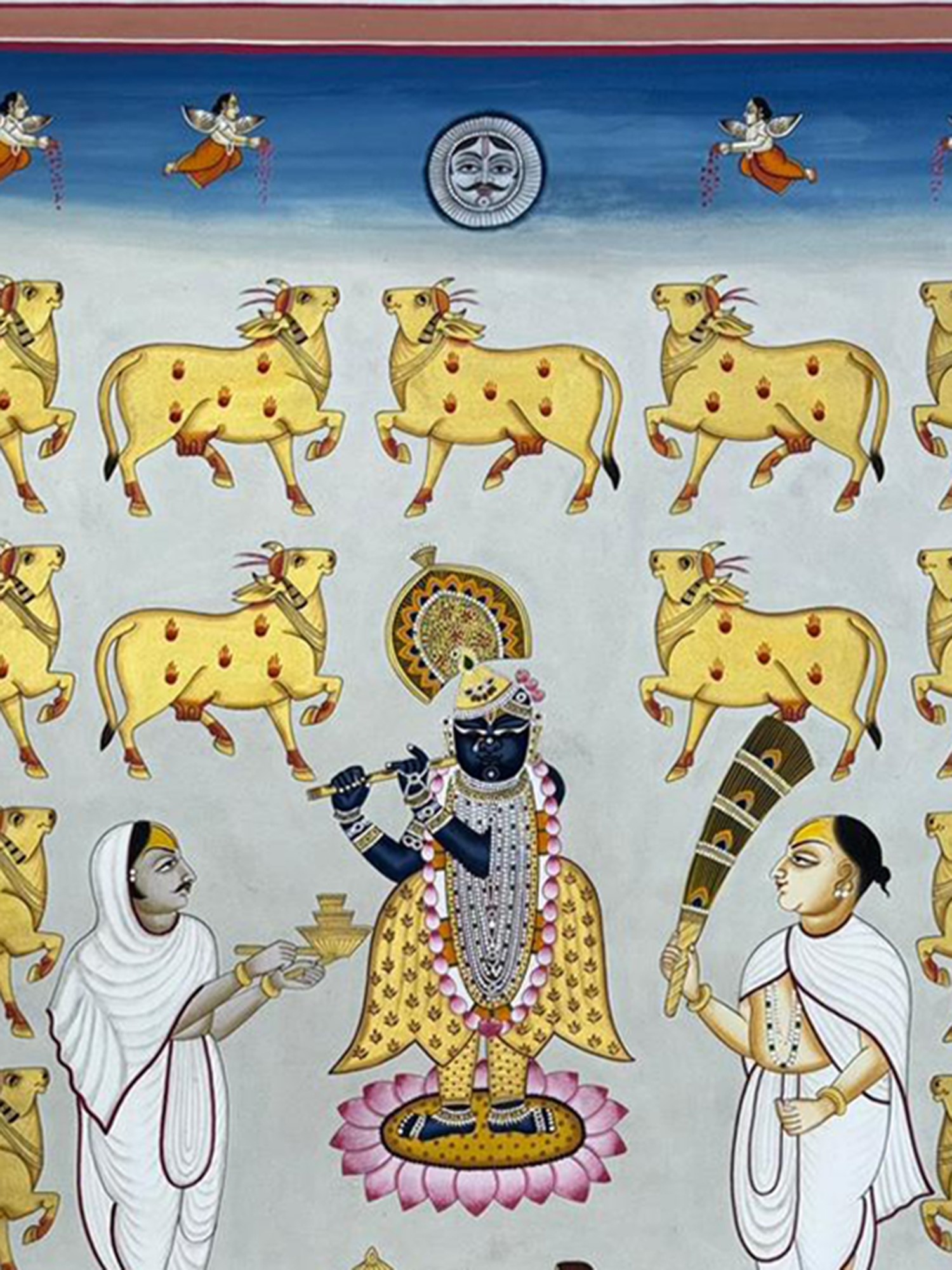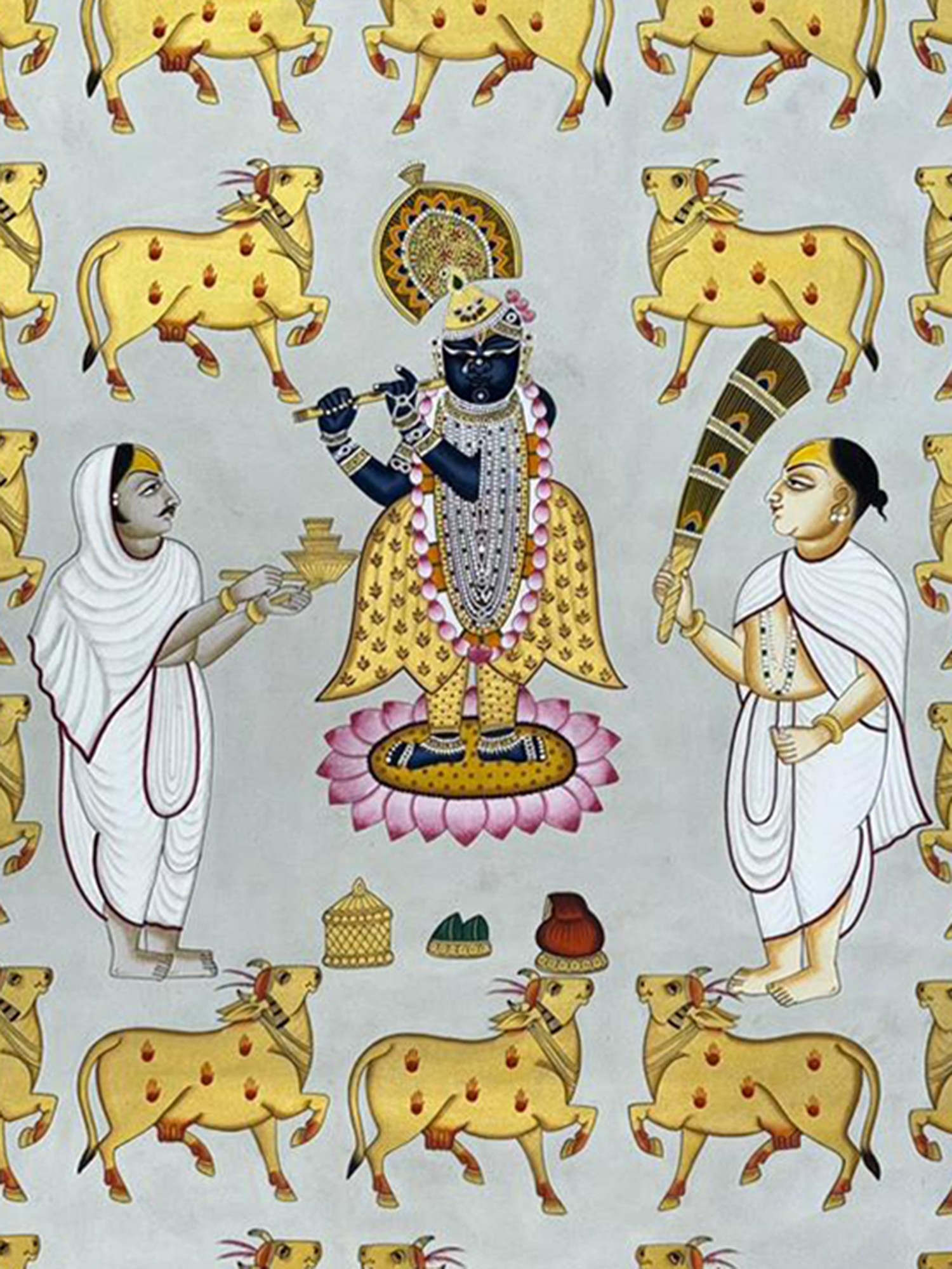 Features Lord Shrinathji, a revered form of Krishna, accompanied by his sacred cows.