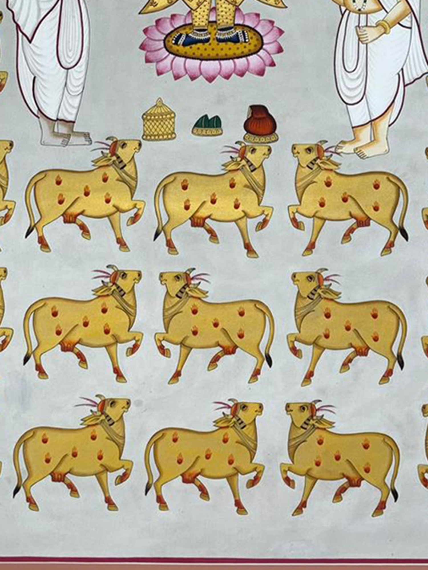 Showcases the traditional Pichwai painting style with intricate detailing and vibrant colors.
