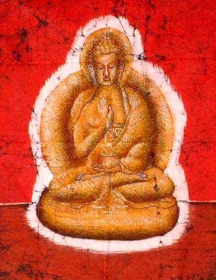 The ochre of the Buddha's image is segregated from the blood red background by a beige aura. In batik, there is greater harmony of colour than in painting, due to the fact that each colour is dyed over the precious one, and in this manner they become more closely related.