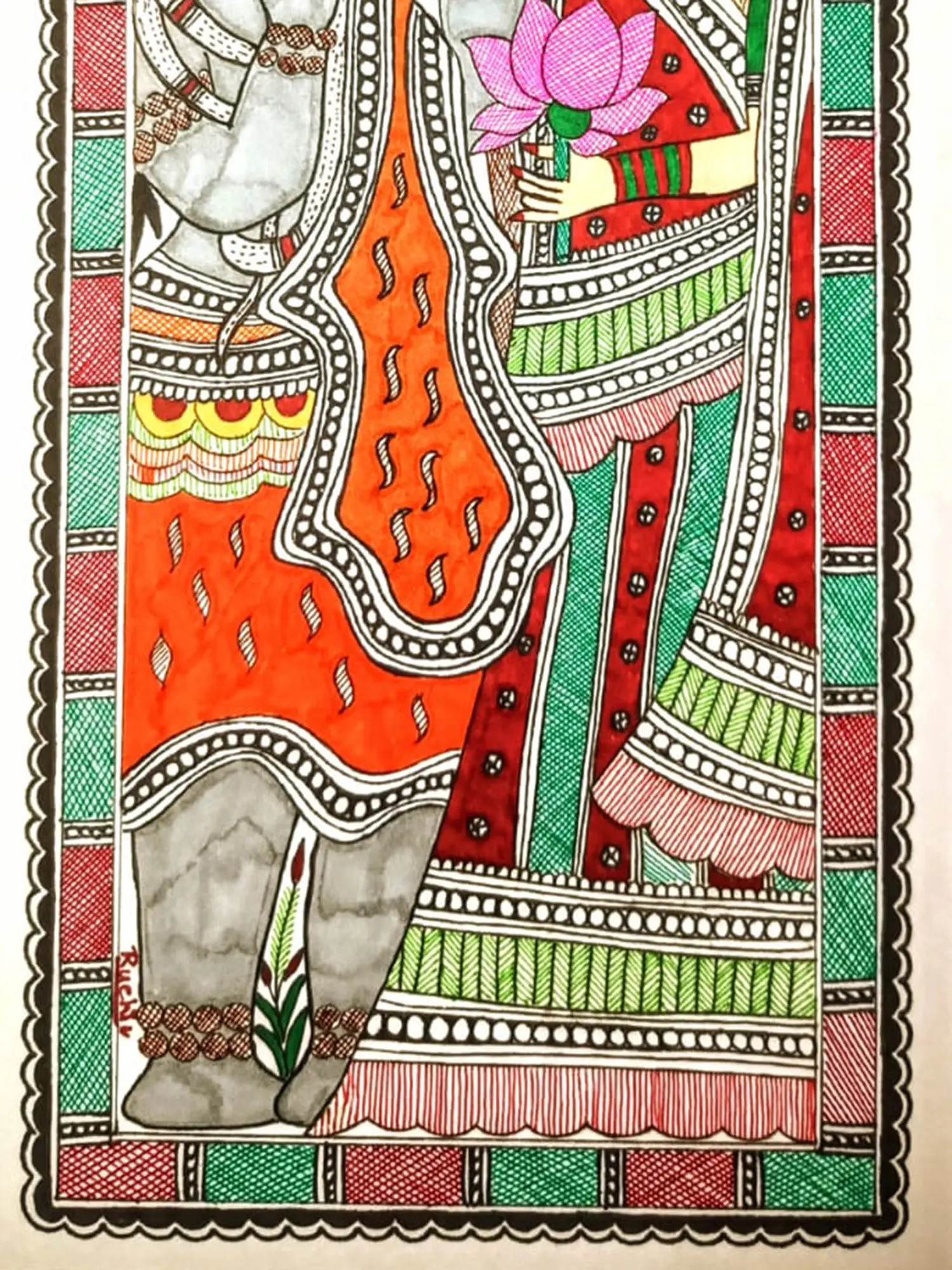 Divine Couple Radha Krishna - Madhubani Painting | Alcohol Markers and Fineliners on Paper | by Ruchi