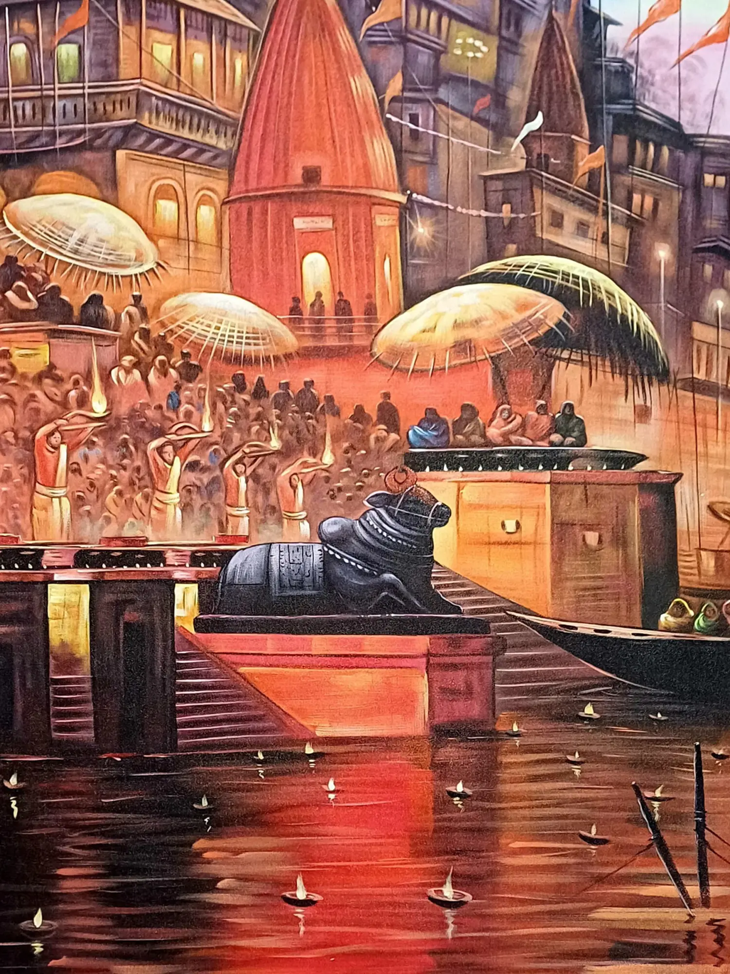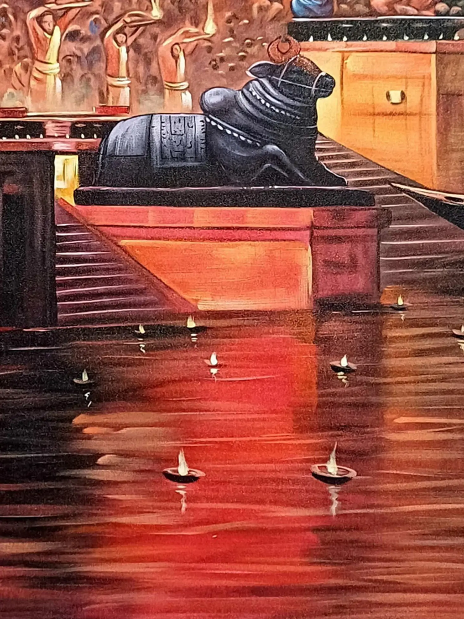 This scene draws inspiration from the ancient city of Varanasi, one of the oldest continually inhabited cities in the world and a spiritual epicenter for Hindus. The presence of the Nandi bull statue, a sacred vehicle of Lord Shiva, and the ritualistic offering of lamps to the sacred river, evoke a deep sense of timeless tradition and devotion. It serves as a visual narrative of the enduring spiritual practices that have shaped this sacred landscape for millennia.