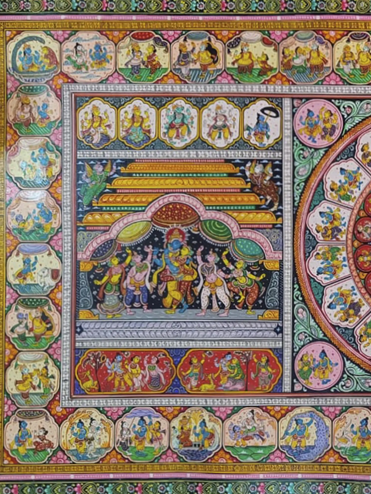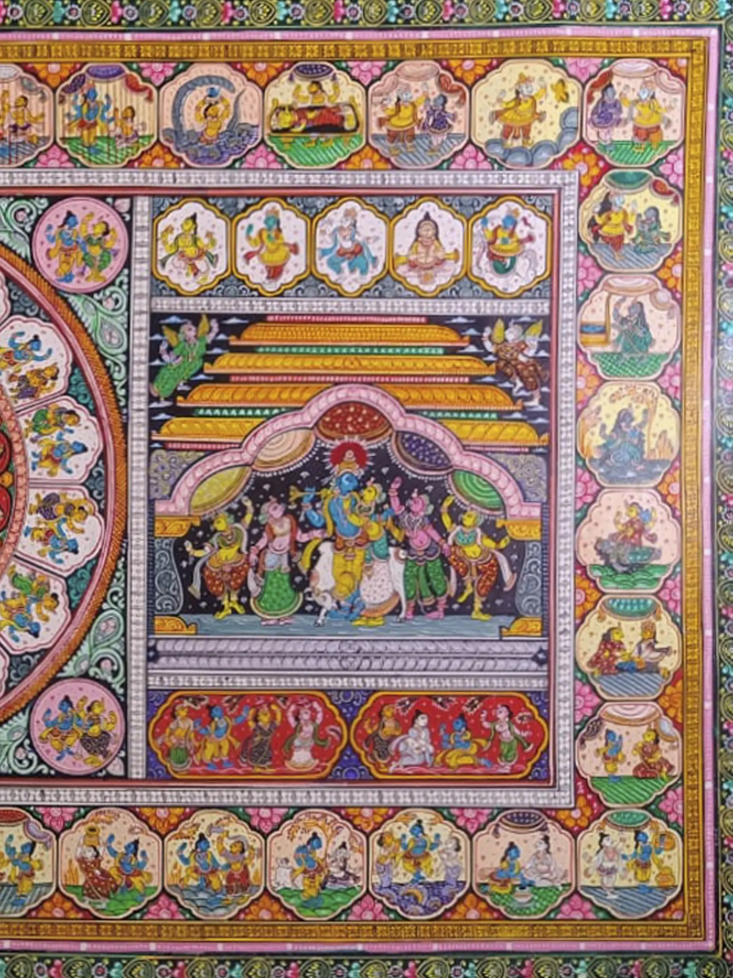 This work draws inspiration from the rich tapestry of Hindu mythology, specifically the life and exploits of Lord Krishna, a central deity revered for his divine wisdom, love, and playful nature. It captures the essence of traditional Indian miniature painting techniques, preserving a cultural heritage that spans centuries. The circular arrangements often symbolize the cyclical nature of time and the eternal presence of the divine.