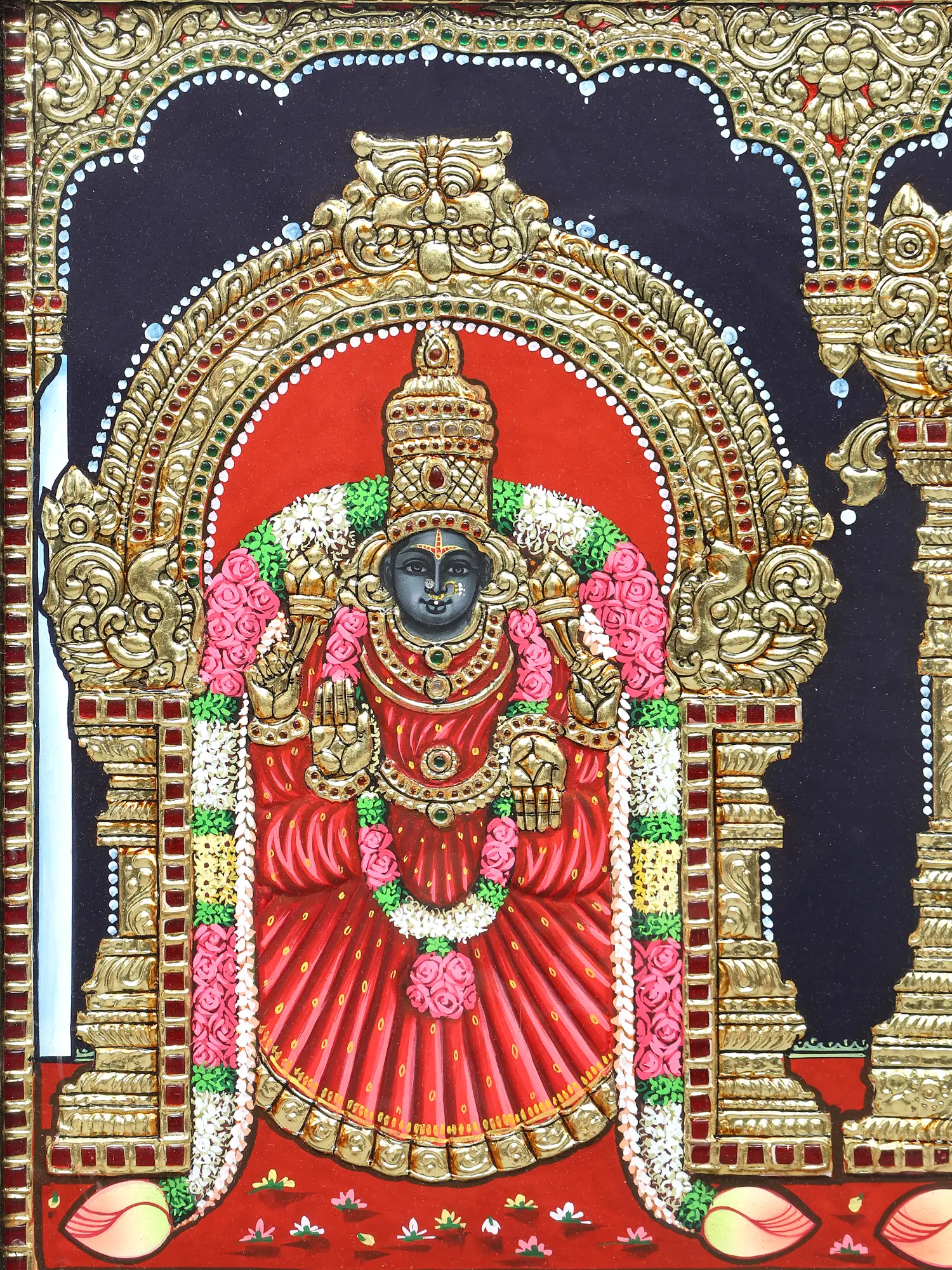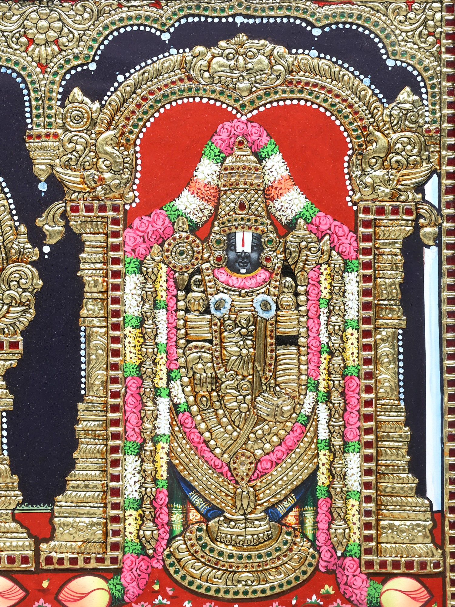Tanjore Painting Of Standing Lord Tirupati Balaji With Embossing Work | Traditional Colors With 24K Gold | Teakwood Frame