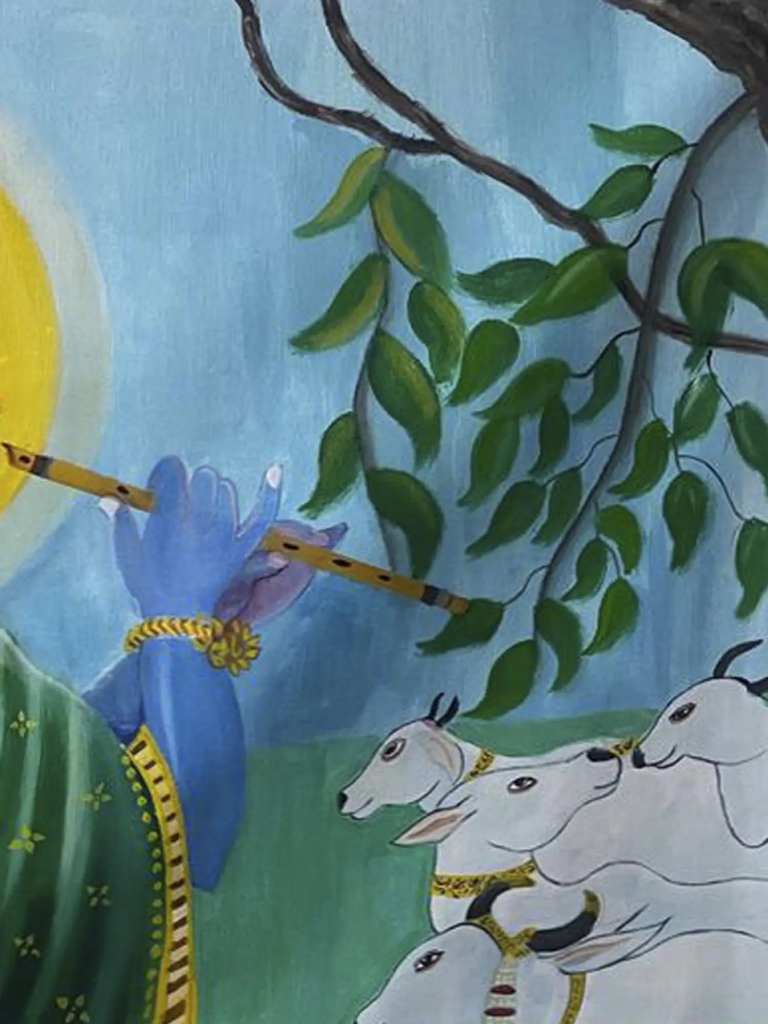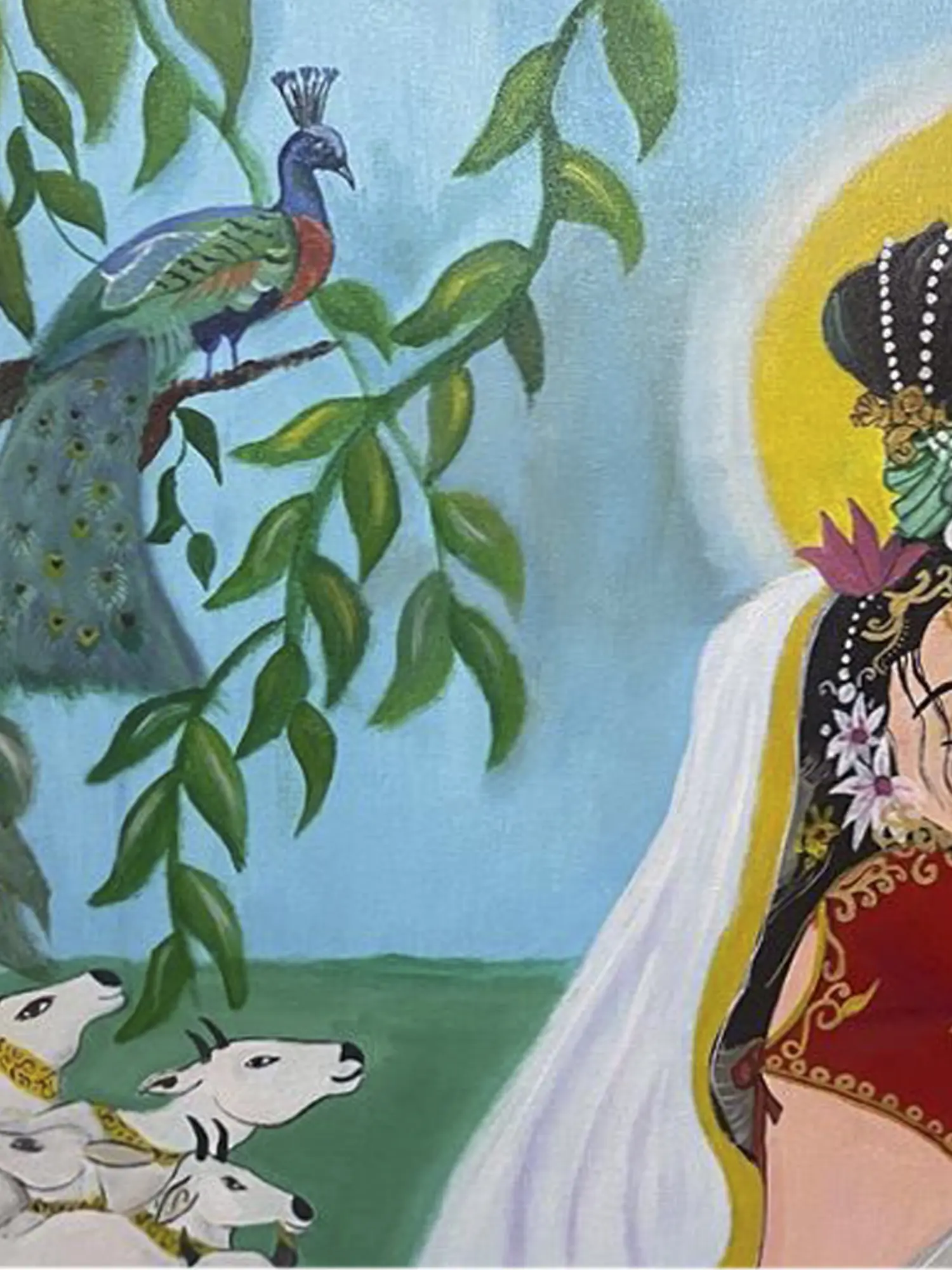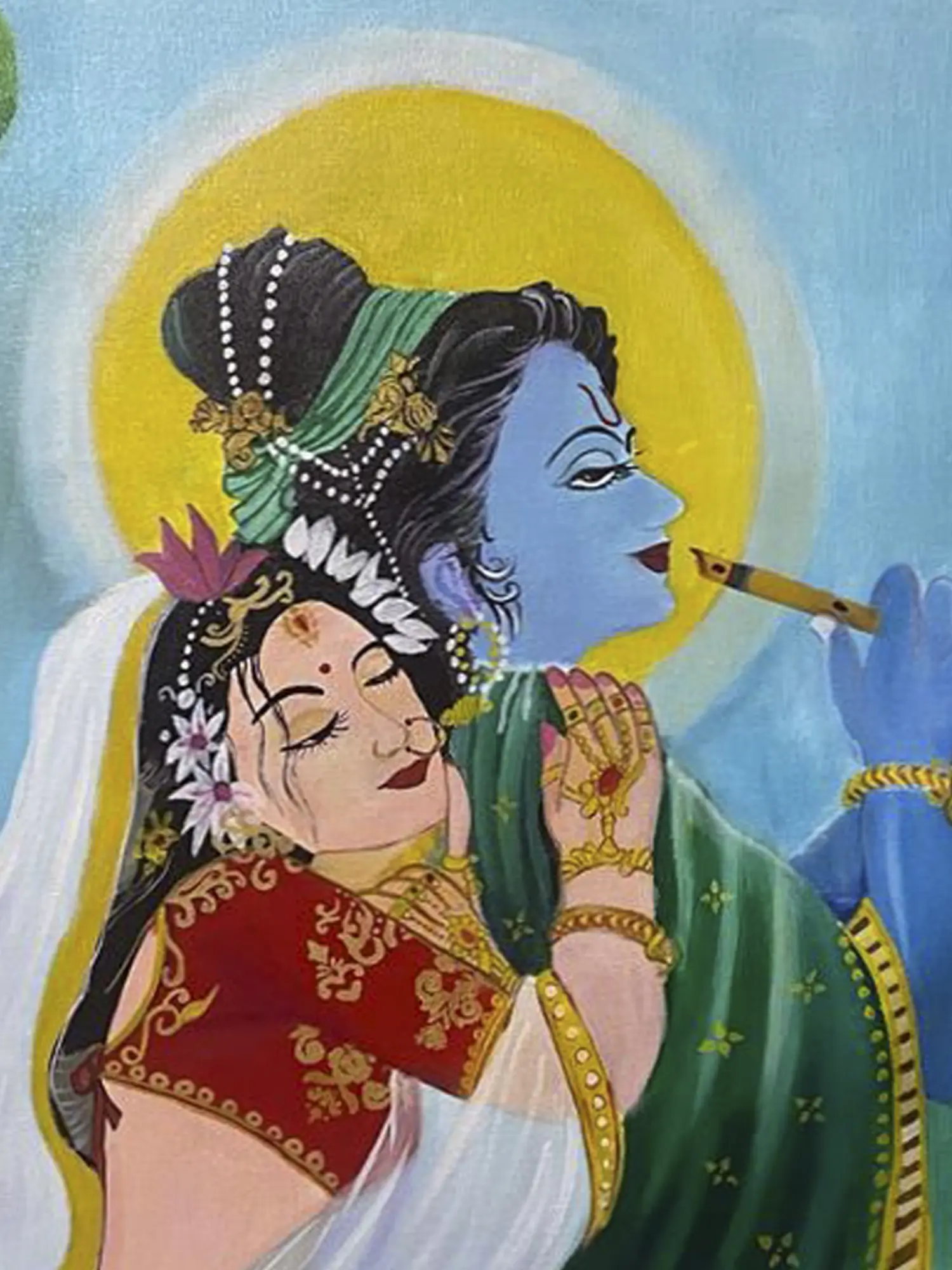 ethereal hues, the artwork captures Radha's adoration and Krishna's divine