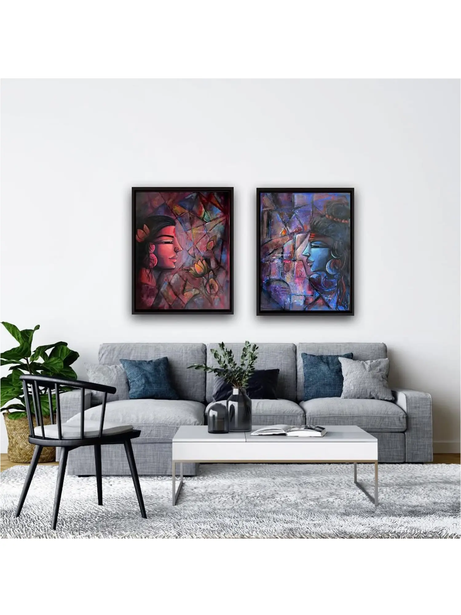 The striking profiles of Lord Shiva and Goddess Parvati are presented with a modern, almost cubist sensibility, yet they retain an undeniable spiritual presence. You'll be drawn to the interplay of bold lines and textured layers, which lend a dynamic energy to the composition. The artist’s sensitive use of color, from deep earth tones to ethereal blues and purples, evokes the divine aura of these revered deities. The overall dimensions of each canvas are 17 inches in height and 22 inches in width, offering a substantial yet versatile presence.