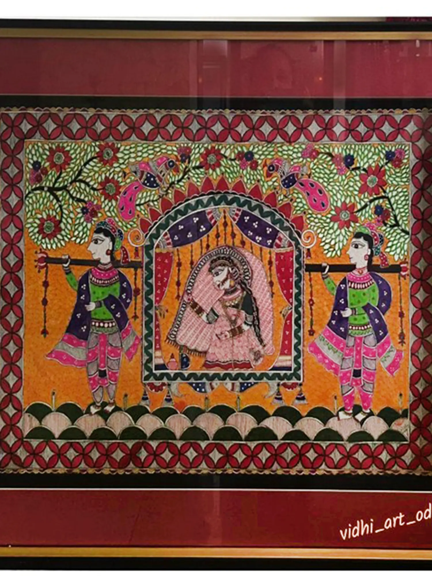 This exquisite acrylic painting on canvas is a vibrant testament to the rich cultural heritage of Mithila art, a traditional art form originating from the Mithila region of India and Nepal. The artwork depicts a Doli Kahar, a palanquin carried by attendants, a motif deeply rooted in Indian traditions and often symbolizing journeys, celebrations, and the passage of significant life events. The meticulous detail and bold colors employed by artist Vidhi Joshi transport the viewer to a scene steeped in cultural narrative and artistic mastery. The central figures are presented within an ornate canopy, hinting at a procession or a sacred ritual. The figures carrying the palanquin are adorned in traditional attire, their forms stylized in the characteristic Mithila manner. The surrounding foliage, rendered with intricate patterns and vibrant flora, evokes a sense of natural abundance and the auspiciousness associated with such ceremonies. The composition is a harmonious blend of figurative elements and decorative motifs, a hallmark of Mithila paintings. The intricate borders, featuring repeating patterns of flowers and geometric designs, add depth and frame the central narrative beautifully, drawing the eye to the heart of the artwork.