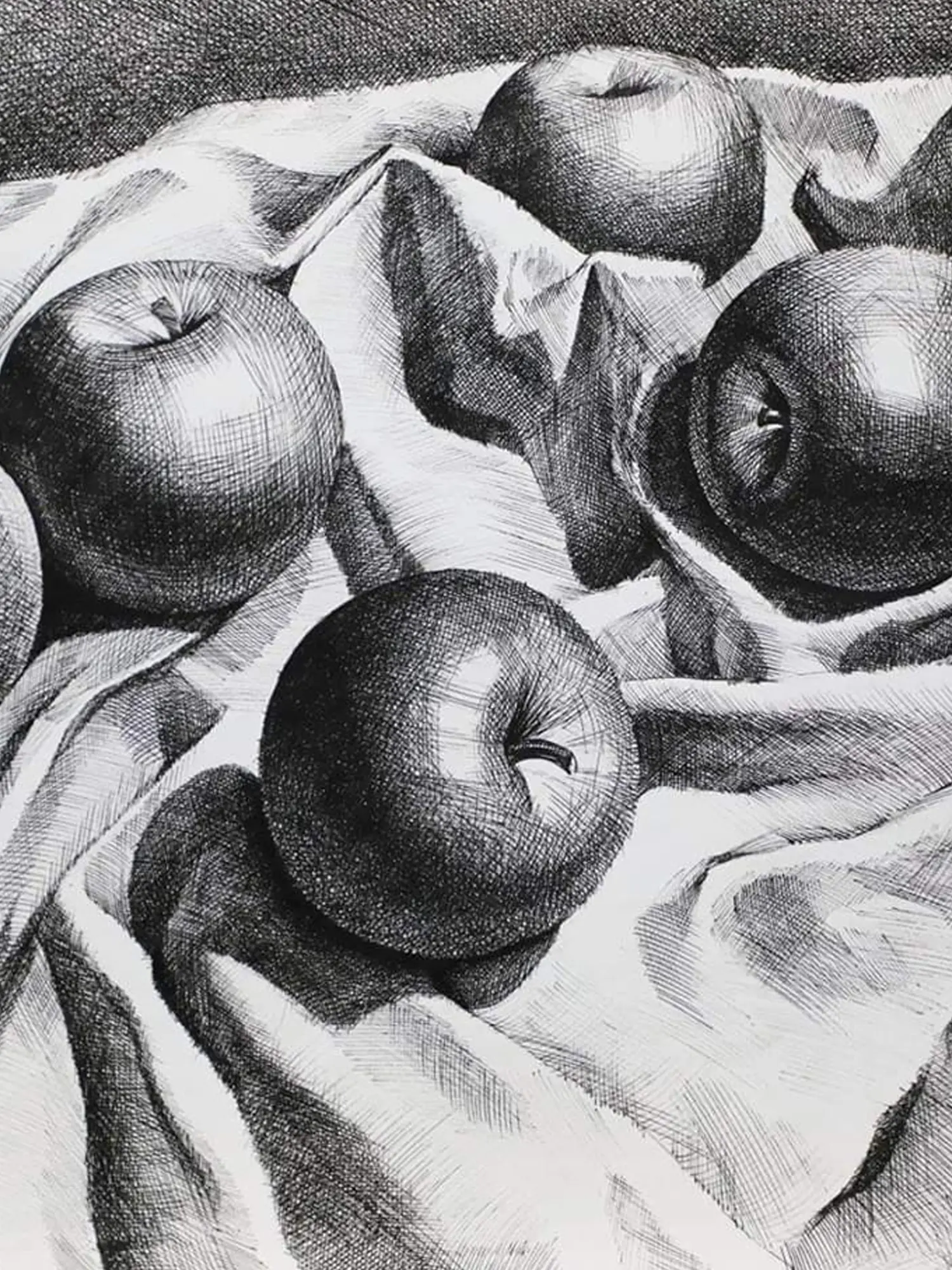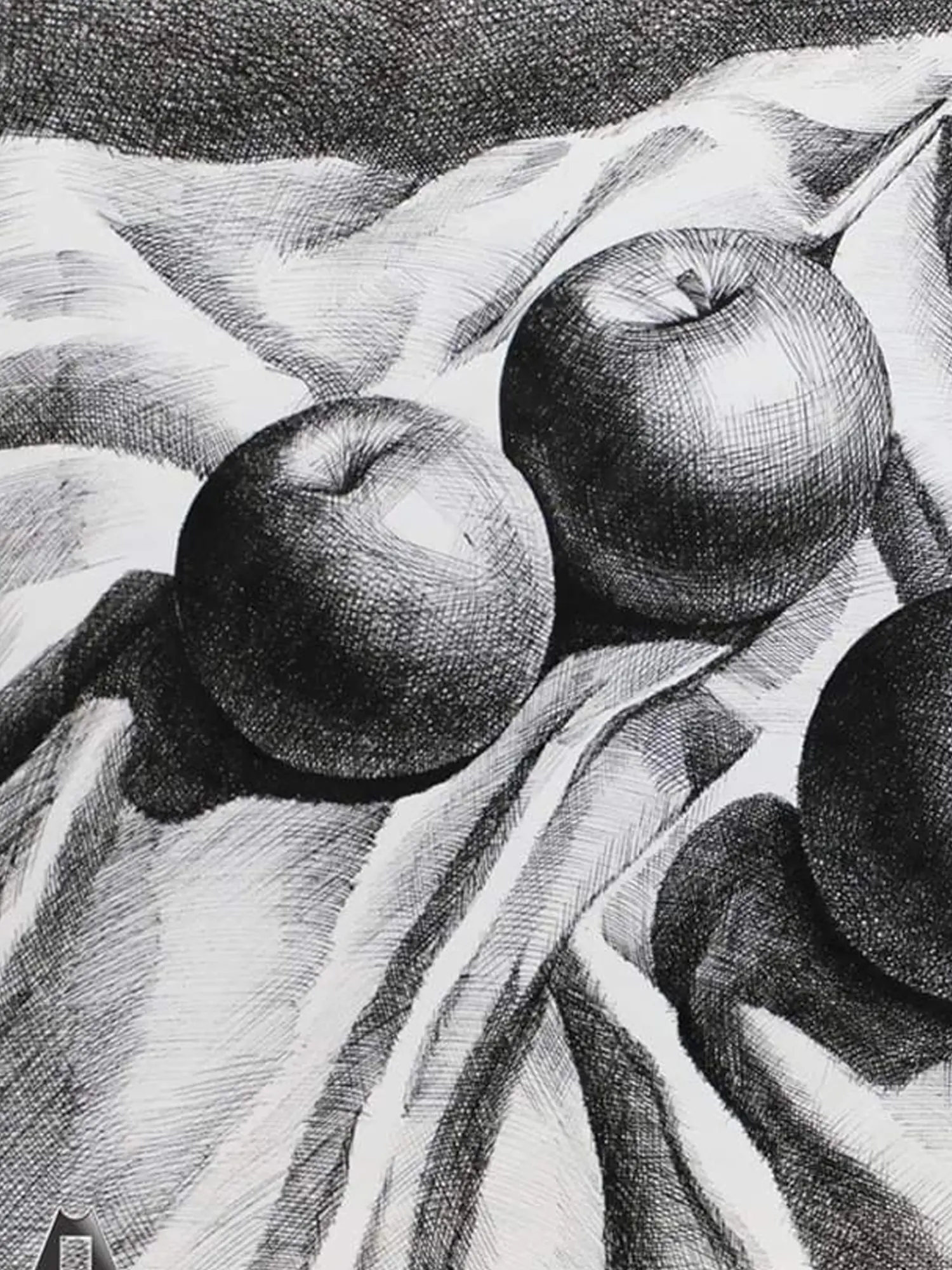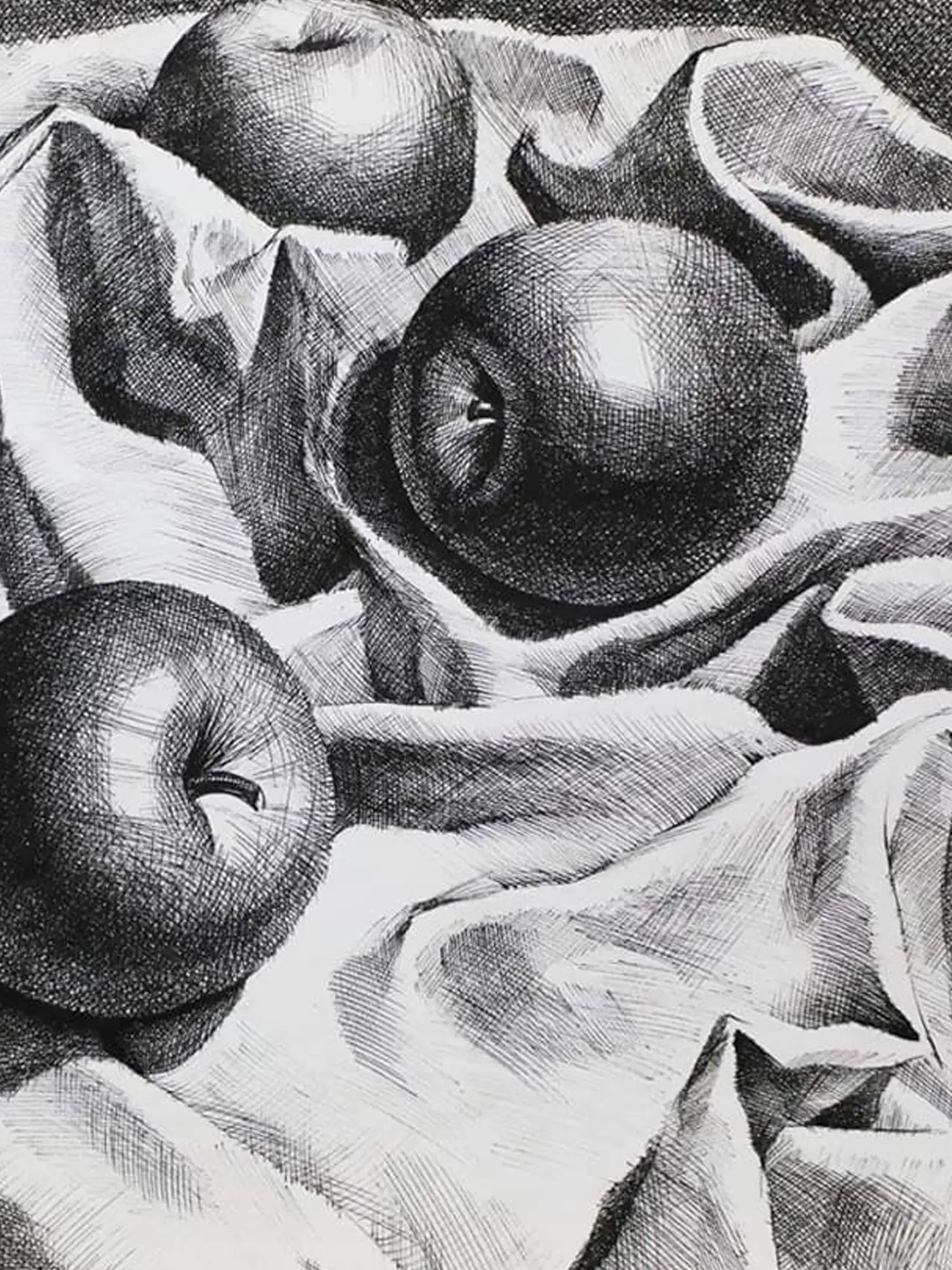 Arushi Tripathi elevates modern art and still life with her pen-on-paper greyscale sketch, transcending traditional boundaries. Using precise lines for shading, she achieves a striking contrast, emphasizing the drama in the arrangement. Apples sprawl across a crushed drapery, their forms expertly defined through meticulous detailing.