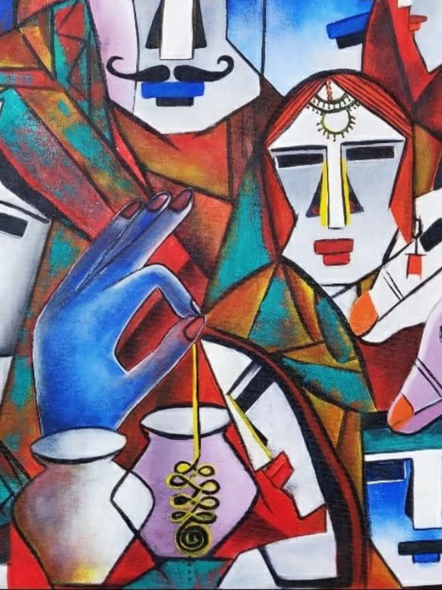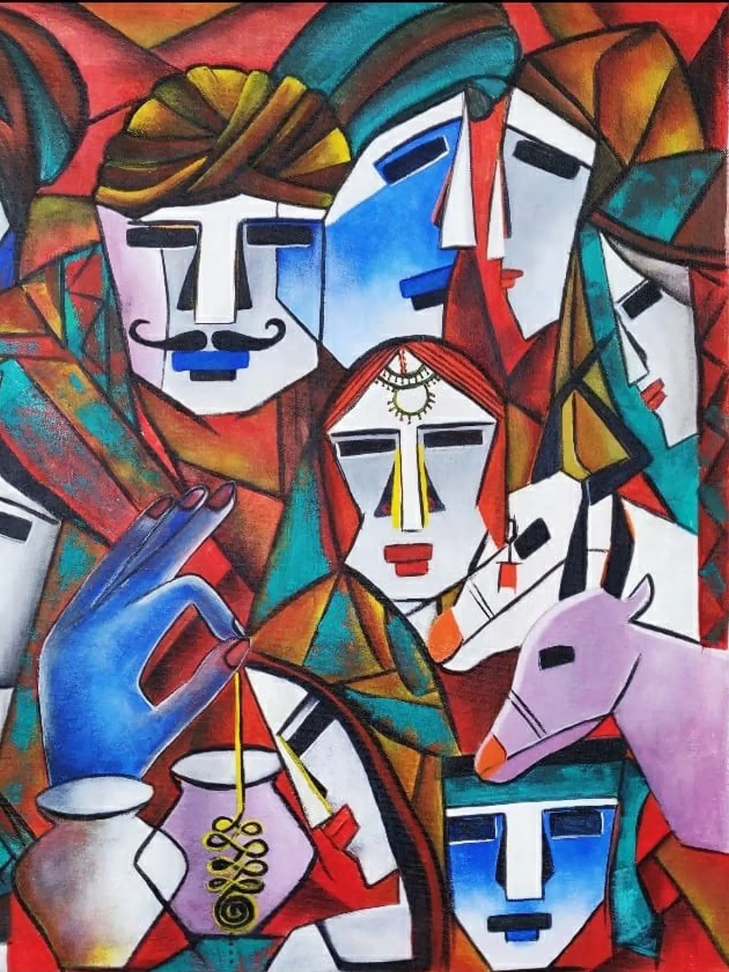 This piece draws inspiration from traditional Indian art forms and community gatherings, reinterpreting familiar motifs through a contemporary lens. The turbaned figures and the subtle nods to domestic life evoke a sense of heritage and shared human experience, presented in a way that transcends geographical boundaries. It speaks to the enduring spirit and vibrant traditions that shape individual and collective identities.