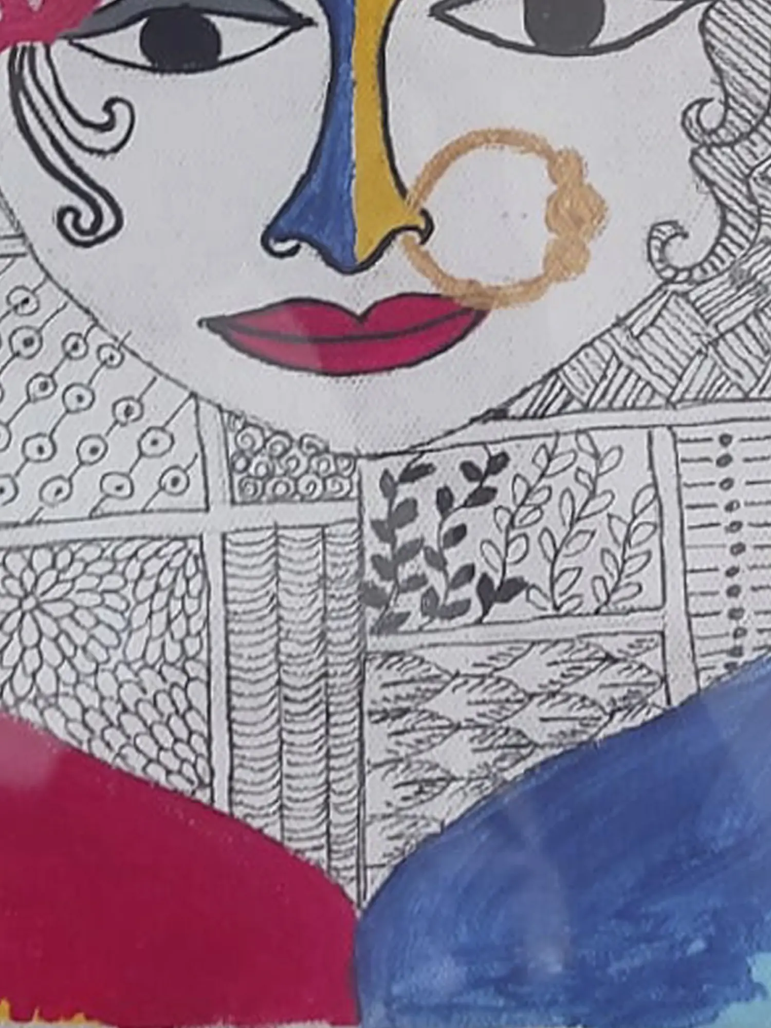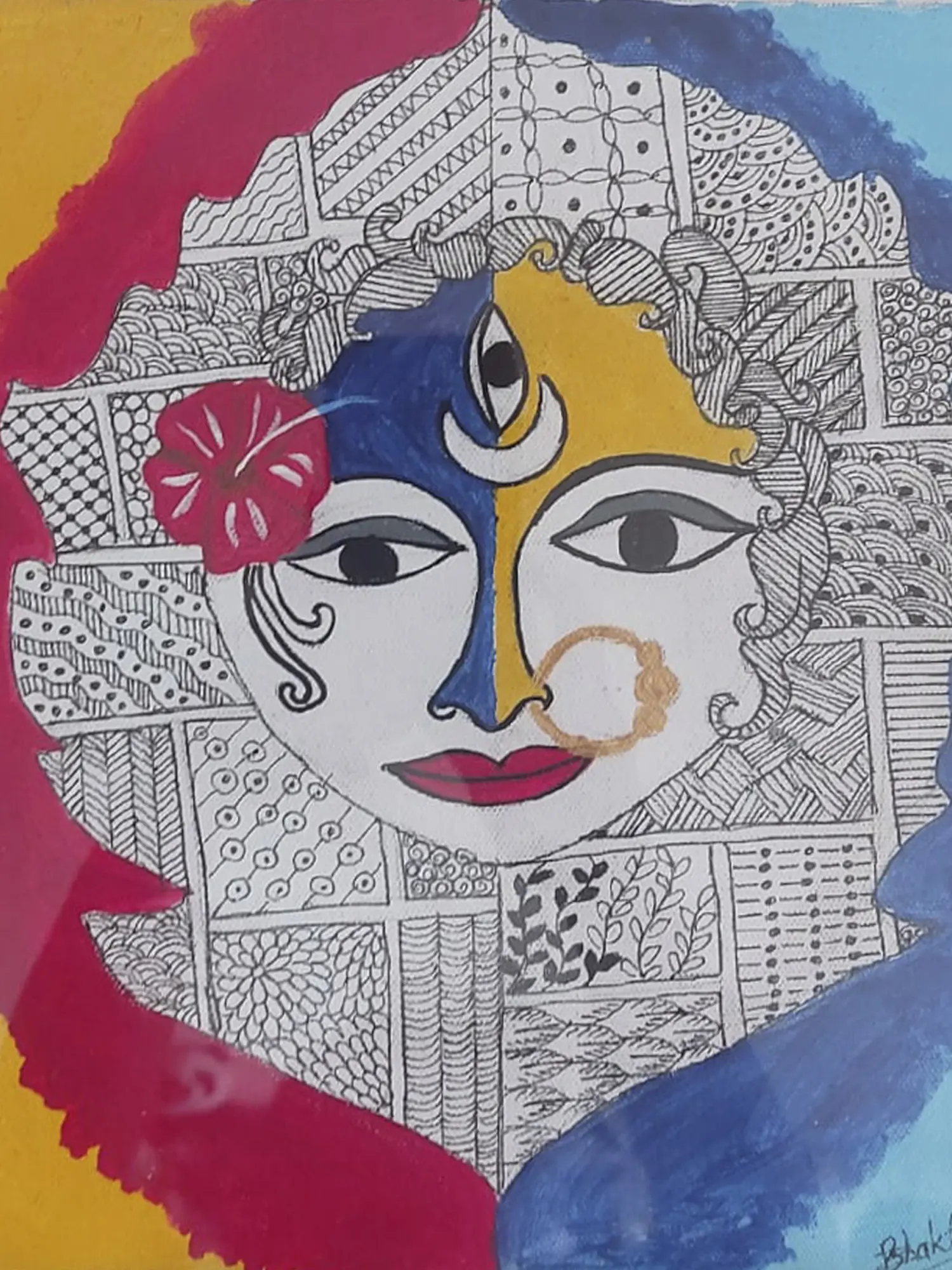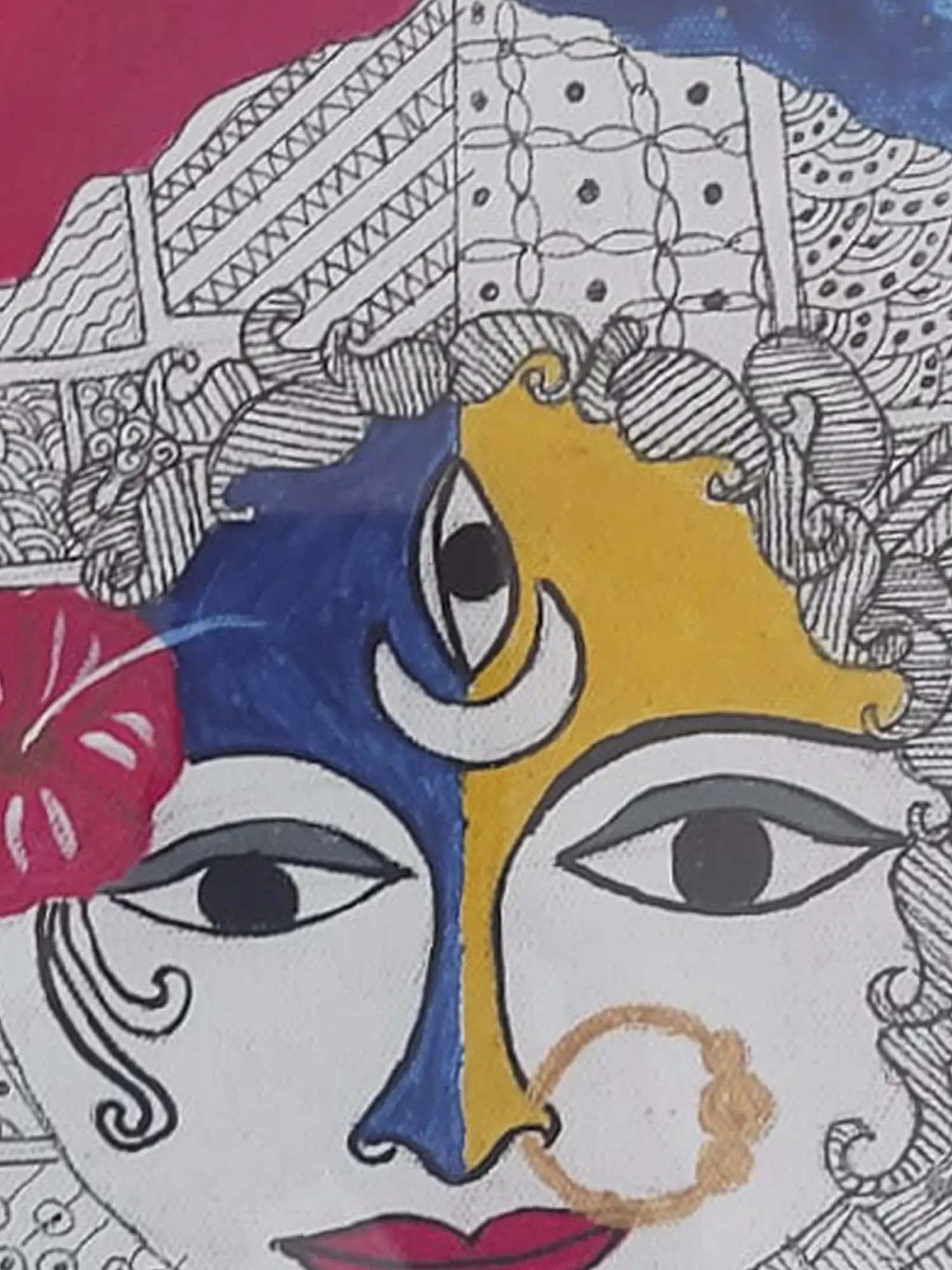 Prachi Deshpande's, Durga-Kali Mandala Painting on canvas is a mesmerizing fusion of divine energies, rendered in watercolor. The circular canvas transforms into a sacred mandala, where the powerful goddesses Durga and Kali converge. With intricate details and vibrant hues, Deshpande captures the strength and grace inherent in these divine manifestations. On the left side of the painting is the image of Kali with a Hibiscus flower placed near her face. The red Hibiscus flower offered to Kali is the symbol of fertility. The watercolor medium adds fluidity to the composition, emphasizing the cyclical and cosmic nature of the mandala.