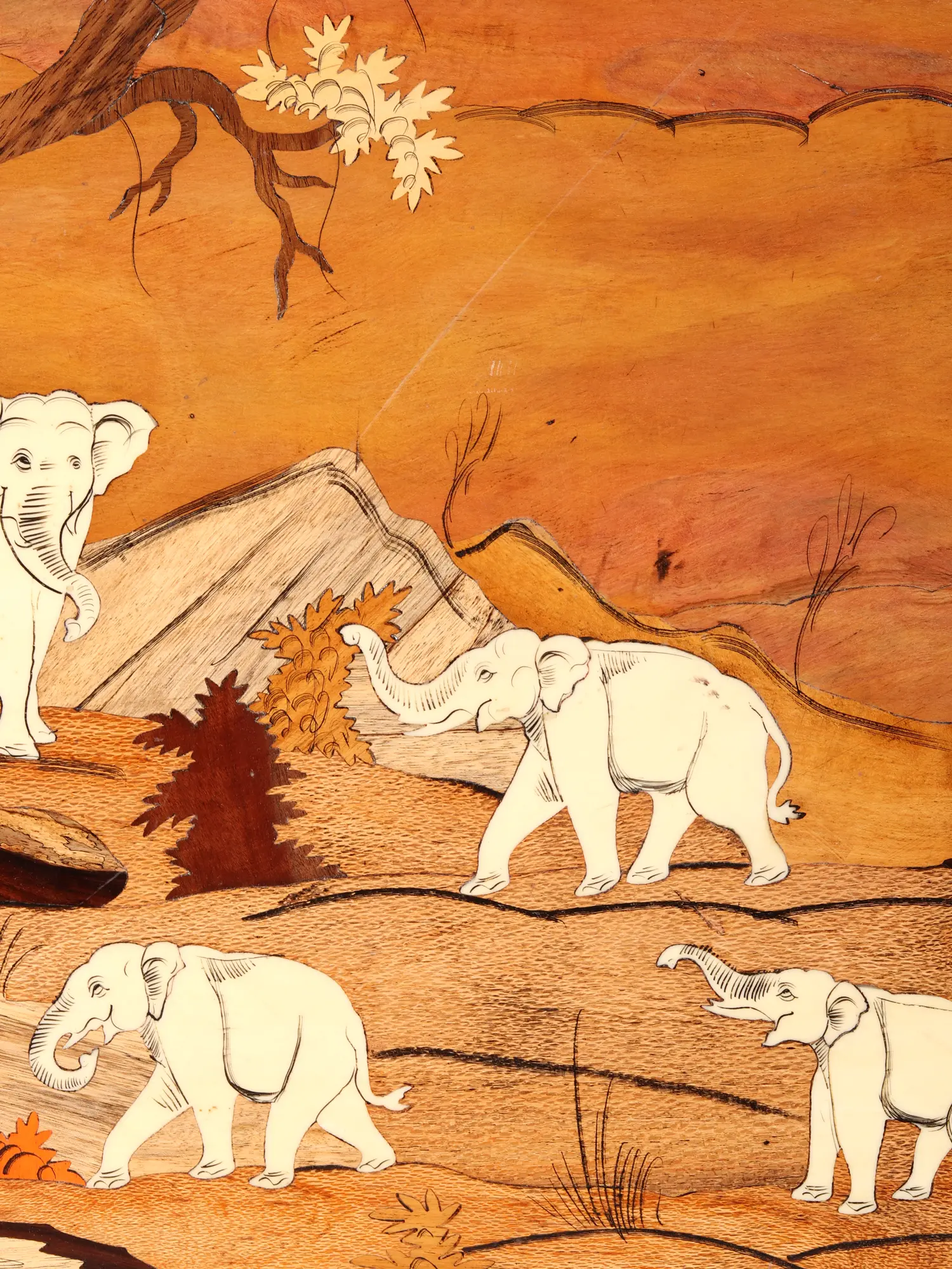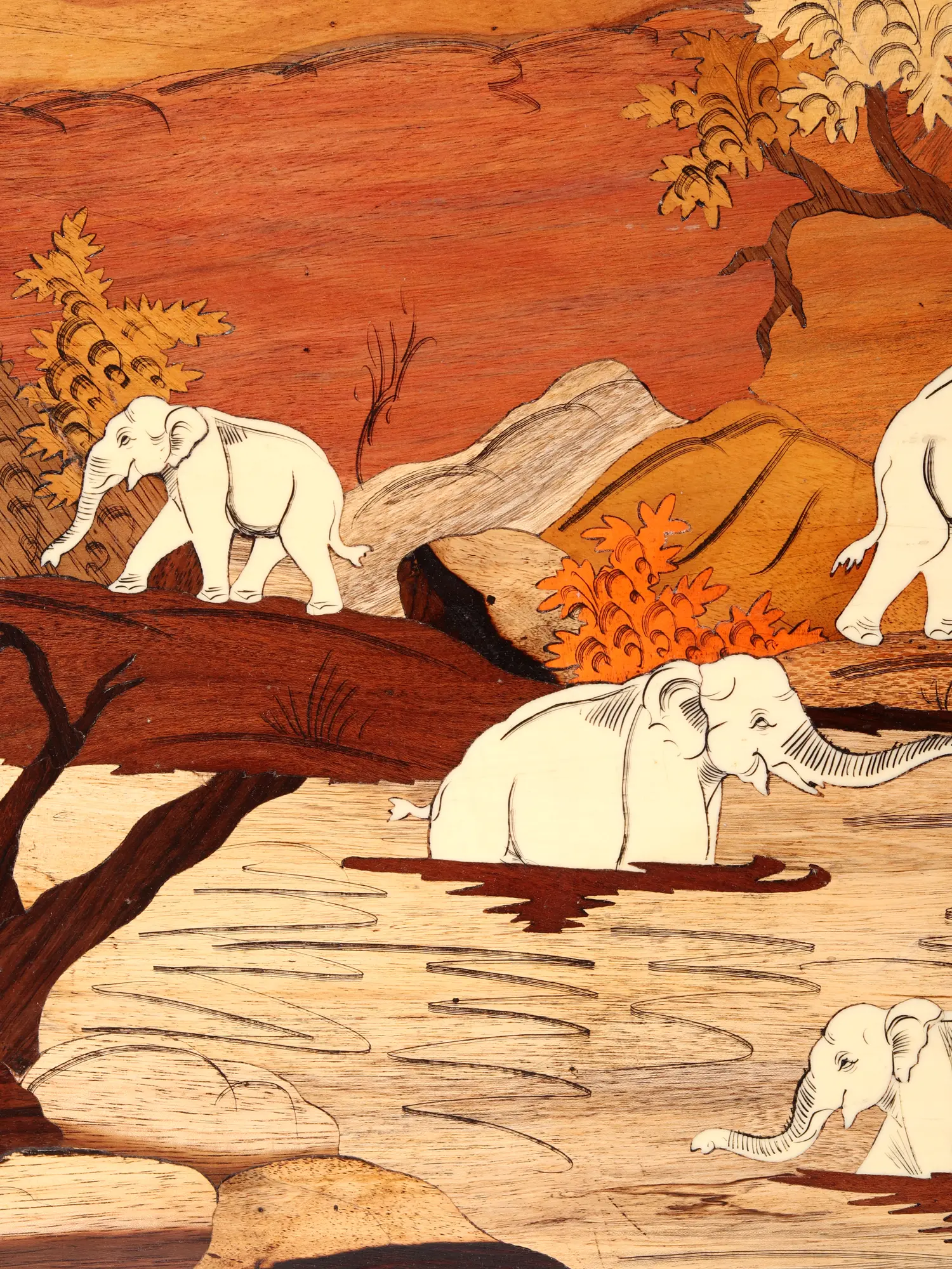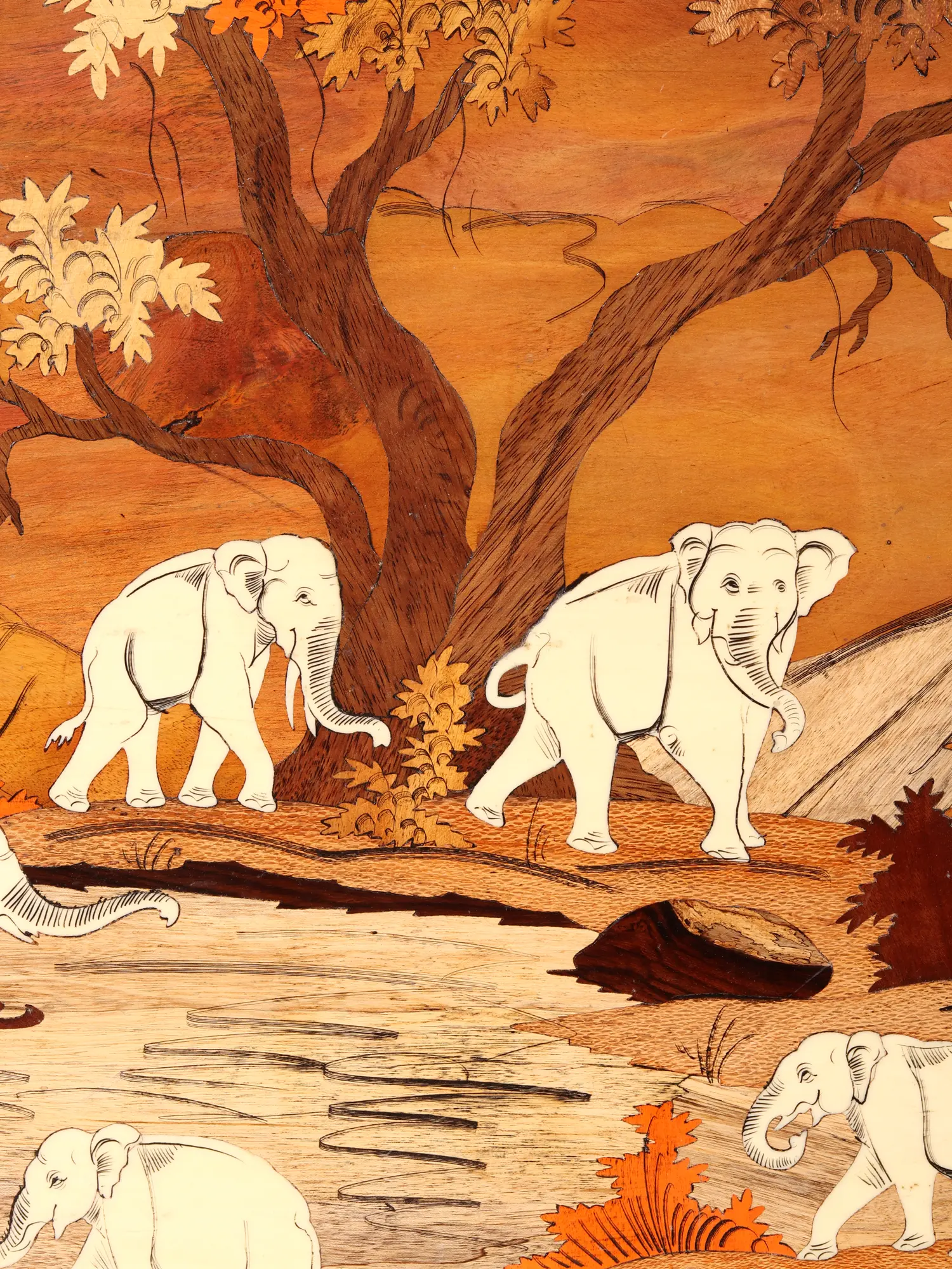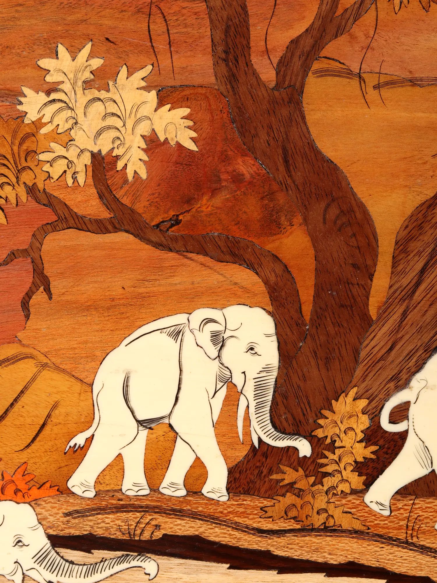 Born from the skilled hands of artisans, this piece showcases the intricate art of wood inlay. Natural wood tones have been meticulously selected and shaped to form a breathtaking tableau, with each element – from the majestic elephants to the textured landscape and the delicately rendered foliage – seamlessly integrated. The technique itself, a time-honored tradition, demands immense precision and an innate understanding of wood's diverse character, resulting in a visual tapestry of unparalleled depth and richness.