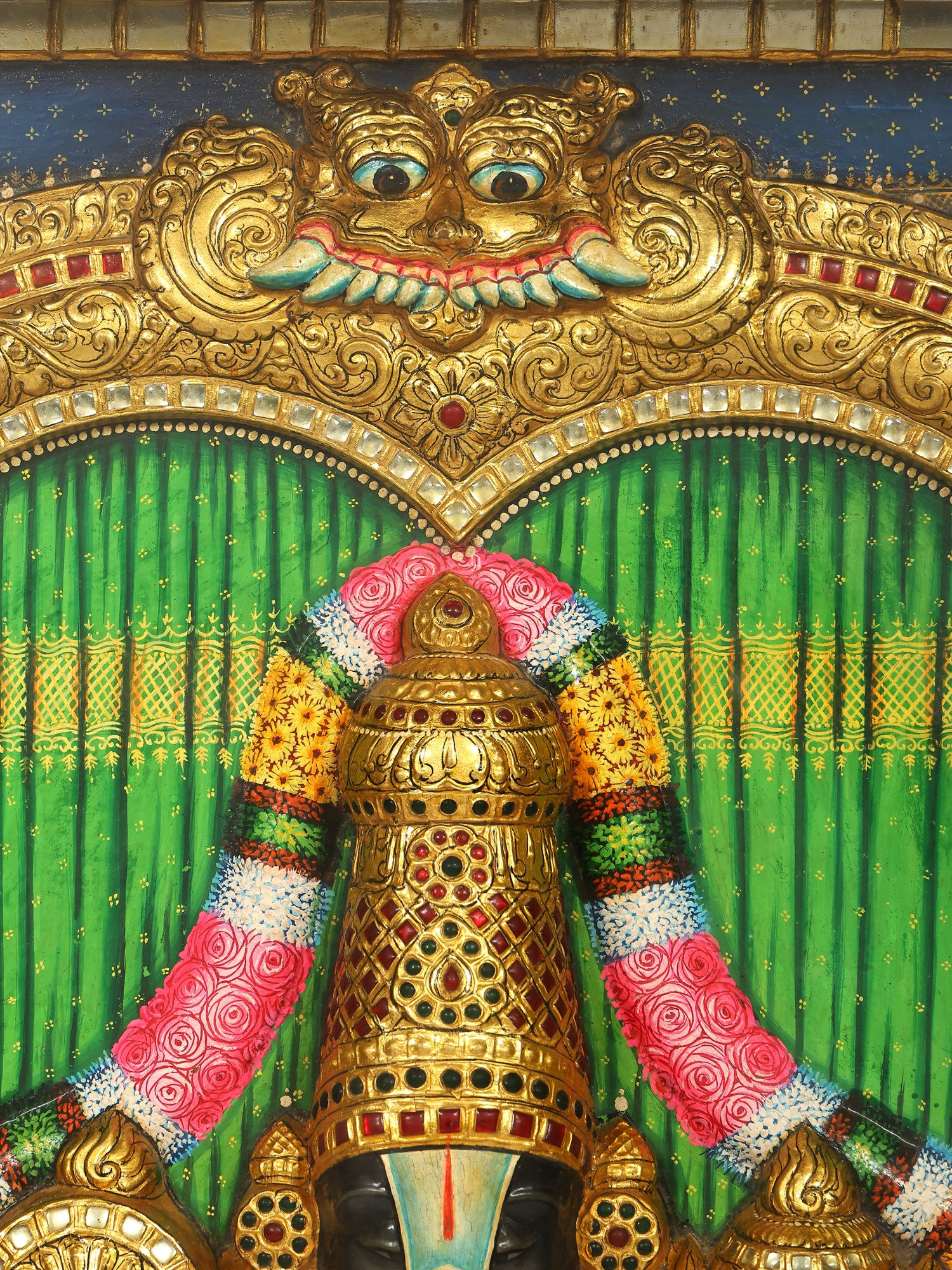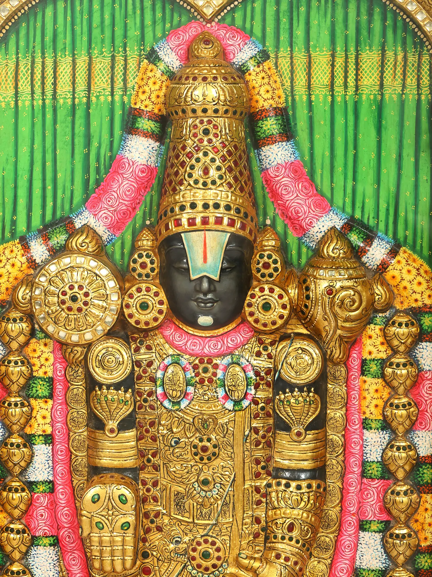 Lord Venkateshwara is a deeply revered deity, particularly in South India, with his primary abode at the Tirumala Temple in Andhra Pradesh. Legend has it that Lord Venkateshwara descended to Earth to save mankind from the trials and tribulations of Kali Yuga. His form in this painting, with its serene expression and elaborate regalia, symbolizes his omnipotence and compassion. The depiction often includes symbols of Vishnu, such as the conch (Shanka) and discus (Chakra), which are prominently featured in his divine attributes, representing creation and cosmic order. The intricate patterns and embellishments are not merely decorative but carry symbolic meanings, often representing the cosmic energy that permeates the universe. The colors used, like the vibrant reds and greens, are traditionally significant, evoking auspiciousness and divine power.