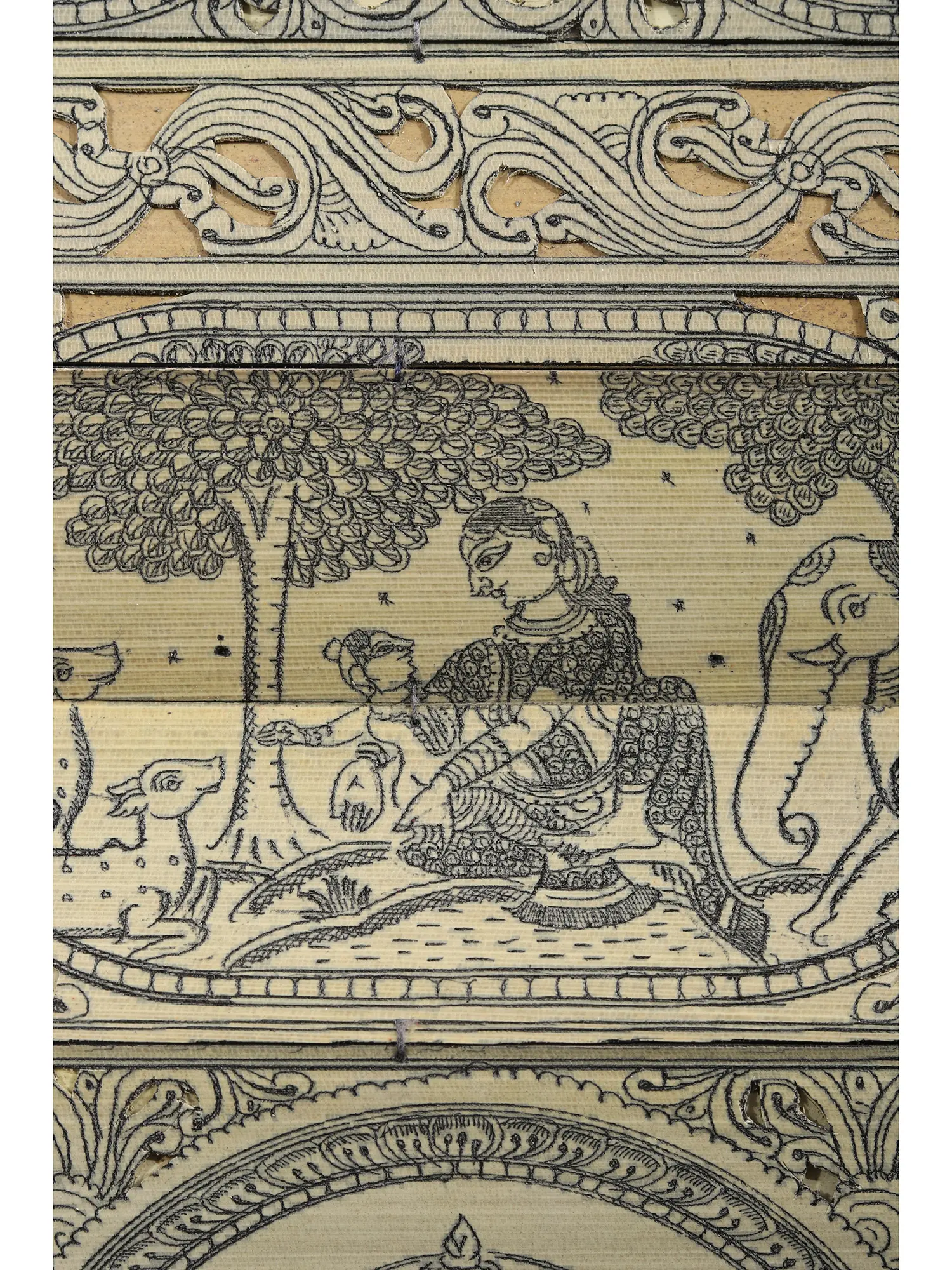 Pattachitra, meaning "picture on cloth," is a traditional folk art form originating in Odisha, India. However, Purna Chandra masterfully adapts this technique to palm leaves, a testament to the artist’s skill and innovation. The natural texture of the palm leaves lends a unique warmth and organic feel to the artwork, creating a beautiful contrast against the crisp lines and detailed scenes. The process of carving each scene onto these delicate leaves is time-consuming and intricate, highlighting the dedication of the artist and making this piece a true collector's item. Feel the weight of tradition, the whisper of history, and the unique charm of this hand-carved piece. The age-old techniques and commitment to quality resonate deeply within the work, allowing you to connect with a rich cultural heritage.