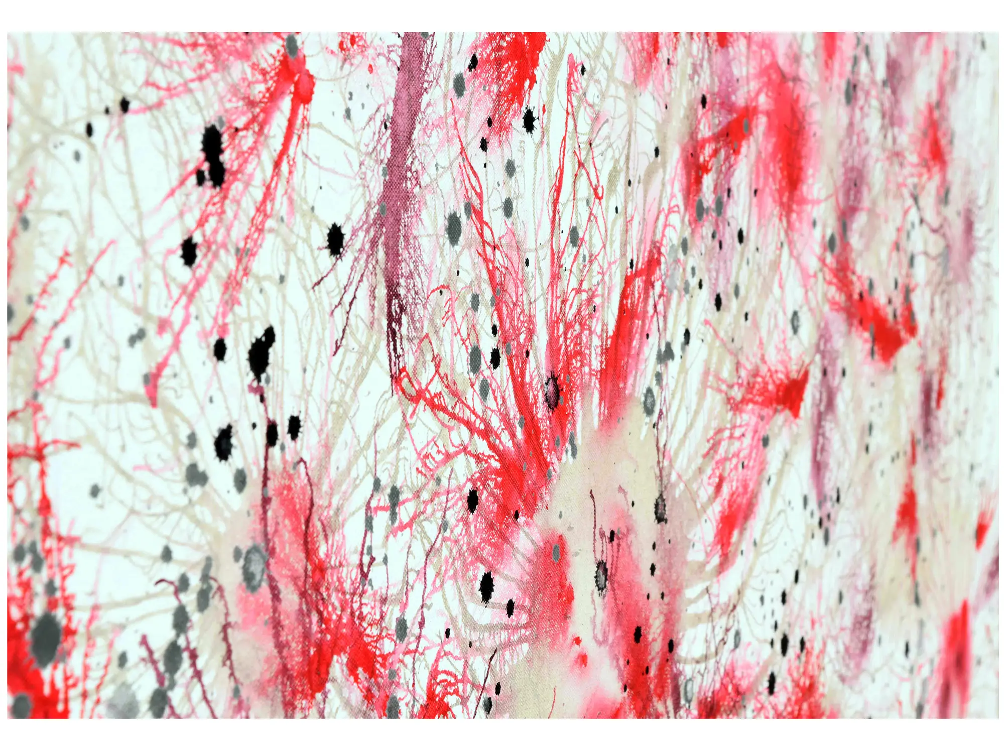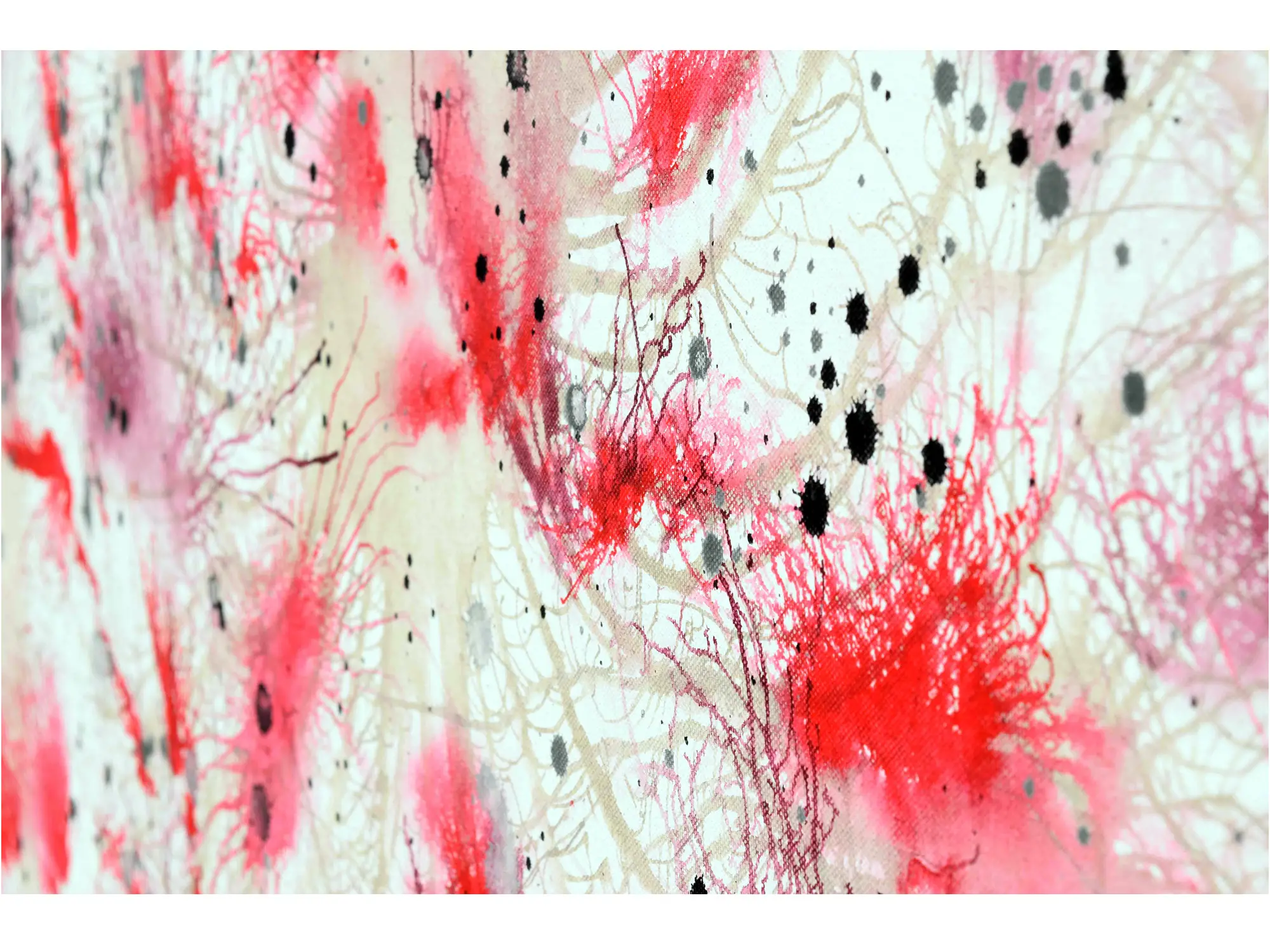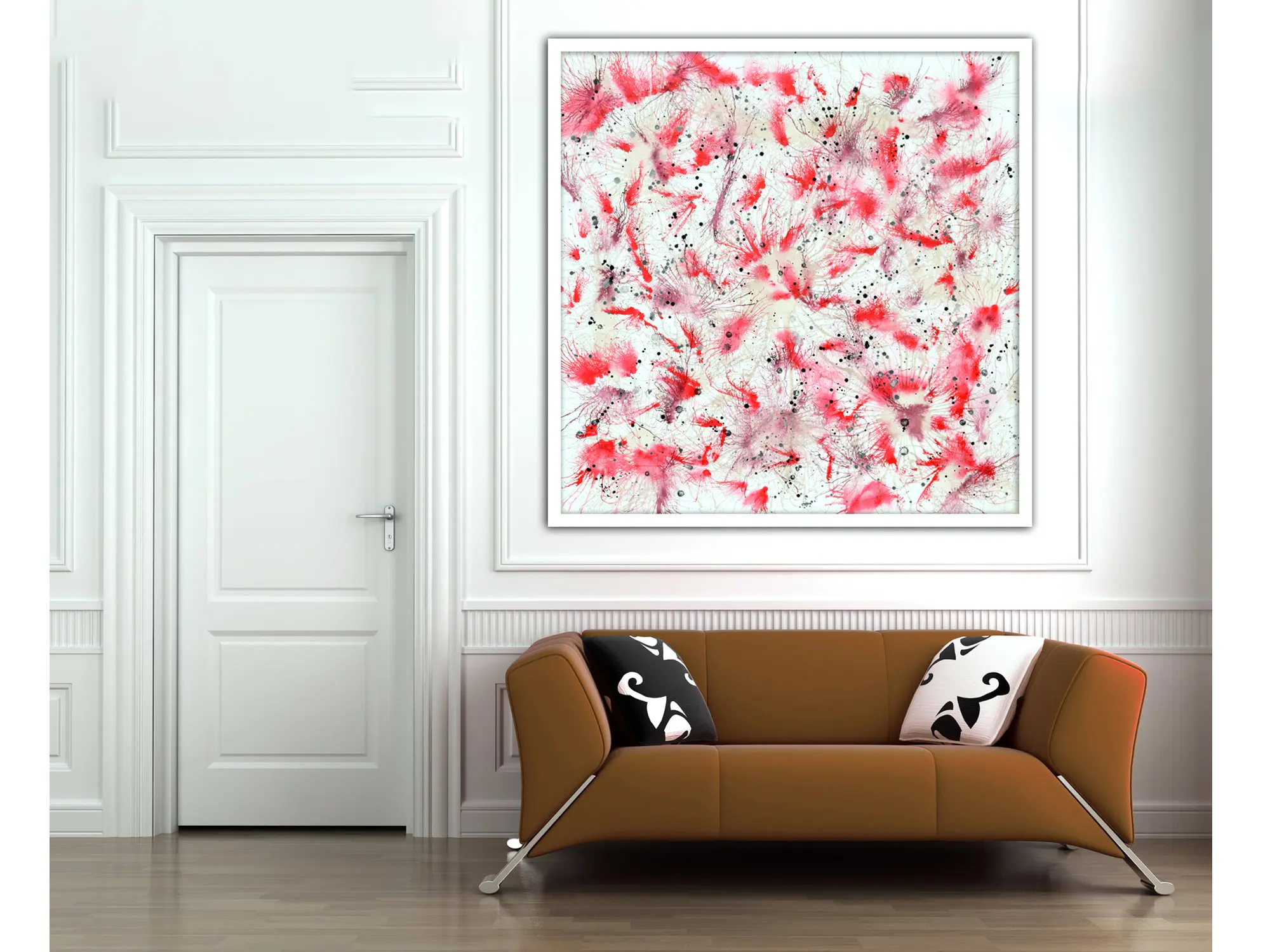 The striking interplay of vivid reds, soft pinks, and grounding charcoal accents draws the eye. Delicate, thread-like lines intertwine with bold bursts of color, reminiscent of blooming petals and scattered pollen. This expansive piece, measuring 44 by 44 inches, offers a substantial yet airy presence, allowing its intricate details to unfold upon closer inspection.