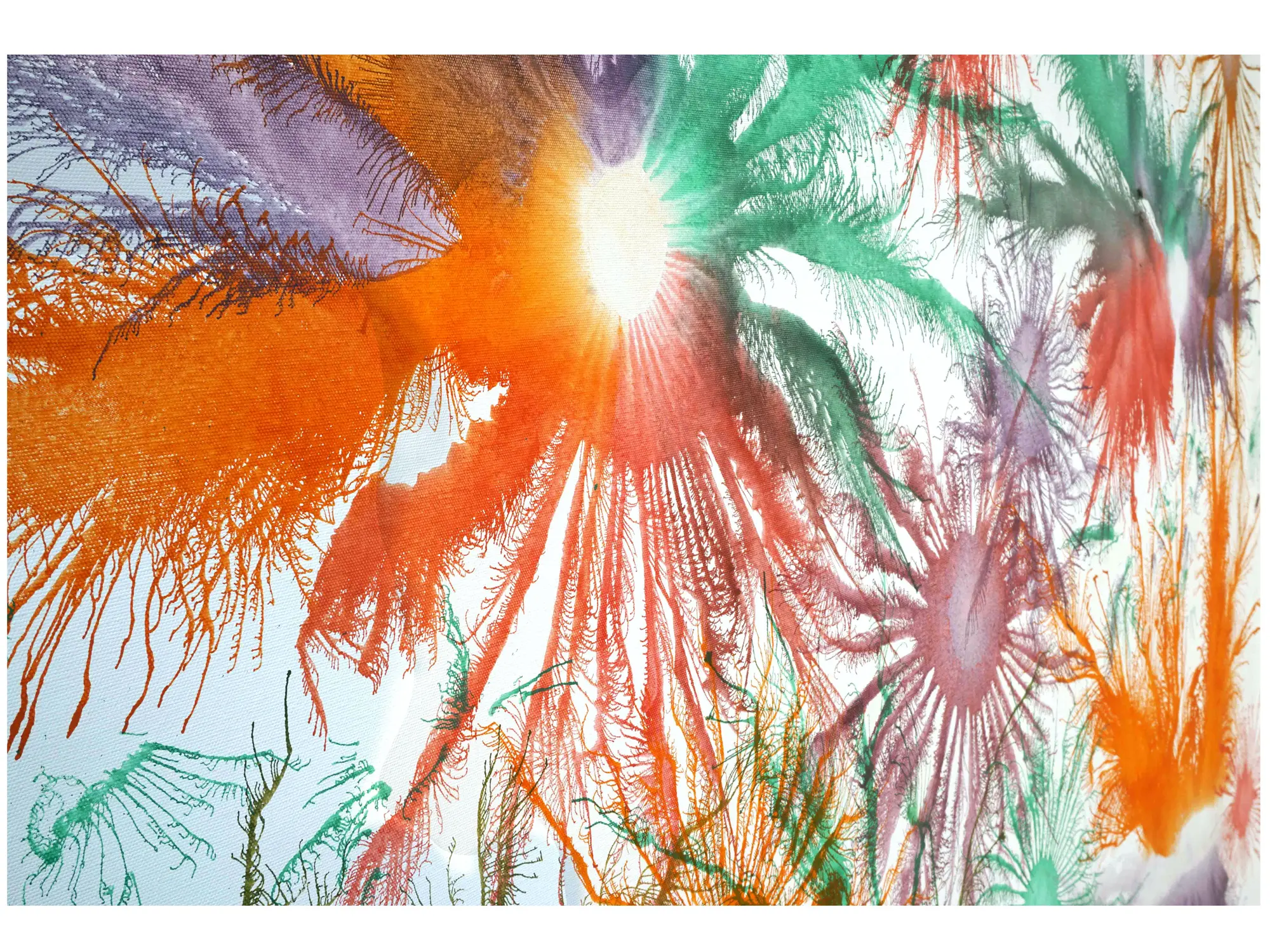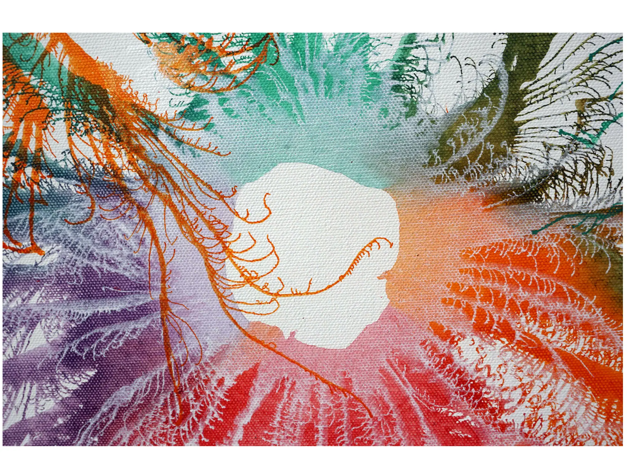 While abstract, the composition evokes a sense of cosmic phenomena, reminiscent of nebulae, supernovae, or the intricate patterns found in nature's grandest designs. The organic flow and radiating energy suggest a connection to universal forces, bringing a sense of awe and wonder into your space. It's a contemporary interpretation of timeless motifs, blending artistic innovation with a deep appreciation for natural beauty.