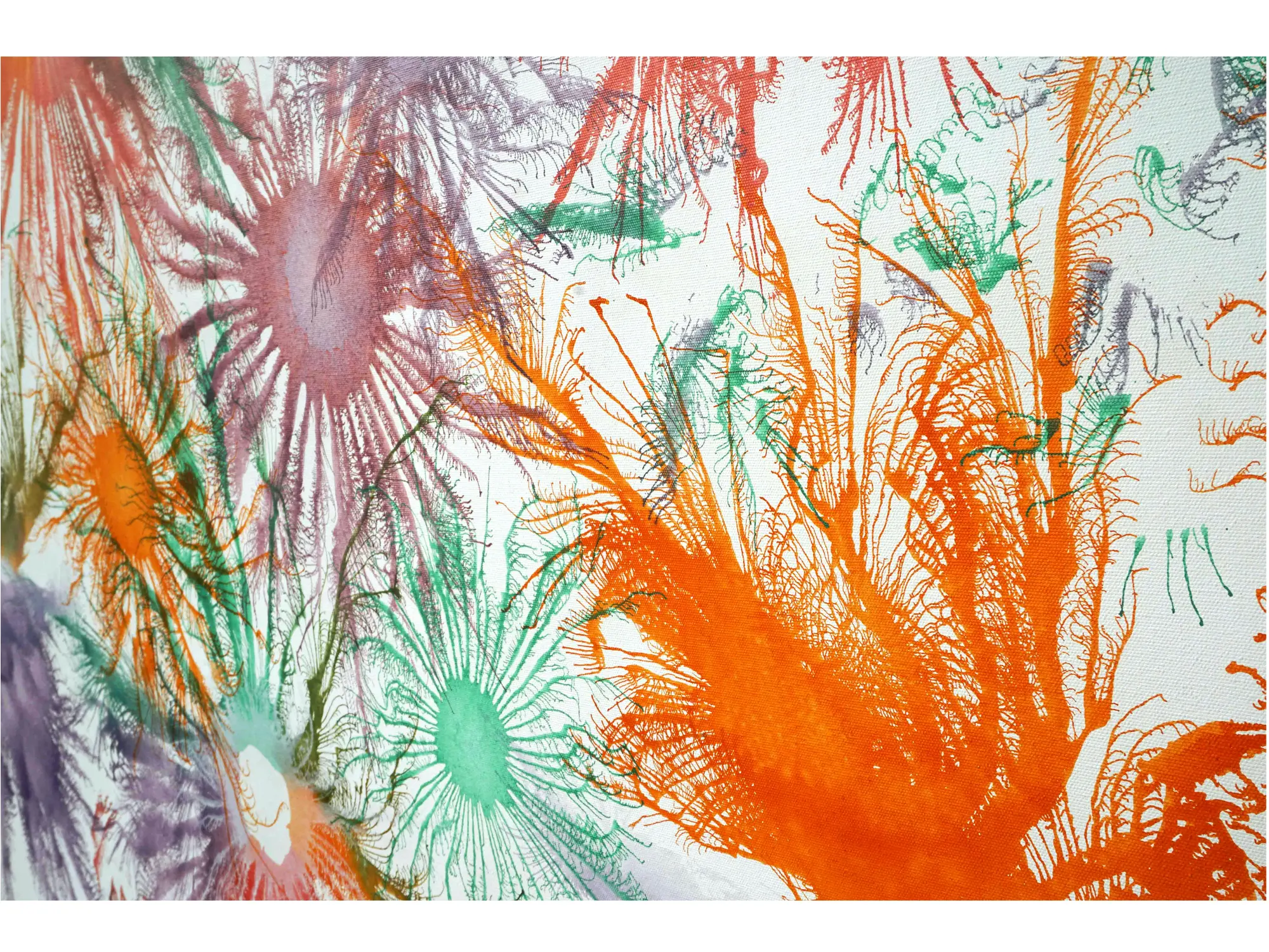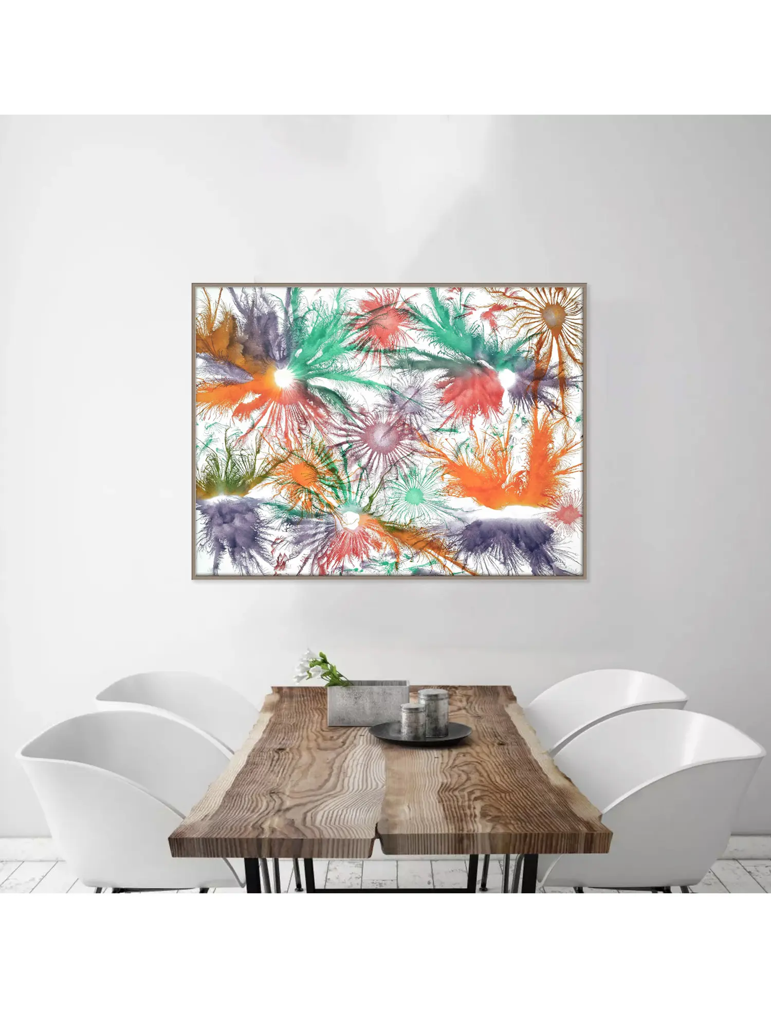 Measuring an impressive 60 inches wide and 44 inches in height, this expansive artwork commands attention, making it a focal point in any room. The interplay of rich, saturated hues against a crisp white background creates a striking contrast that draws the eye. You'll discover intricate details within each explosive burst of color, revealing a subtle complexity that rewards closer inspection.