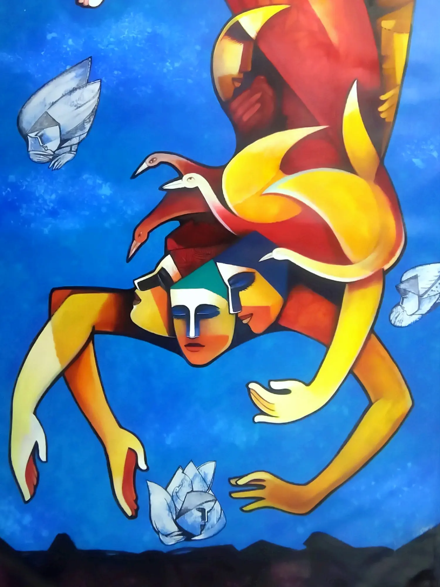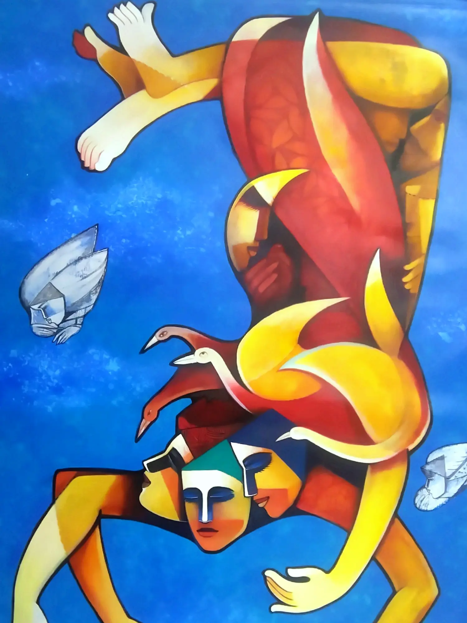 Nawal Kishore's "Falling In Love" is more than just a painting; it's a vibrant tapestry woven with threads of myth, emotion, and artistic expression. The artwork depicts two figures, intertwined in a breathtaking aerial embrace against a backdrop of a deep, azure sky. Their bodies are rendered in bold, expressive strokes of rich reds, oranges, and yellows, creating a dynamic sense of movement and passion. The figures seem weightless, suspended in a moment of intense connection, their gestures echoing a timeless dance between lovers. The use of color evokes a feeling of warmth, energy, and exhilaration. The artist's skillful handling of acrylics gives the piece a remarkable depth and luminosity. The figures, though stylized and abstract, possess a palpable humanity, their expressions radiating a profound emotional intensity.
