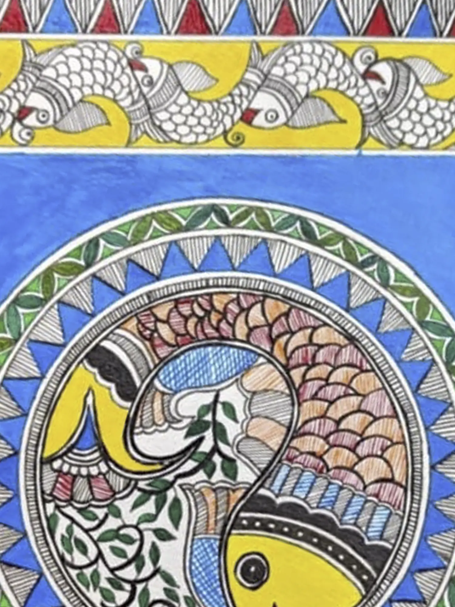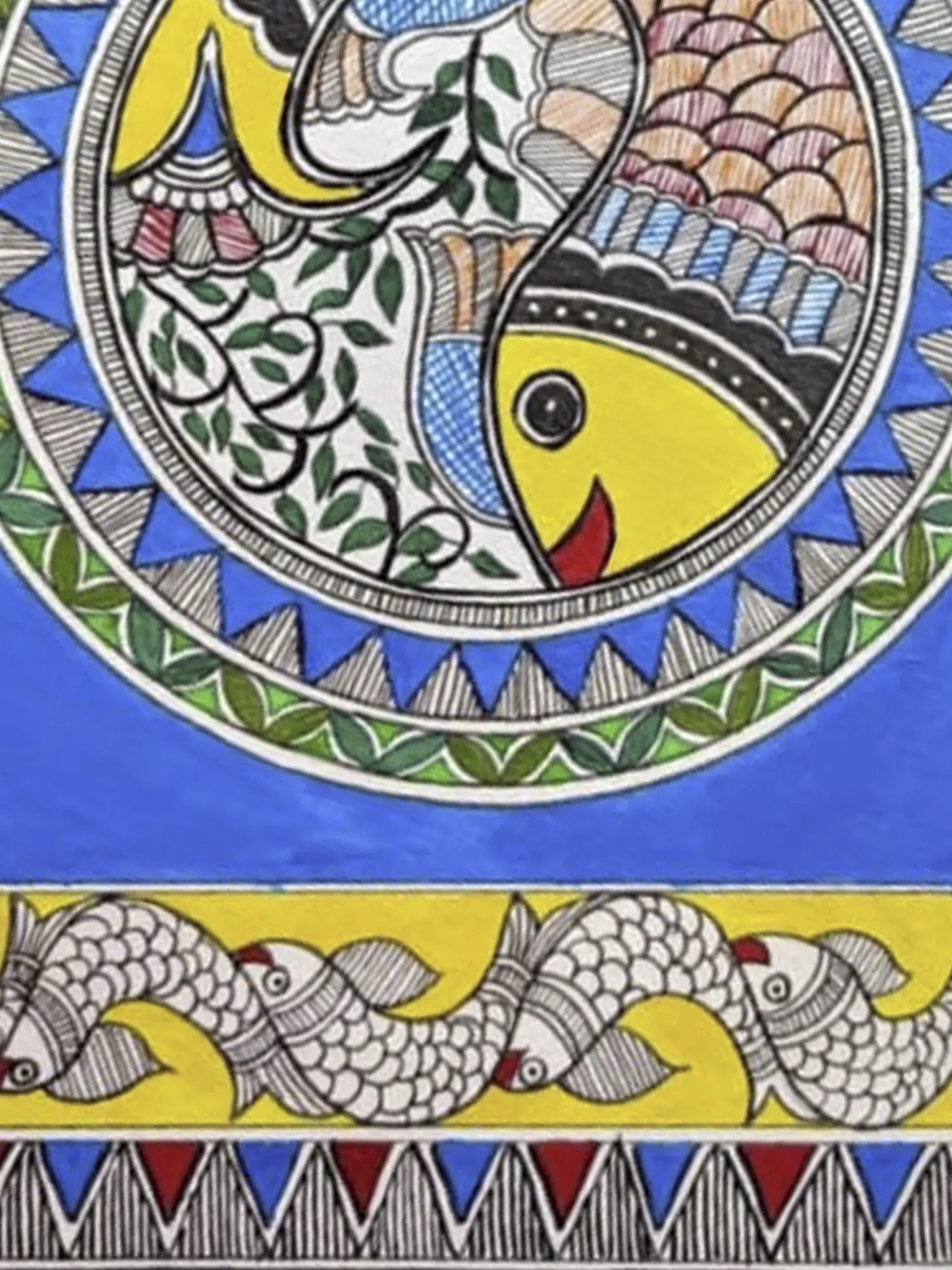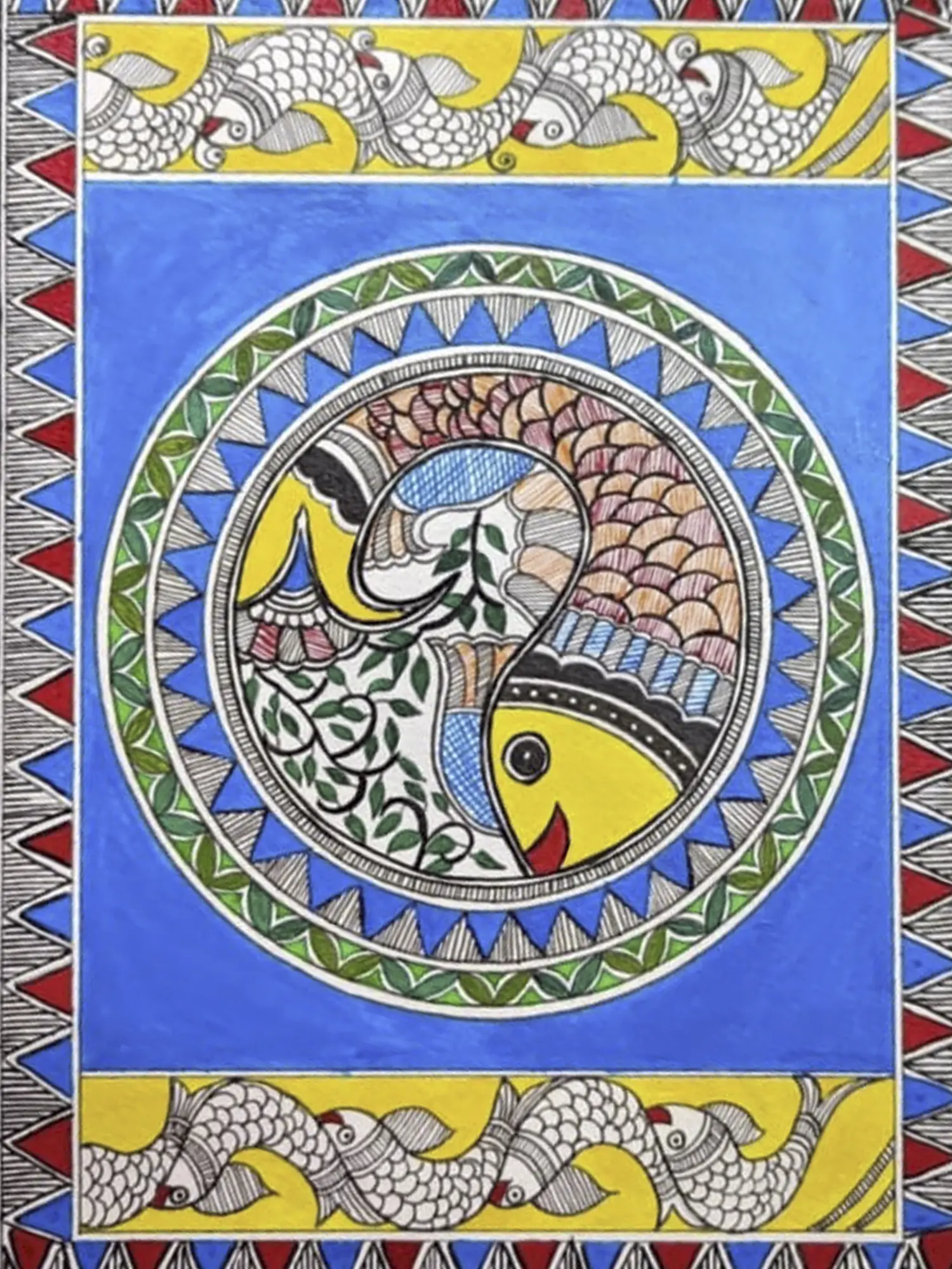 Muskan's "Fish in Pond" Madhubani painting, skillfully crafted with acrylic on Brustro paper, immerses viewers in a vivid aquatic tableau. The artwork intricately captures the essence of a pond teeming with life, where vibrant fish navigate through aquatic foliage. Muskan's meticulous strokes and choice of acrylics infuse the scene with dynamic energy, bringing the aquatic world to life. The traditional Madhubani style is evident in the rich detailing and symbolic elements, celebrating the cultural heritage of this ancient art form. With a mastery of form and color, Muskan's creation invites admirers to dive into the beauty and serenity of a captivating underwater realm.