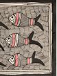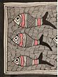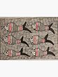 In this Madhubani painting on handmade paper, the tranquil depiction of fishes in a serene queue emerges with soothing shades of black and pastel colors. The negative and positive spaces are artfully distinguished through varying strokes, with black lines dominating and red lines adding dynamic contrast. The rhythmic alignment of the fish in the queue brings a harmonious flow to the composition.