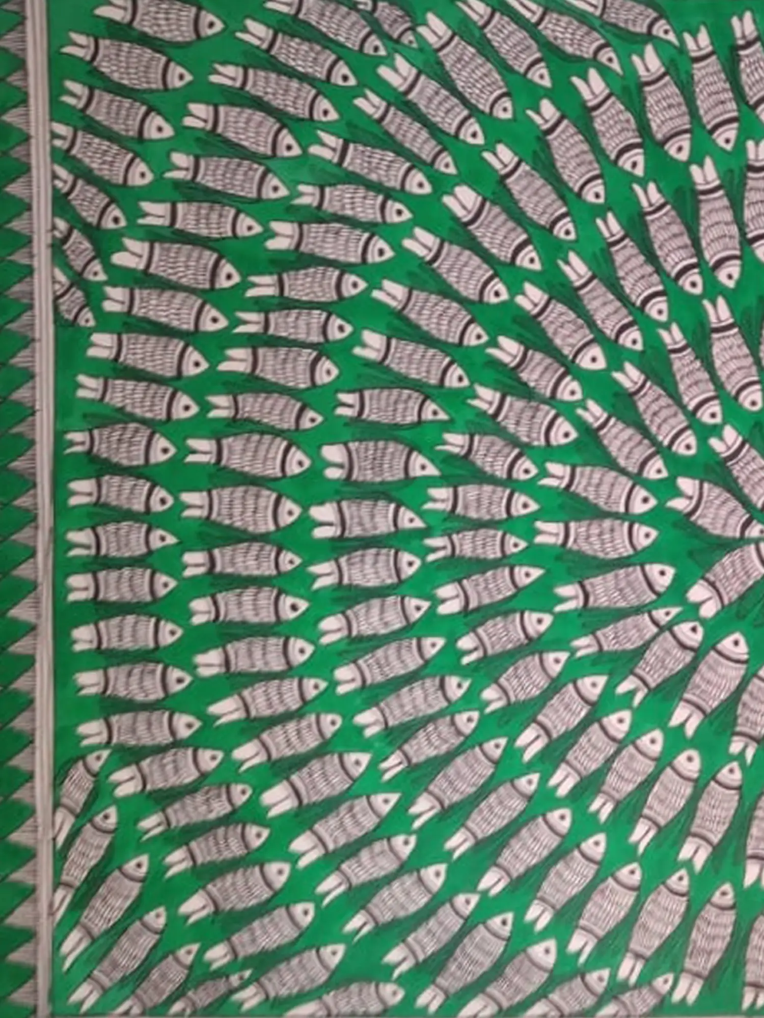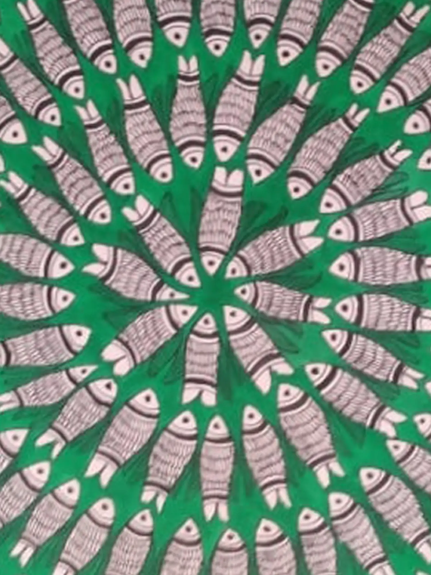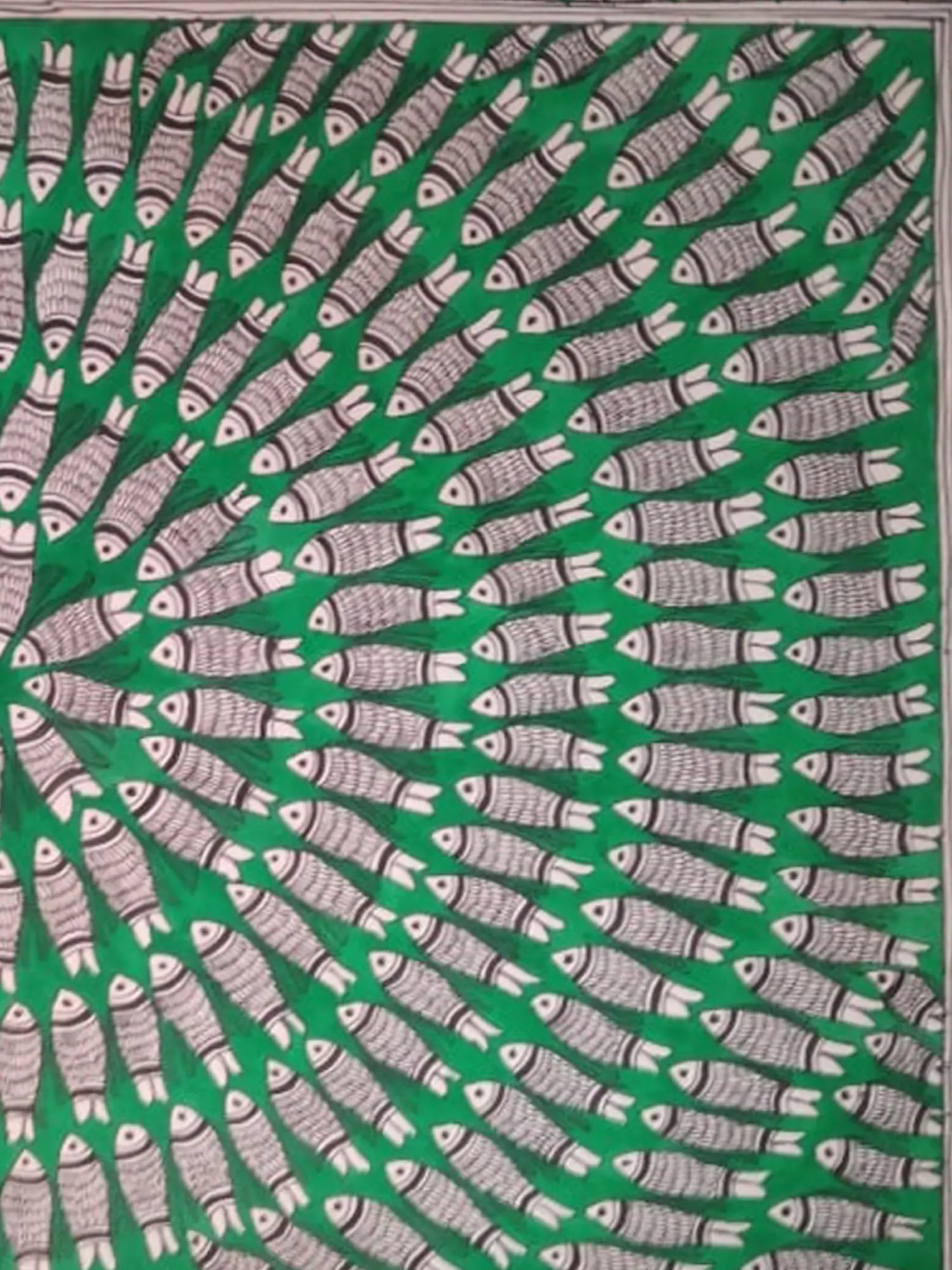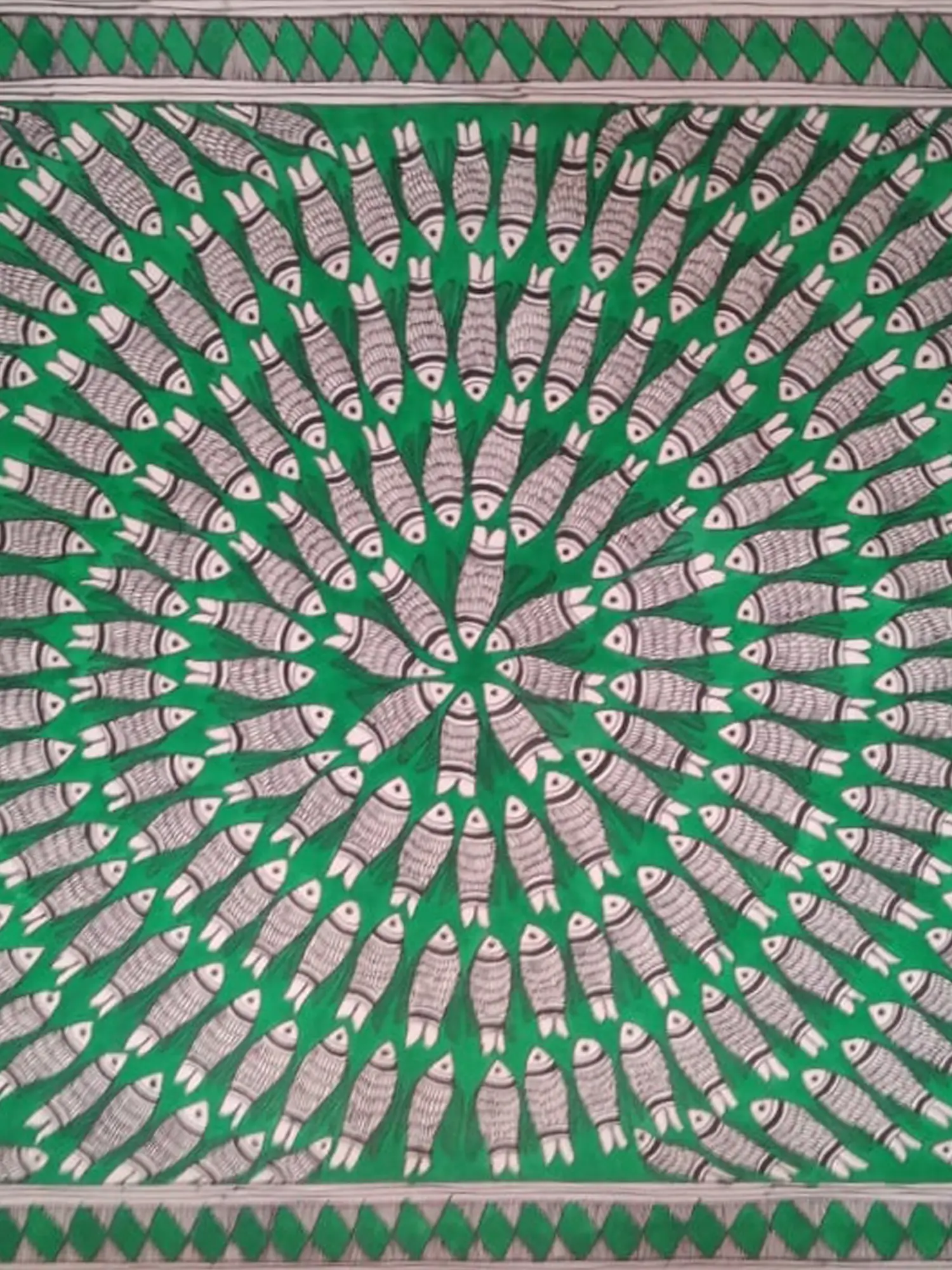 "The Fishnet" by Archana Jha is a captivating Madhubani painting that intricately weaves together cultural symbolism and artistic finesse. Against a lush green background, the sacred image of fishes in black and white gracefully converges toward the center, creating a mesmerizing display. The meticulous detailing in this Madhubani masterpiece not only reflects the artist's skill but also pays homage to the sacred significance of fishes in the Mithila region. "The Fishnet" stands as a testament to the rich heritage of Madhubani art, where each stroke narrates a story and each motif carries cultural reverence, making it a beautiful and meaningful addition to artistic expression.