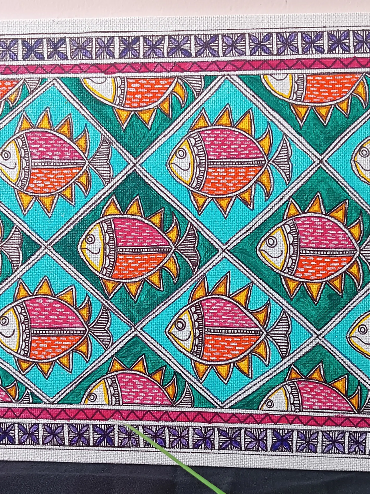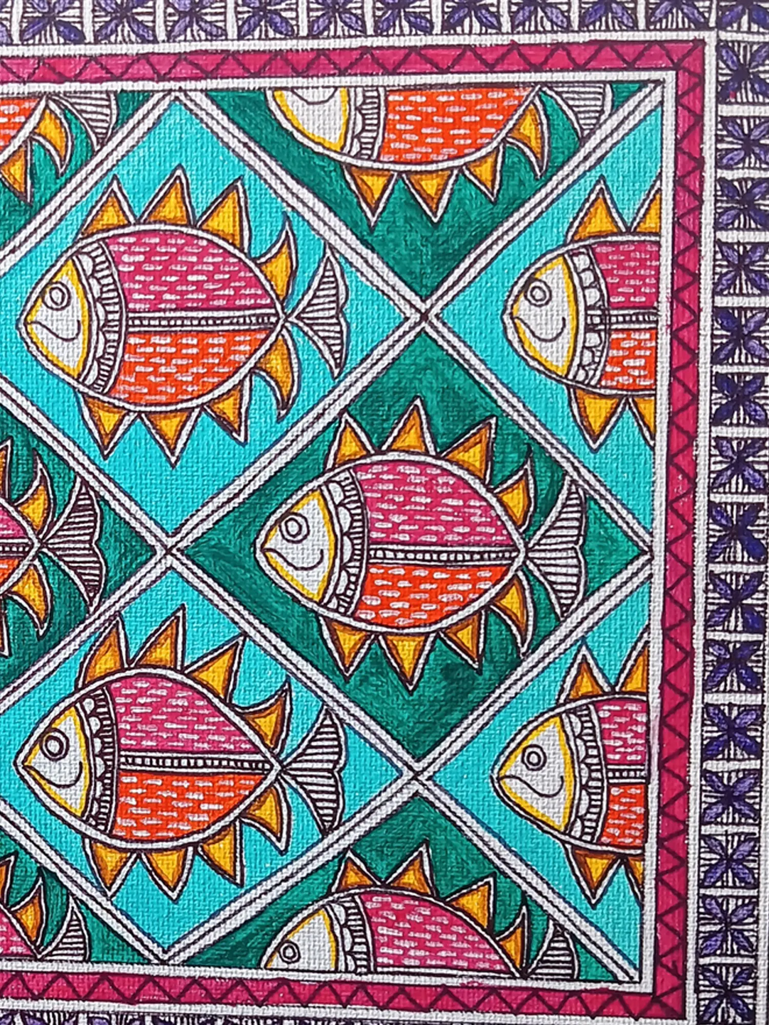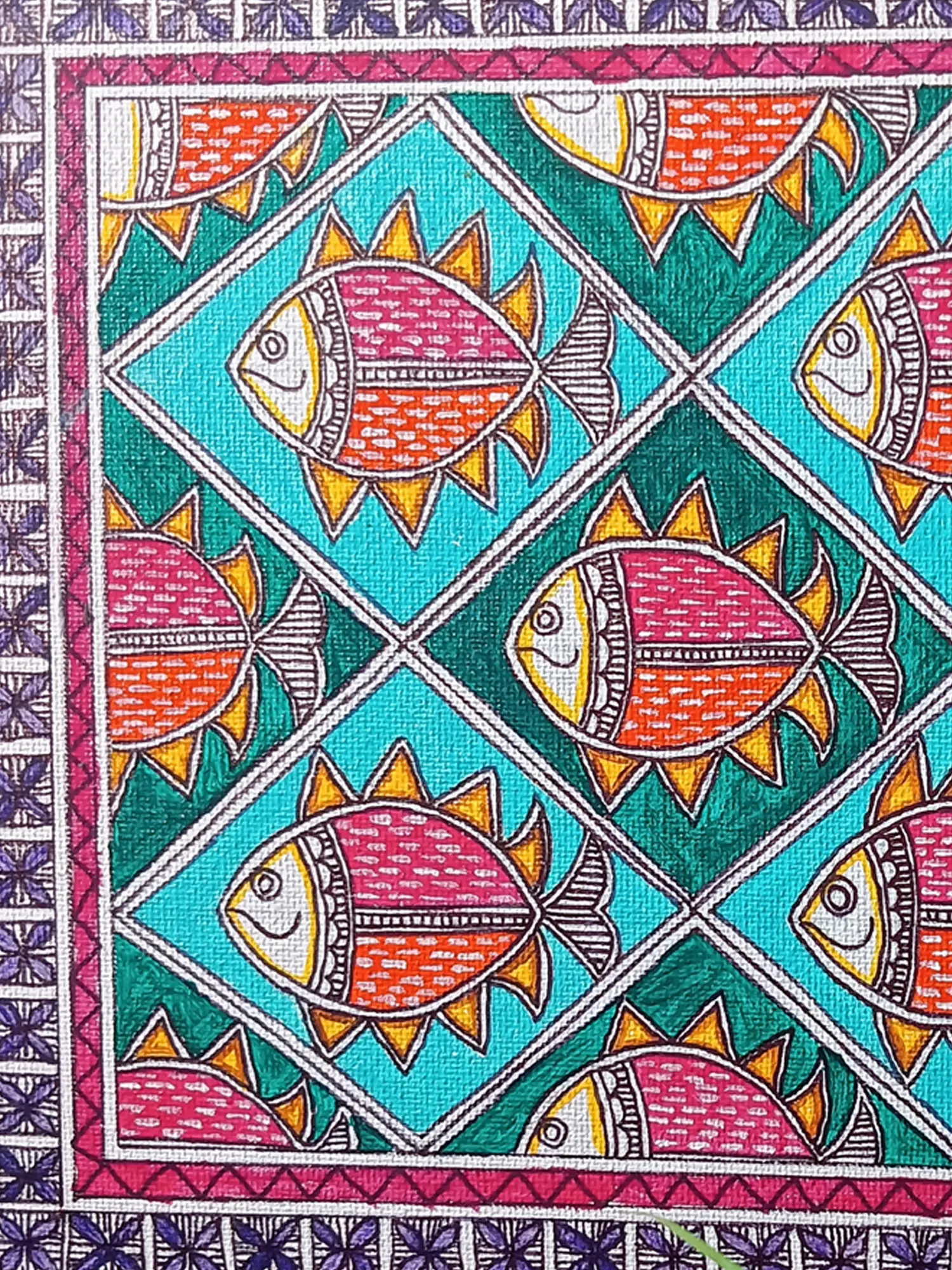 Rina Patwa's "The Fishy Frame" on Acrylic and Canvas is an enchanting masterpiece in Madhubani style. The vivid red and orange hues of the beautifully drawn fishes’ contrast against alternating light blue and green diamond-shaped frames, creating a visually striking composition. The precision and vibrancy of Acrylic on Canvas elevate the artwork, making it an attractive and eye-catching wall hanging. Rina's skilled rendition of Madhubani elements, combined with the dynamic arrangement of colors and shapes, transforms "The Fishy Frame" into a captivating piece that adds both cultural richness and visual allure to any space it graces.