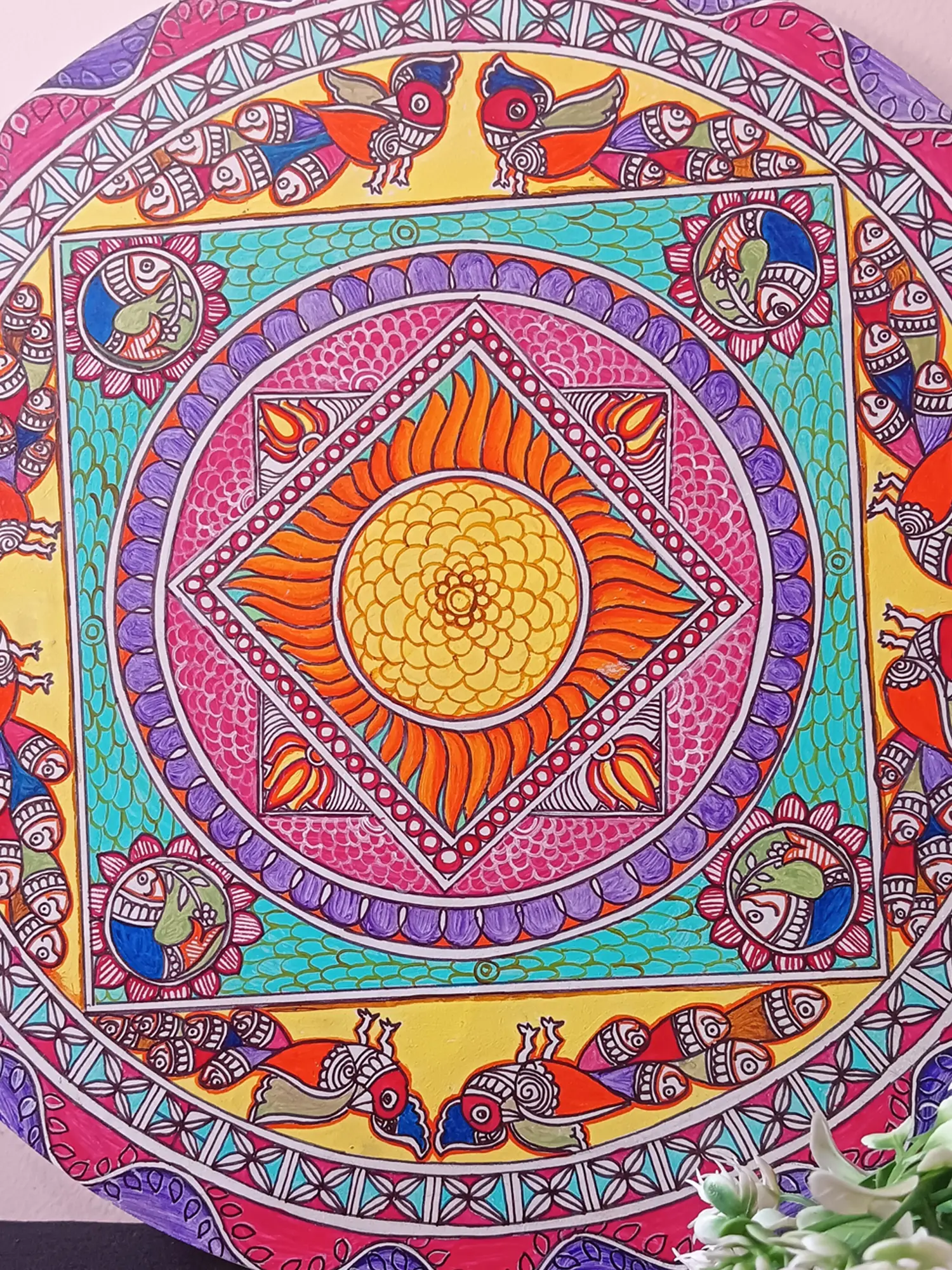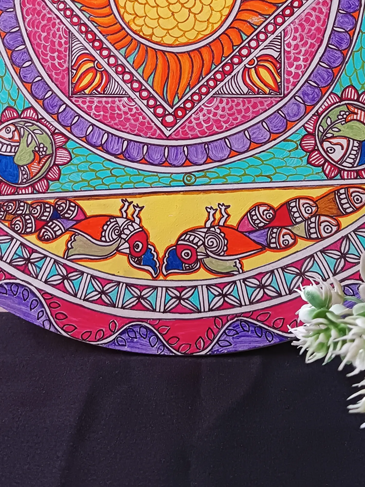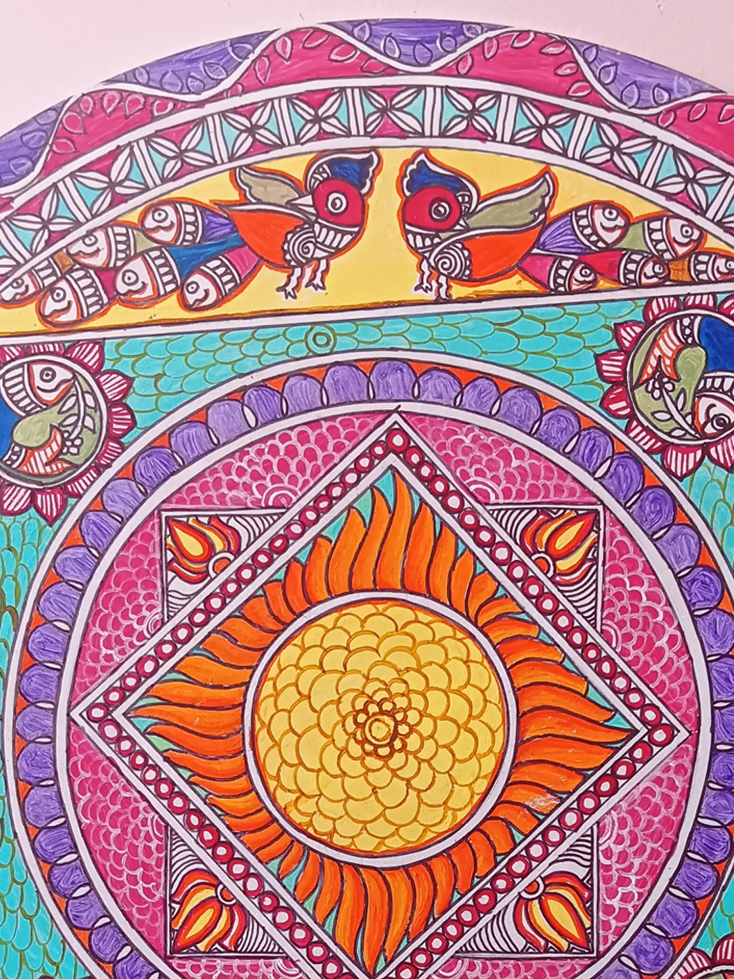 Rina Patwa's "Five Elements" painting on Acrylic and MDF Board is a captivating visual representation of the elements in the vibrant Madhubani style. At its center, Agni or Tejas radiates warmth and energy. Above it, the blue expanse signifies Apas or water, beautifully detailed with waves. The section adorned with fishes and birds represents Prithvi, embodying the earth element. The wavy patterns above the circular rim symbolize Vayu or air, creating a dynamic visual flow.