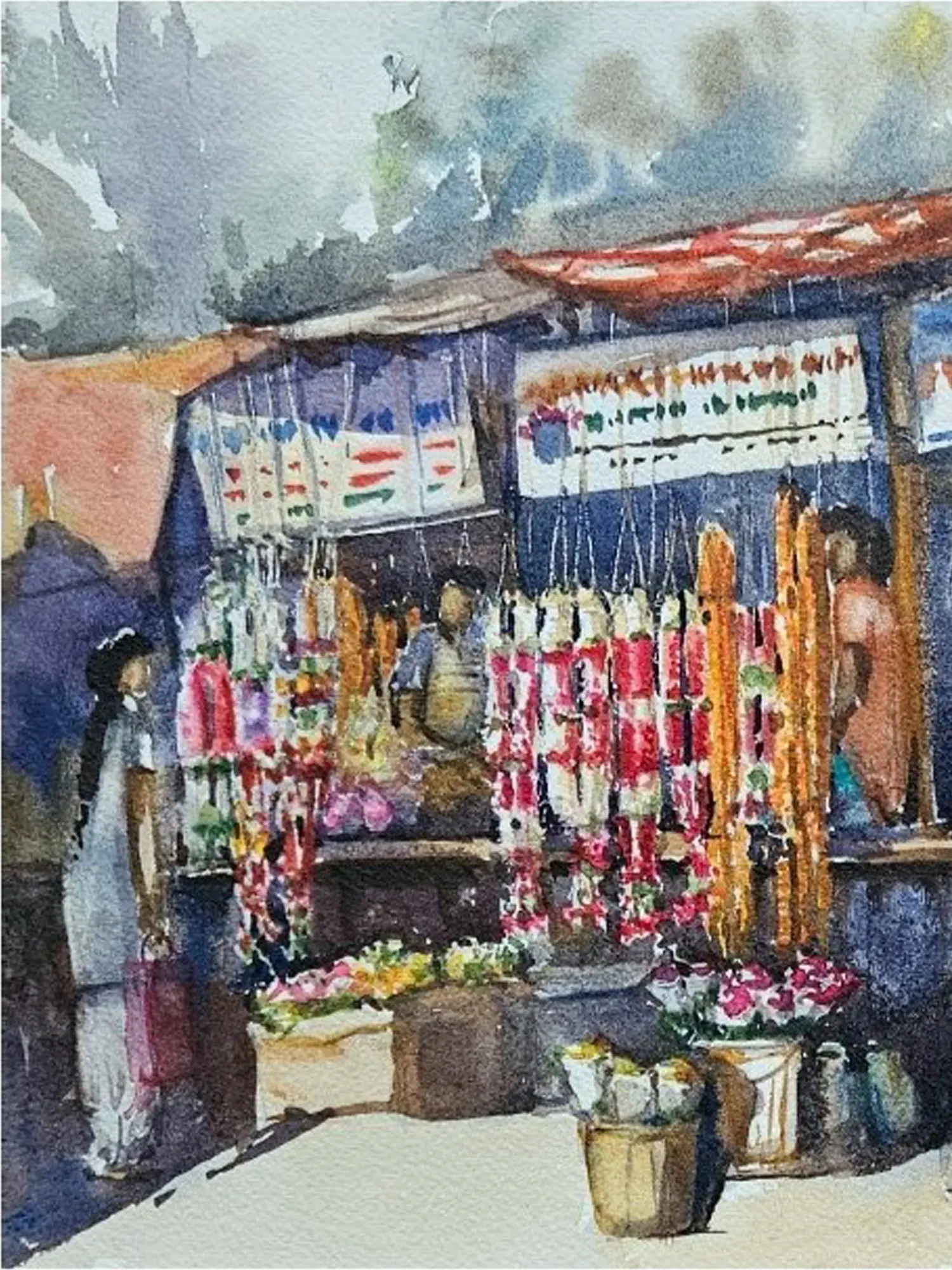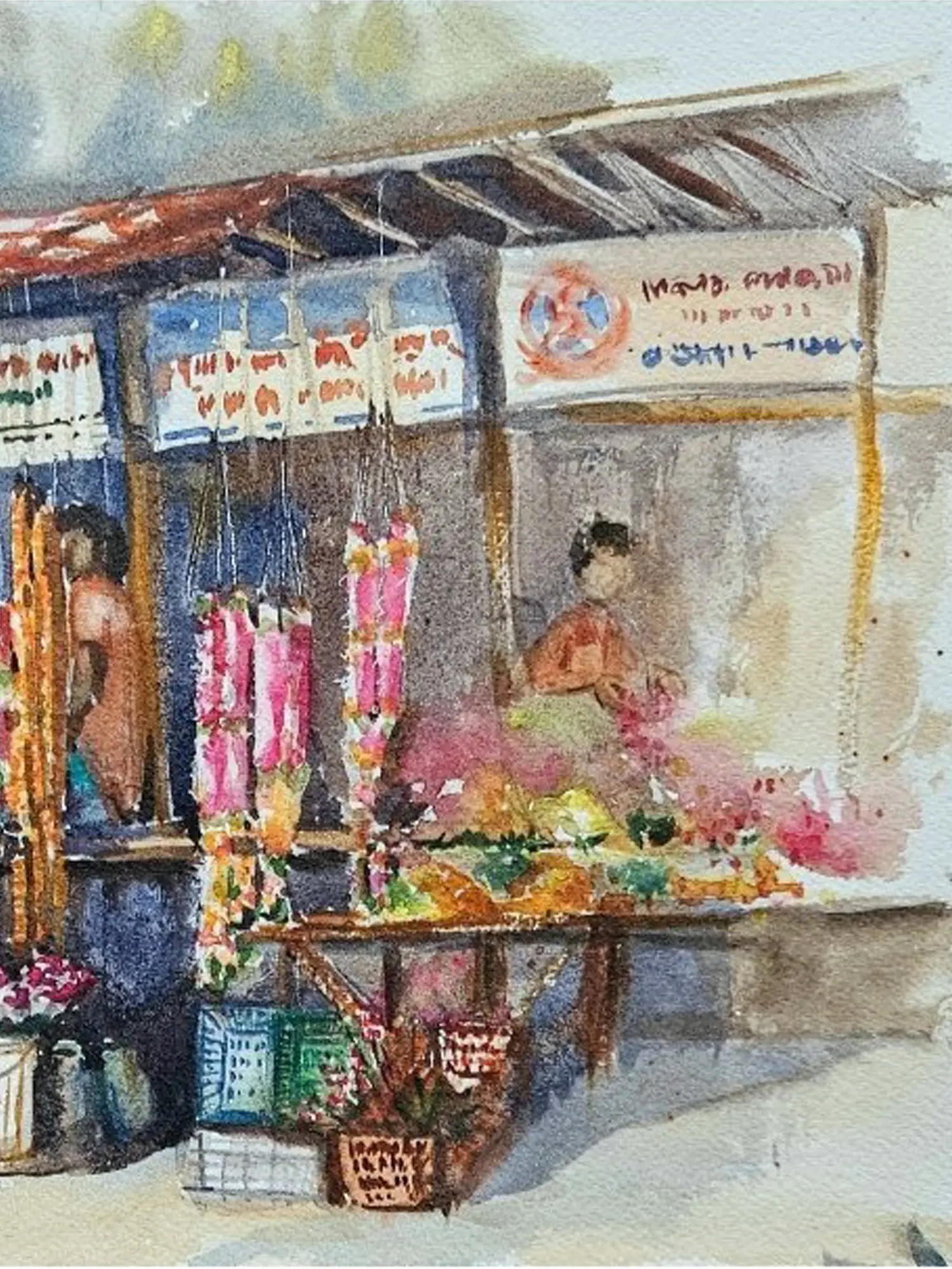 Immerse yourself in the sensory richness of a bustling marketplace, captured with breathtaking delicacy. You'll be transported to a scene brimming with life, where the air is perfumed with blossoms and the spirit of daily commerce thrives. This exquisite artwork invites you to experience the charm of everyday transactions, rendered through the masterful hand of an artist who understands the pulse of human connection.