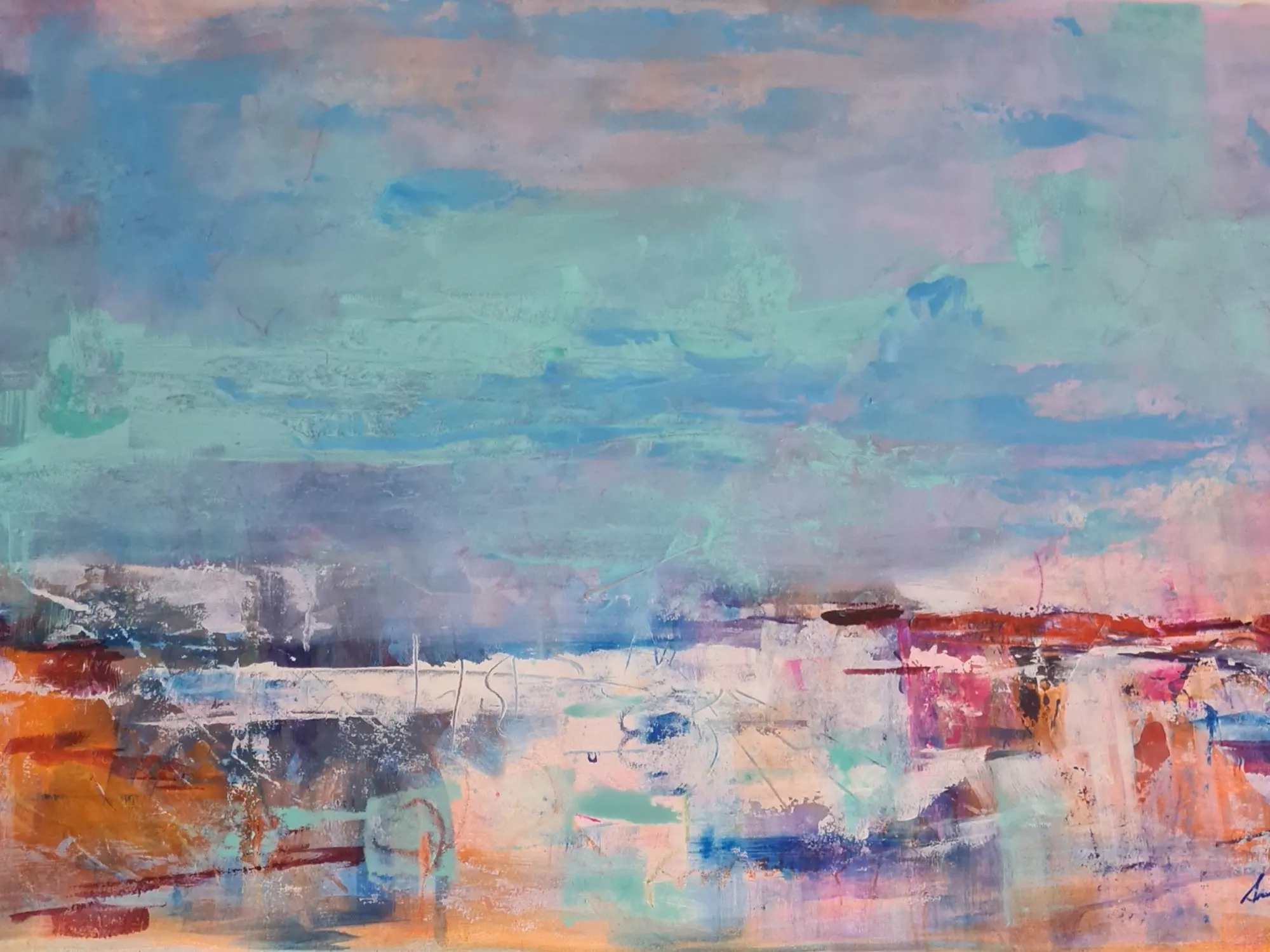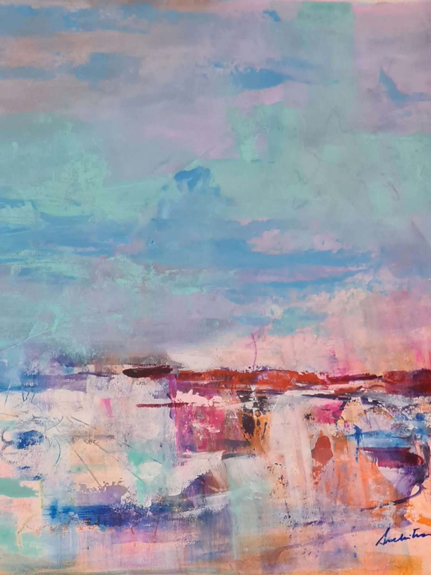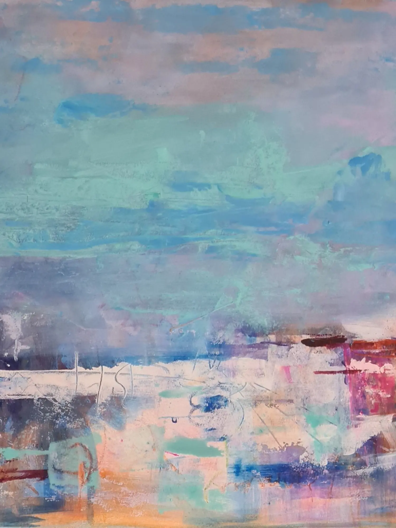 The generous 24 by 36-inch dimensions create a significant visual presence, making it a focal point in any room. Observe the expansive sky, rendered in a palette of ethereal blues, soft lavenders, and hints of rose, suggesting the subtle shifts of dawn or dusk. The lower portion transitions into an abstracted landscape, alive with energetic strokes of ochre, crimson, and cerulean, creating a sense of movement and depth. You'll find subtle details and marks within the layers that reward closer inspection, revealing the intricate thought process behind its creation.