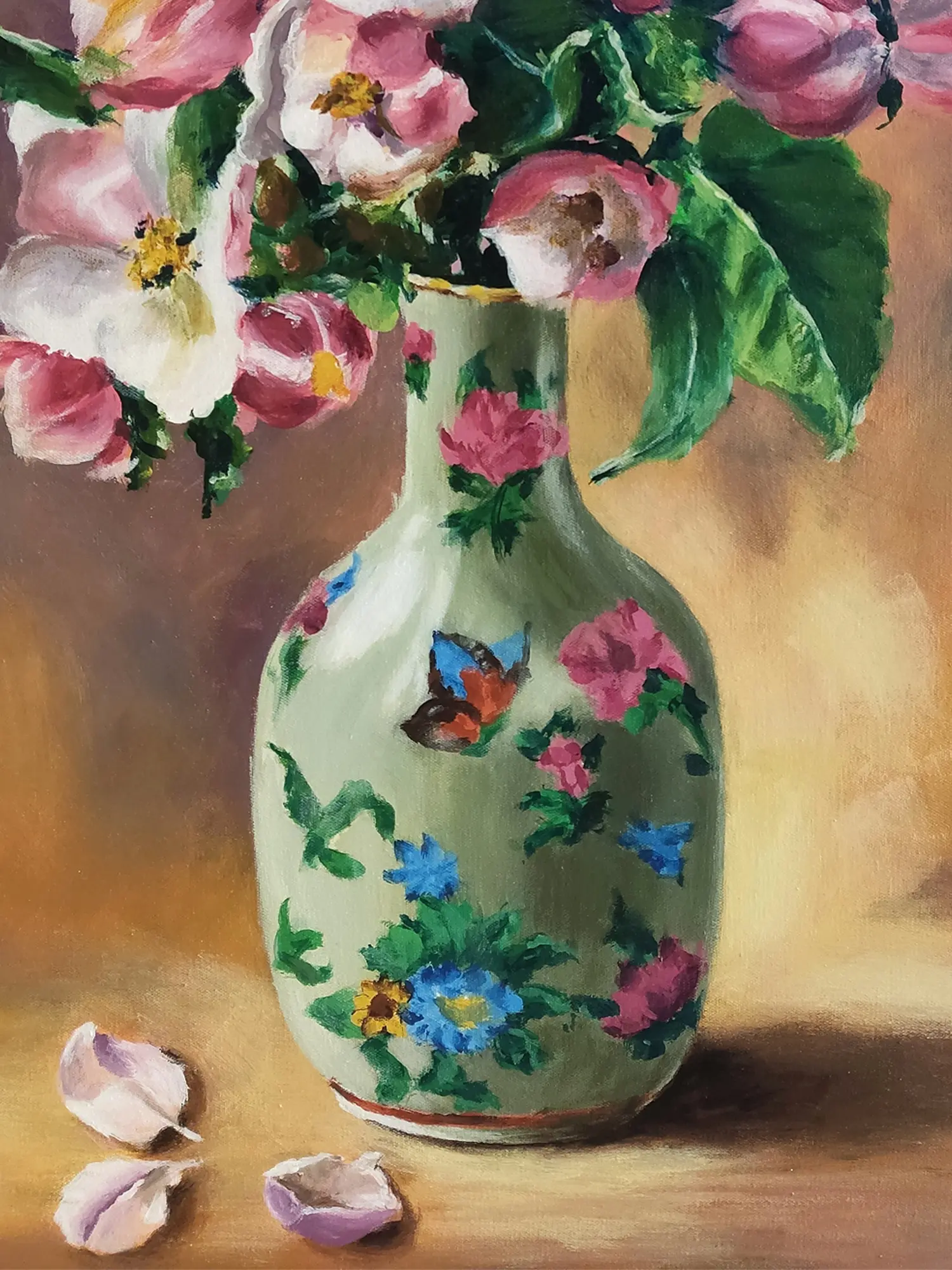 Measuring 25.90 inches in height and 18.80 inches in width, this artwork commands attention without overwhelming its surroundings. The composition is a masterclass in balance, with the lush bouquet spilling from a beautifully adorned vase. Notice the intricate details on the vase itself, adorned with playful butterflies and cheerful floral motifs, adding another layer of visual intrigue. The soft, diffused background allows the central subject to truly shine, inviting your gaze to linger.
