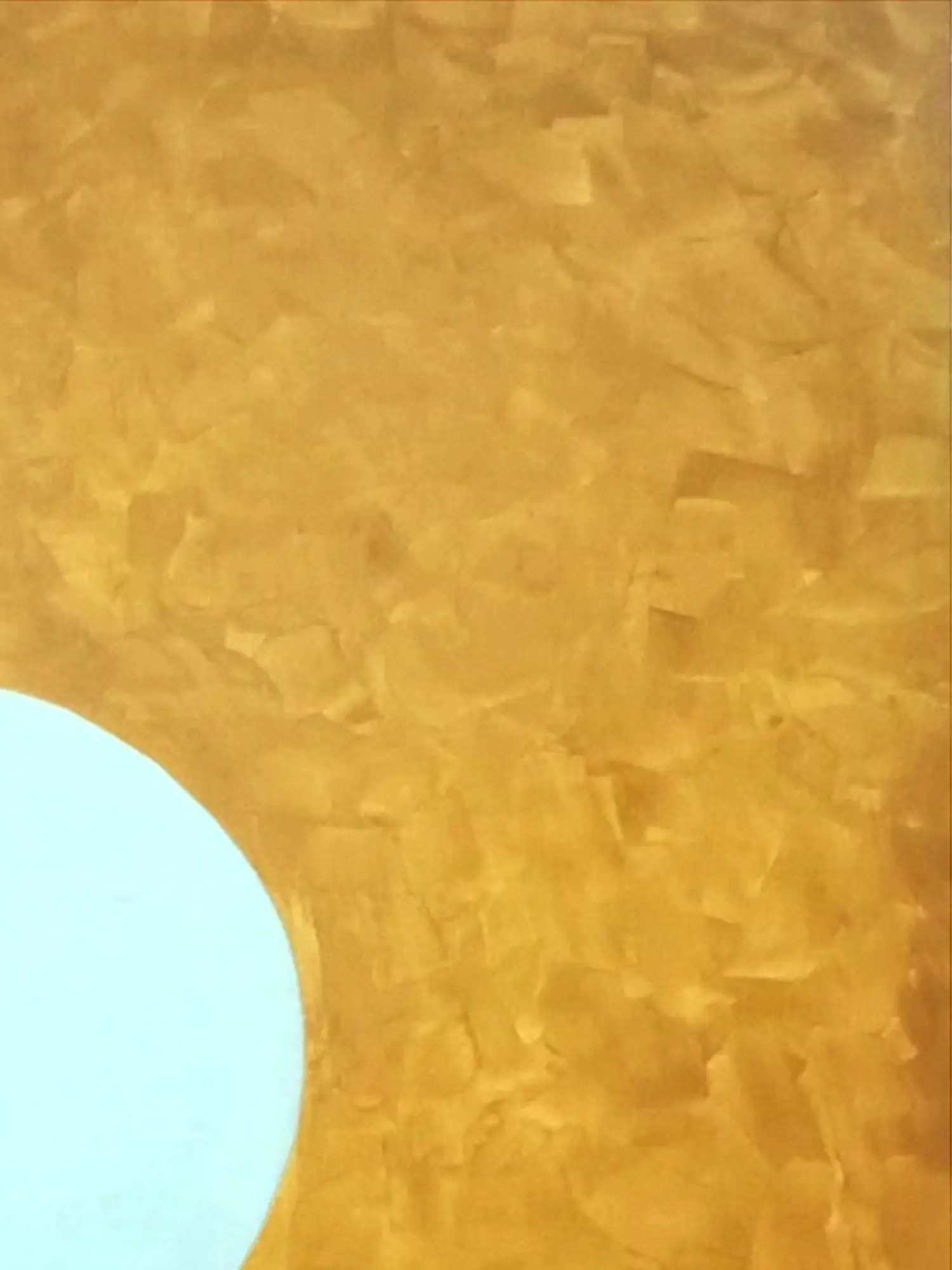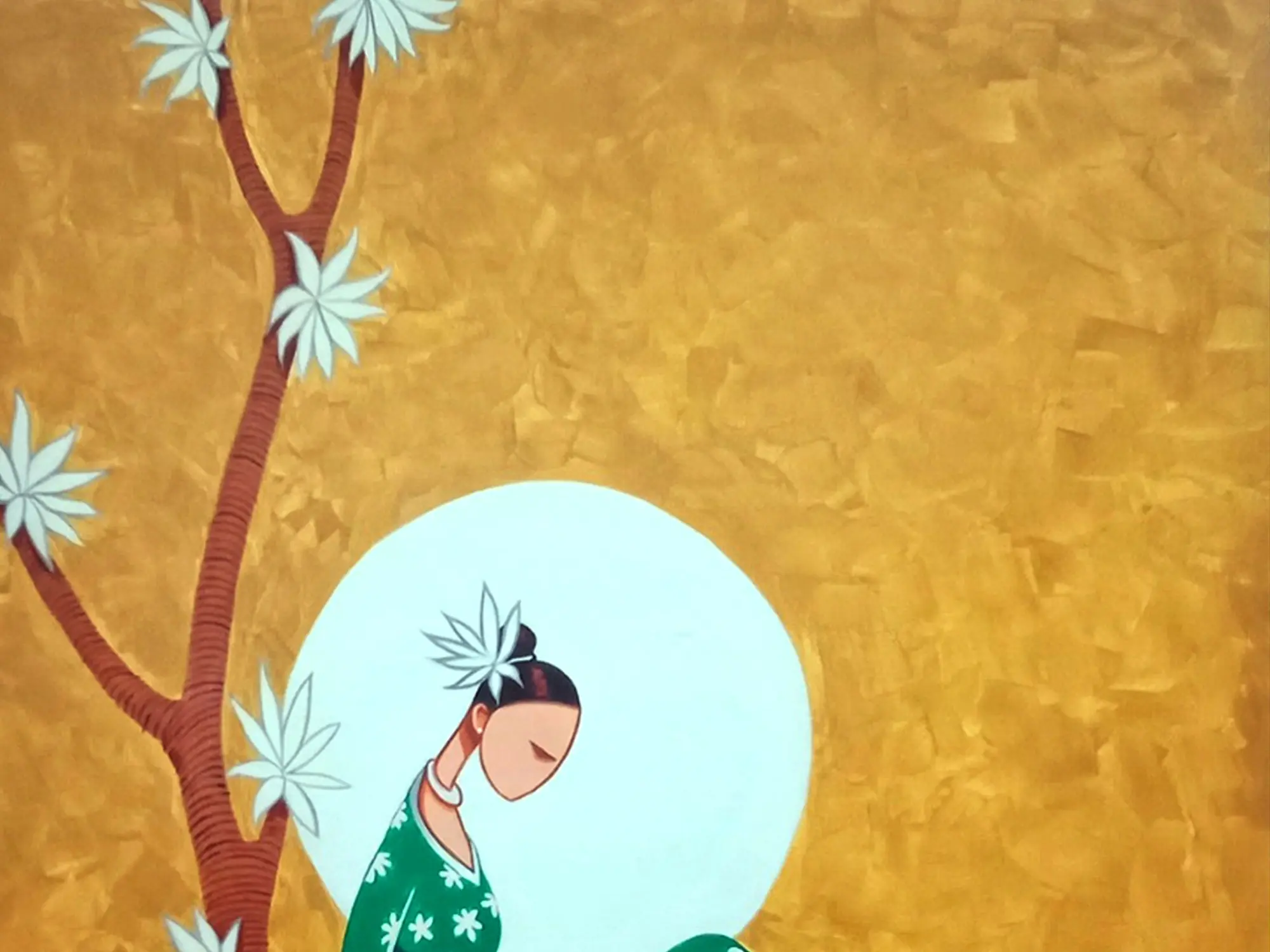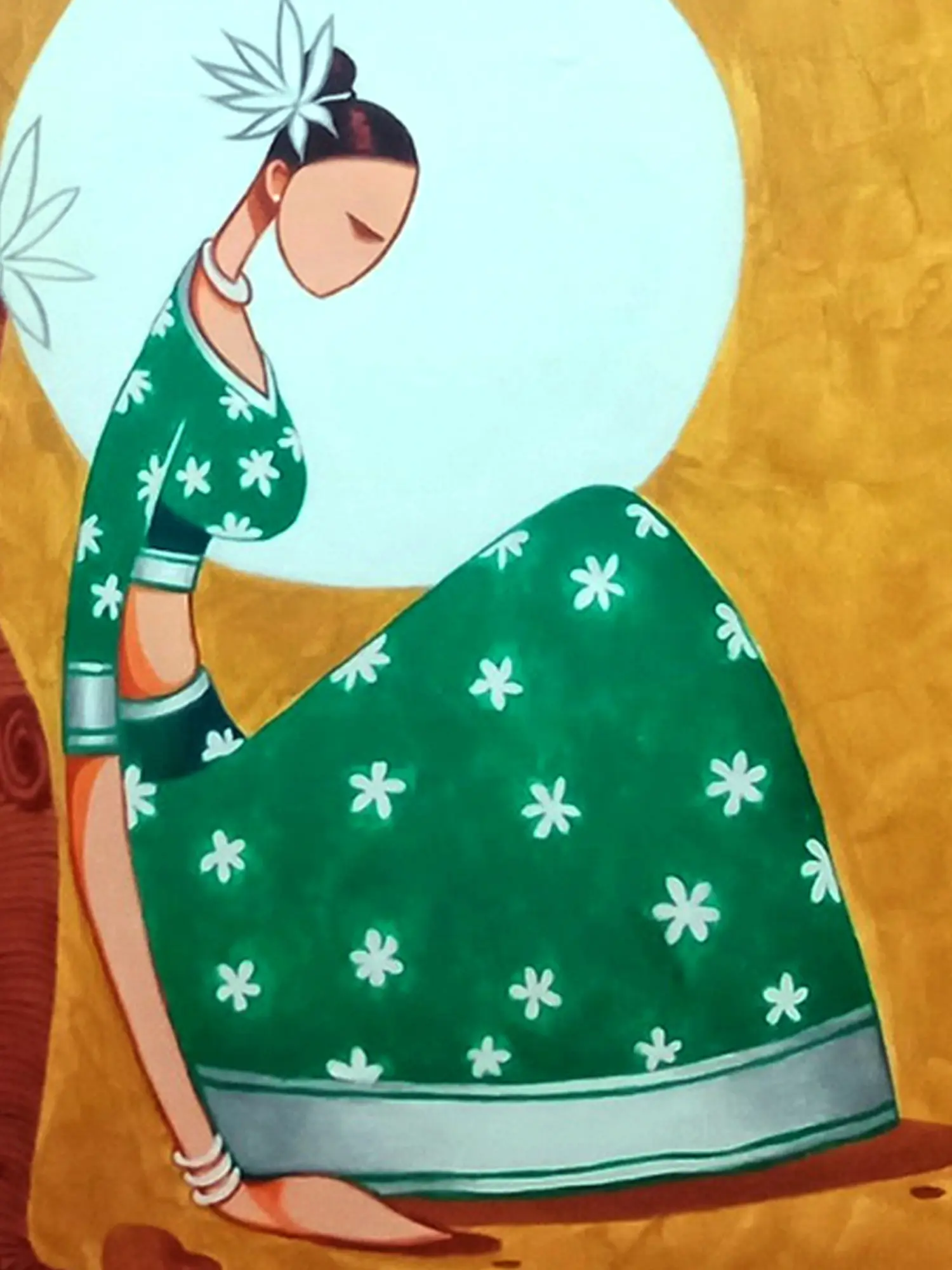 The striking contrast between the warm, textured ochre background and the cool, stylized elements creates a visually arresting experience. A graceful figure, adorned in traditional attire patterned with delicate white flowers, rests beneath the symbolic branches of a tree. The luminous circle behind her suggests a serene moon or sun, casting a gentle glow that enhances the overall aura of tranquility. The composition, measuring 33.00 inches in height and 26.00 inches in width, achieves a perfect balance that draws the viewer into its captivating narrative.