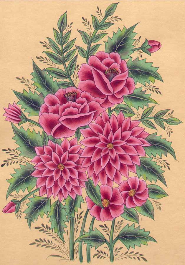 These meticulously drawn flowers in a variety of arrangement are flawless in depiction. One of the very striking compositional element are the flowers projecting different facets at different angles. Leaves form a natural frame to enclose the cluster of flowers and are arranged in a manner that shows delicacy of rhythm and balance. Various shades of green have been used in depicting the leaves in order to impart realism to the study. The tender petals and lively leaves suggest careful rendering of the pigment, applied thinly. The shading is equally delicate. The stamens in some flowers are clearly shown with the help of fine lines and in the others, those with a frontal view, the artist has painted a circle depicting stamens.