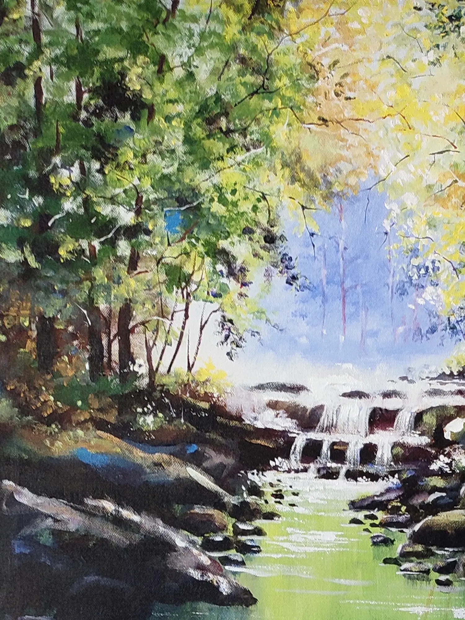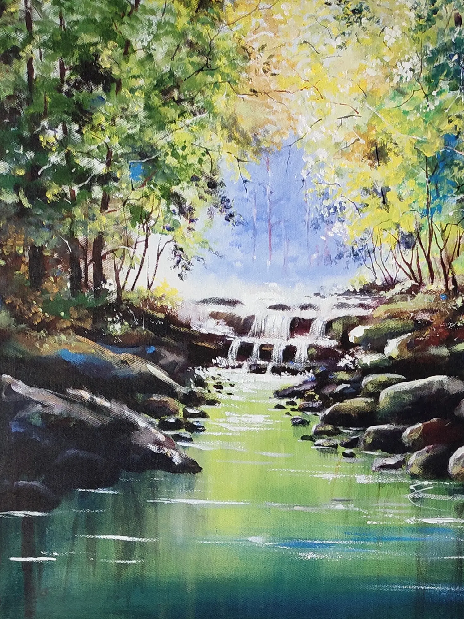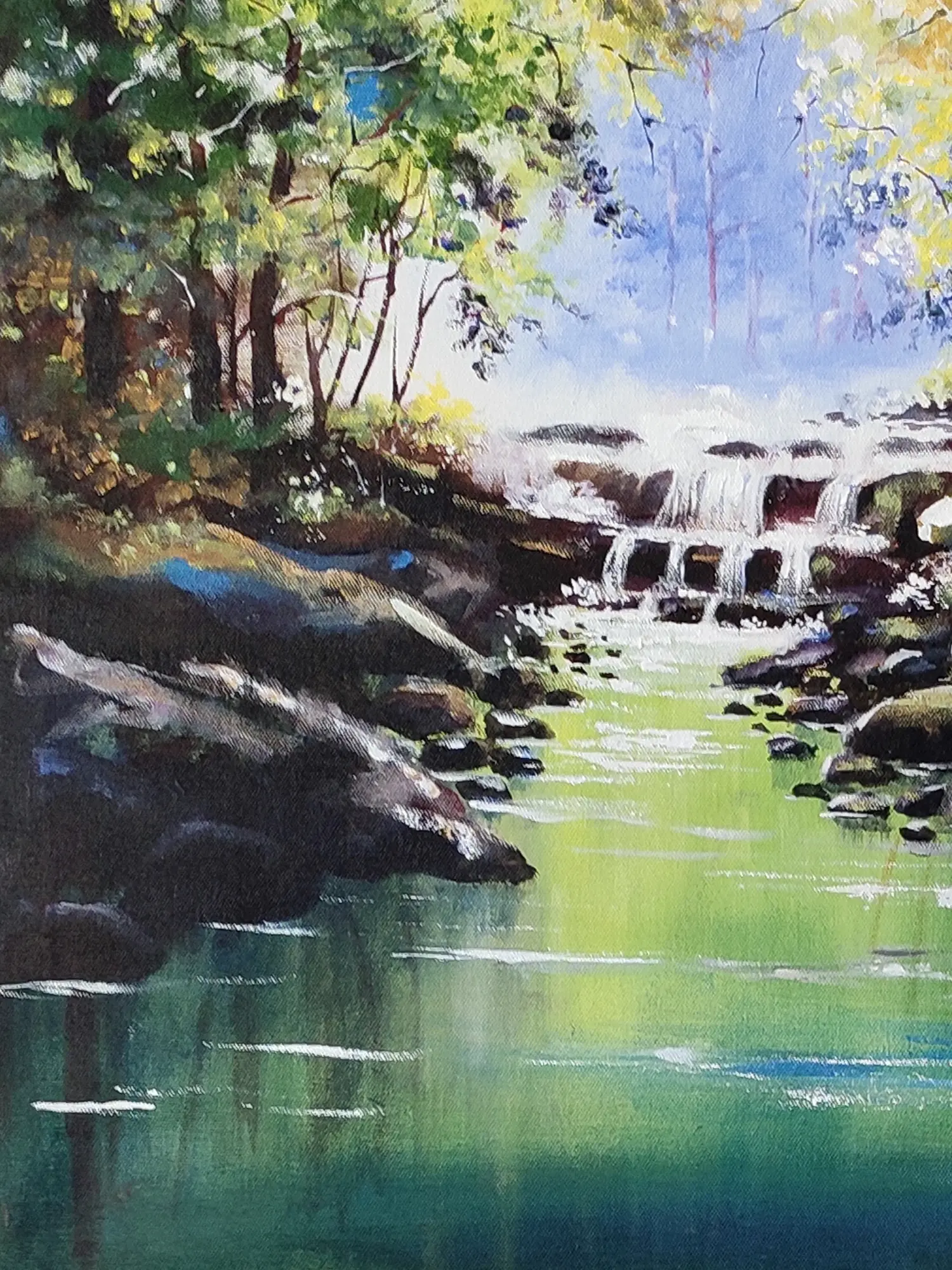 Immerse yourself in the tranquility of nature with this captivating acrylic on canvas, a piece that invites contemplation and peace. It's a testament to the enduring allure of untouched landscapes, offering a visual escape to a world where the elements converge in harmonious beauty. You'll feel the gentle murmur of water and the dappled sunlight filtering through lush foliage.