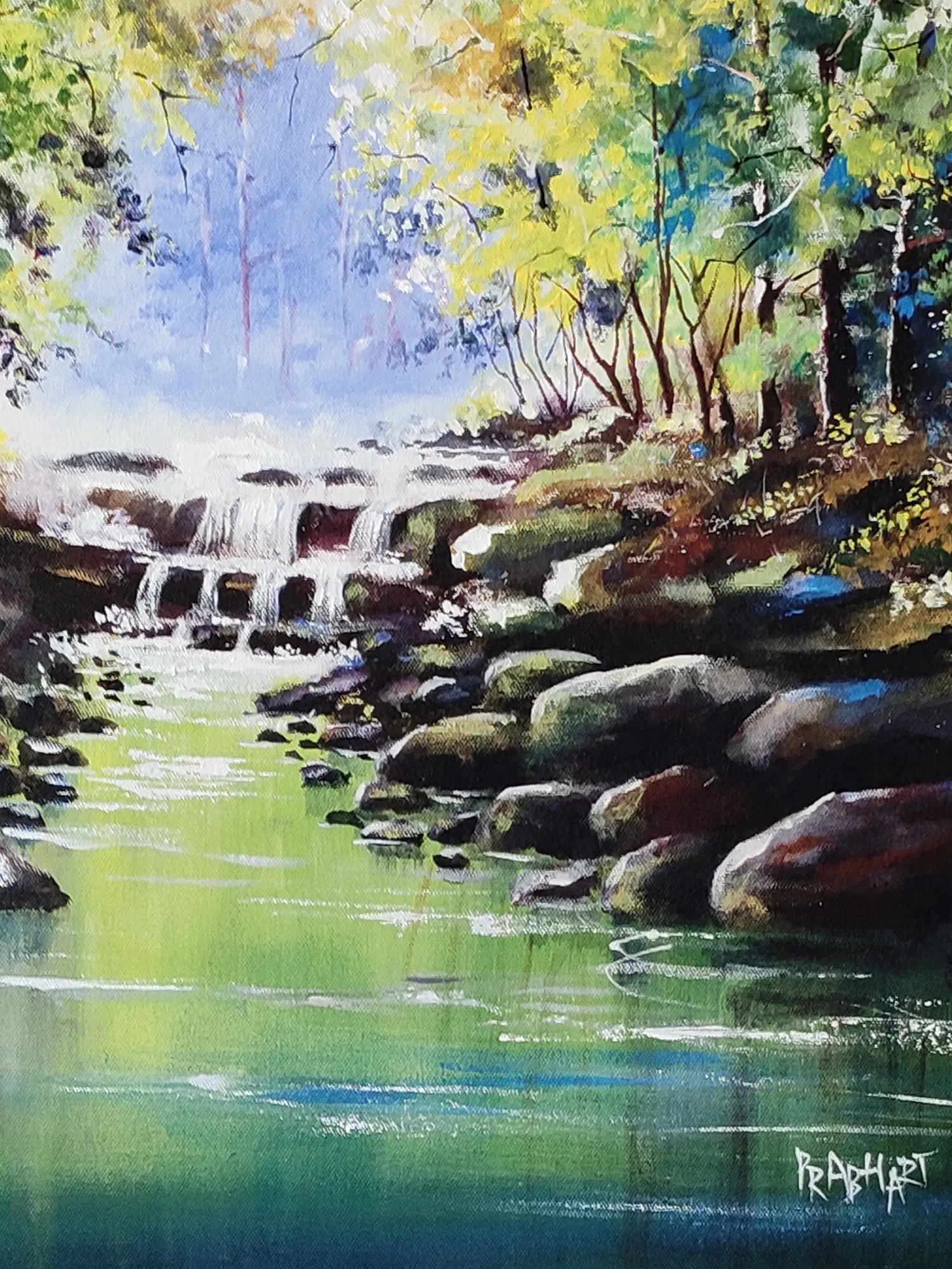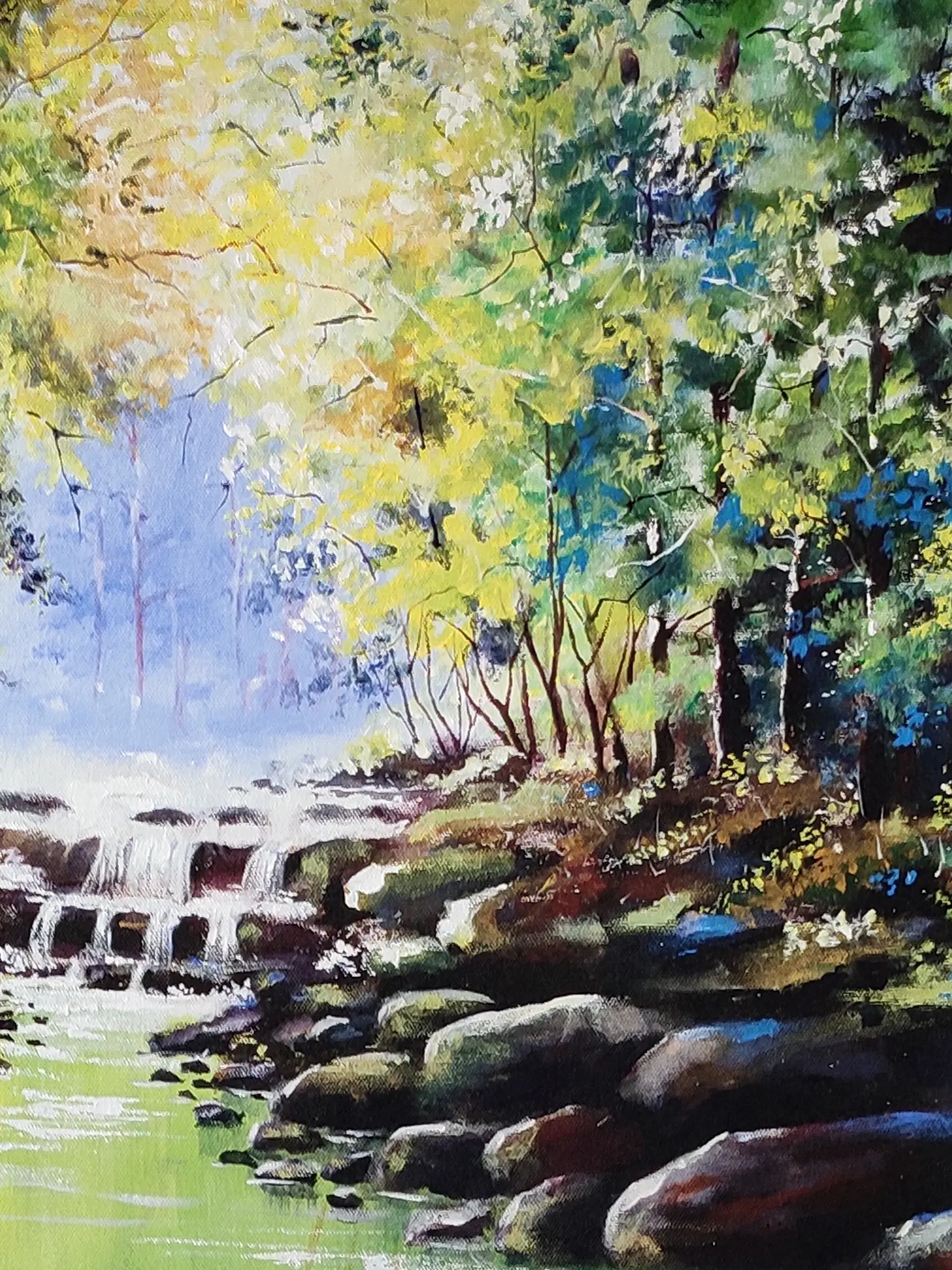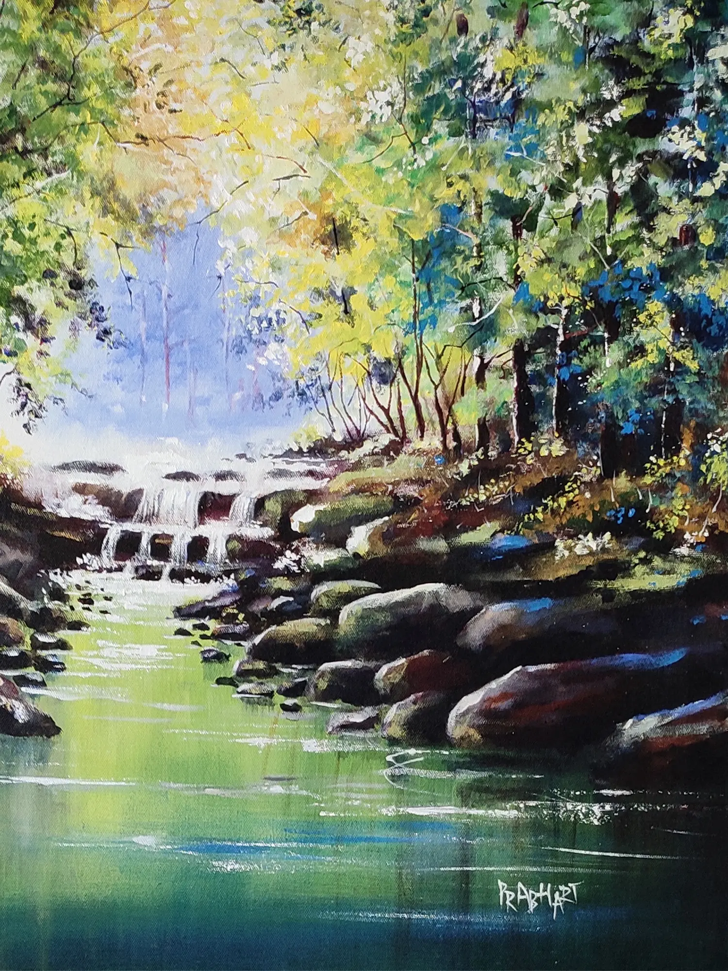 Immerse yourself in the tranquility of nature with this captivating acrylic on canvas, a piece that invites contemplation and peace. It's a testament to the enduring allure of untouched landscapes, offering a visual escape to a world where the elements converge in harmonious beauty. You'll feel the gentle murmur of water and the dappled sunlight filtering through lush foliage.
