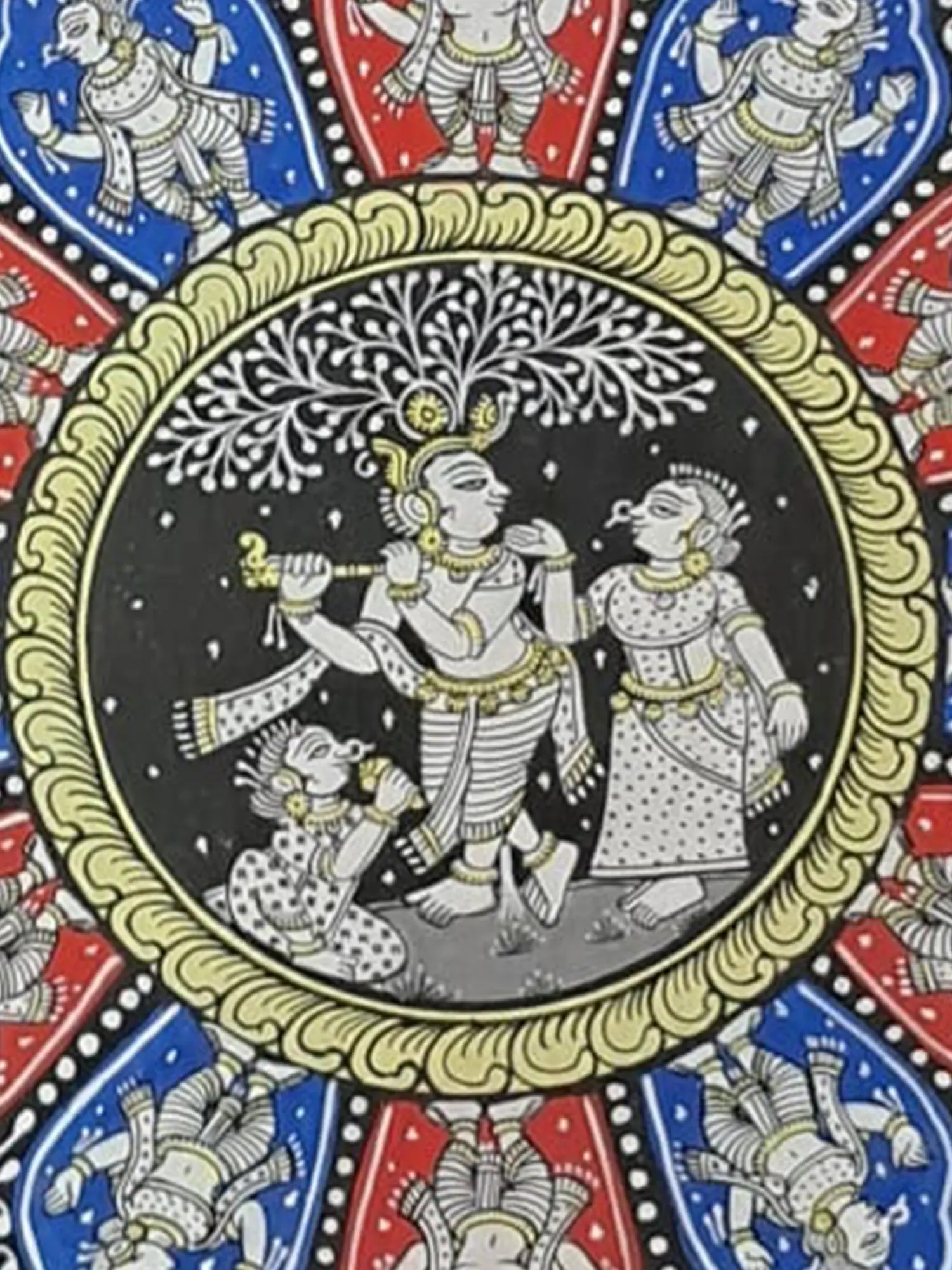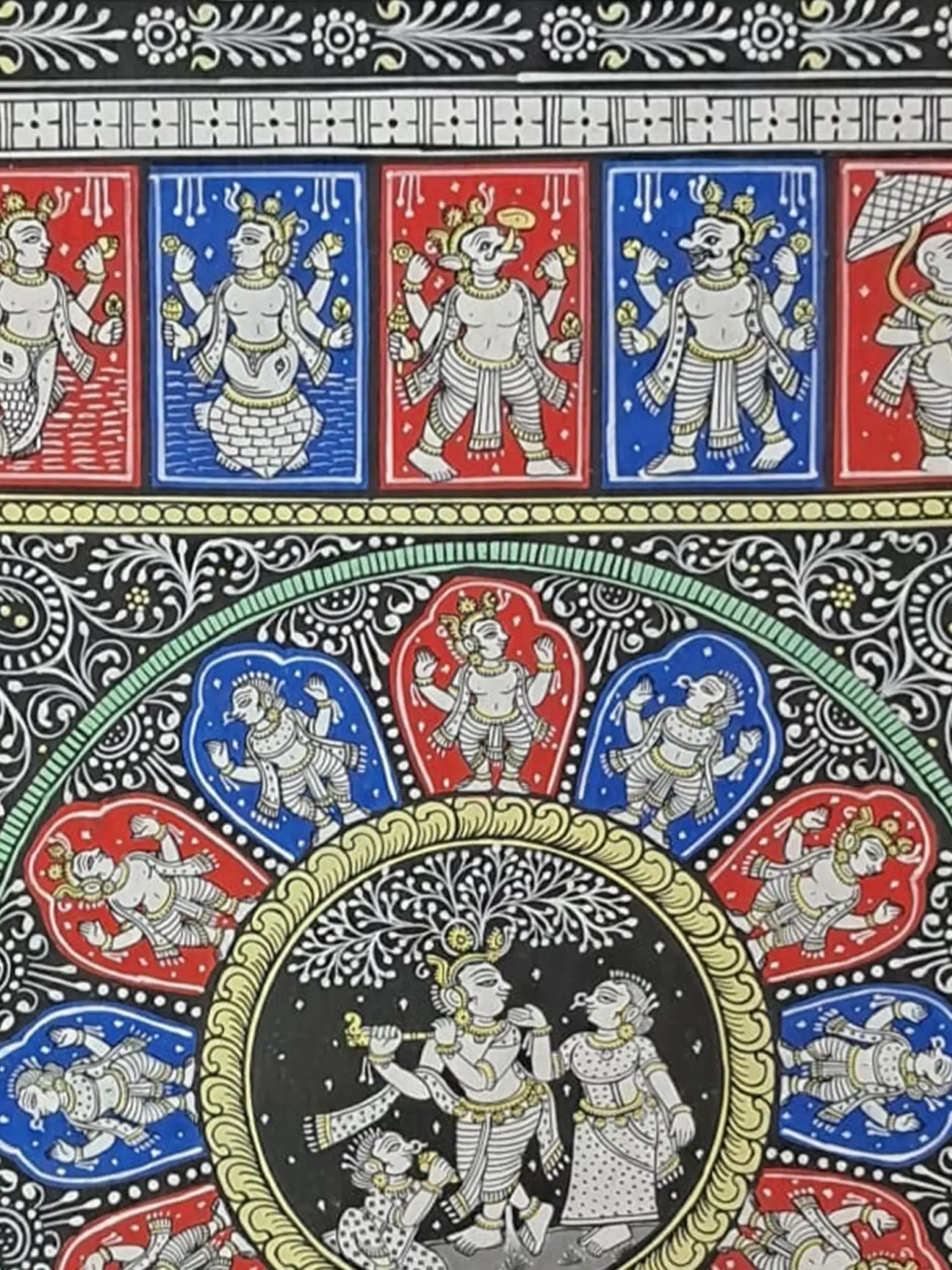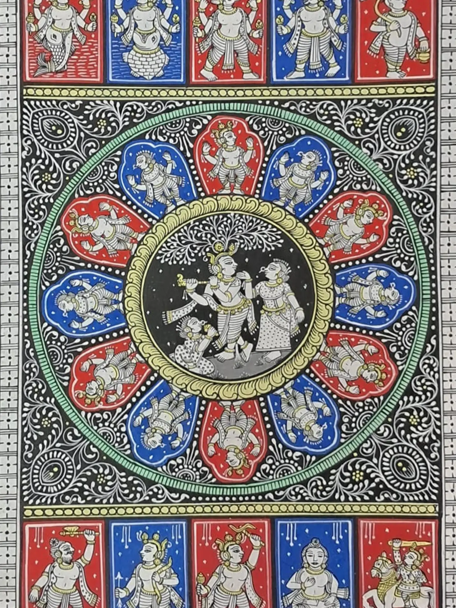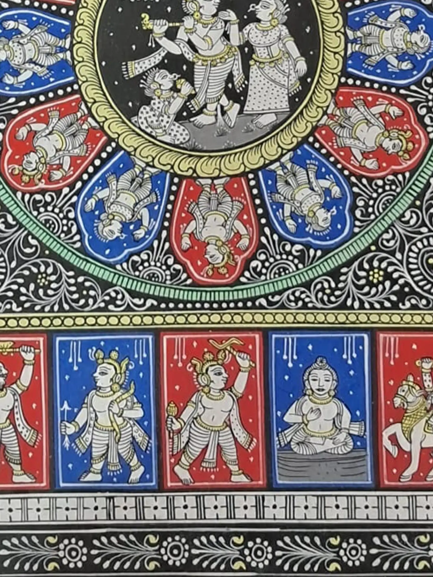 Within this enchanting depiction of Fluting Krishna and Dashavatar, the timeless tales of Hindu mythology unfold in gorgeous display of artistry and imagination. Crafted from natural stone colours, each scene comes to life with vivid detail and emotional depth, inviting viewers to immerse themselves in the epic narratives of gods and mortals. From Matsya's enchanting depths to the heroic anticipation of Kalki, each moment within the painting resonates with the enduring power of myth and legend. This artwork is a tribute to the rich tapestry of Indian culture and the timeless wisdom it imparts.