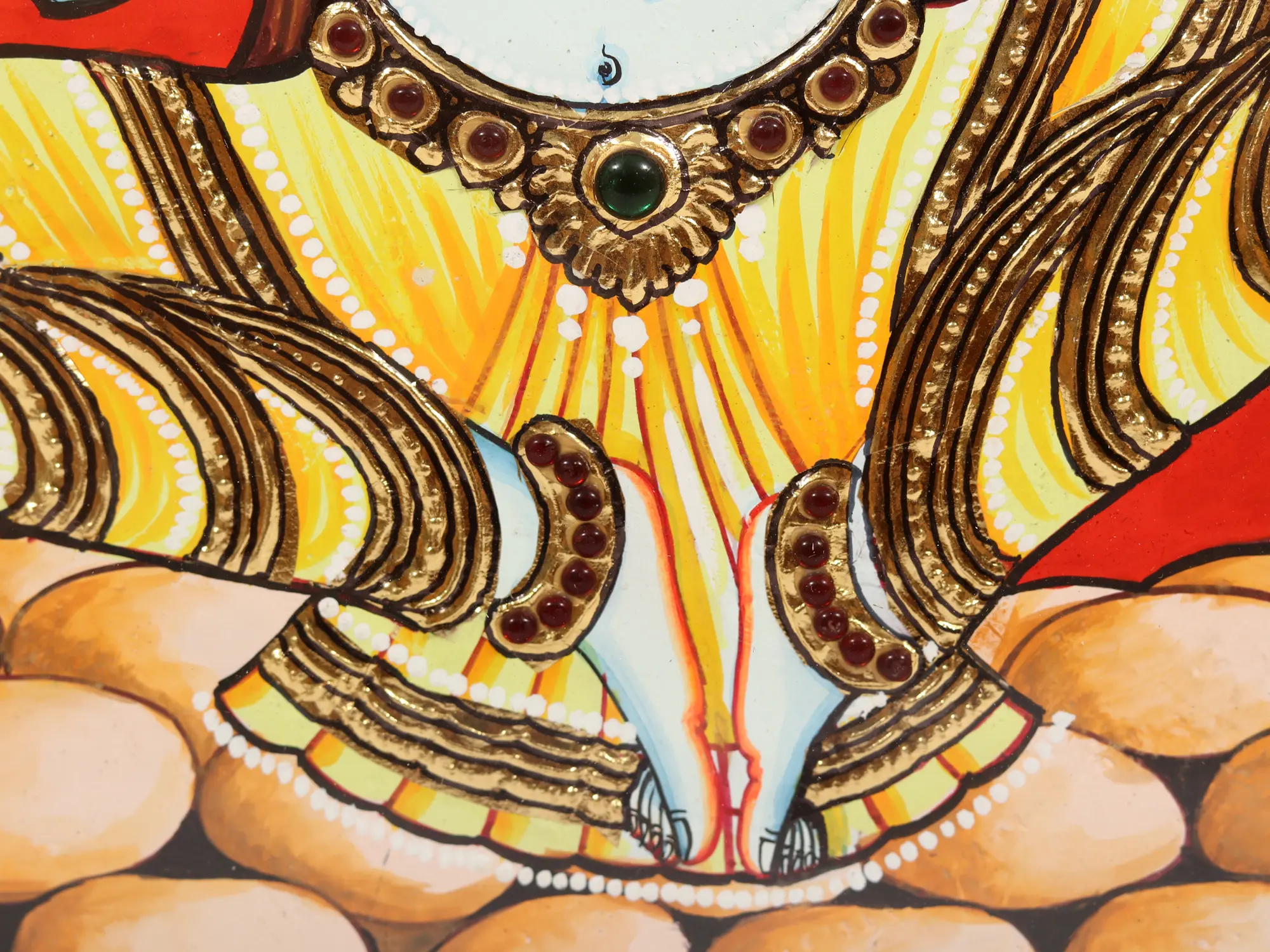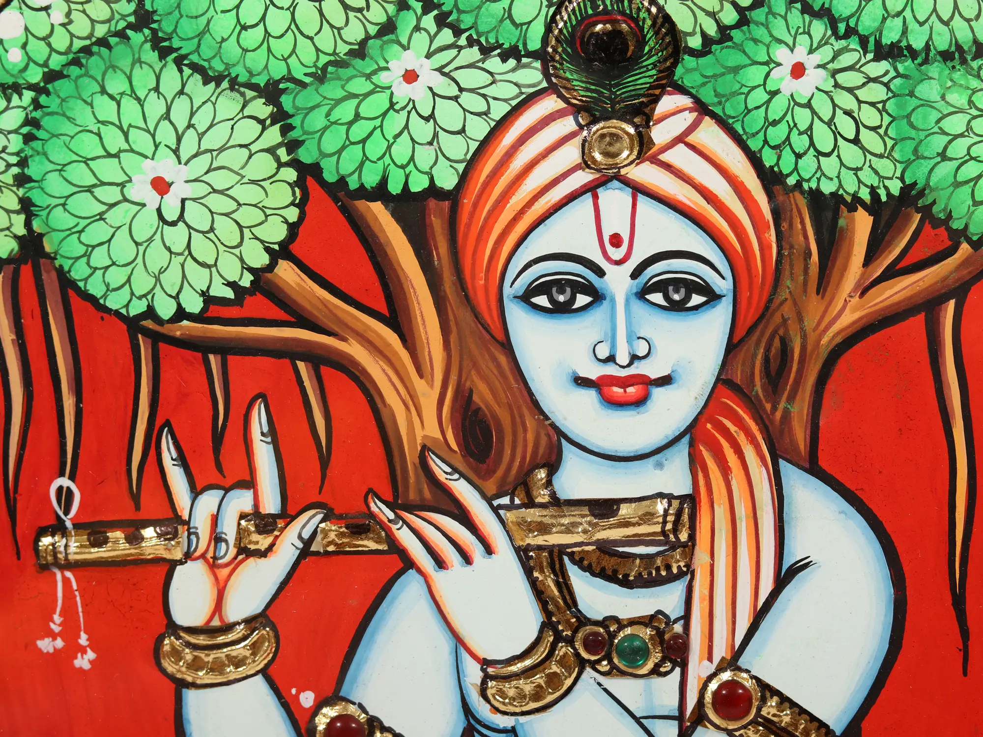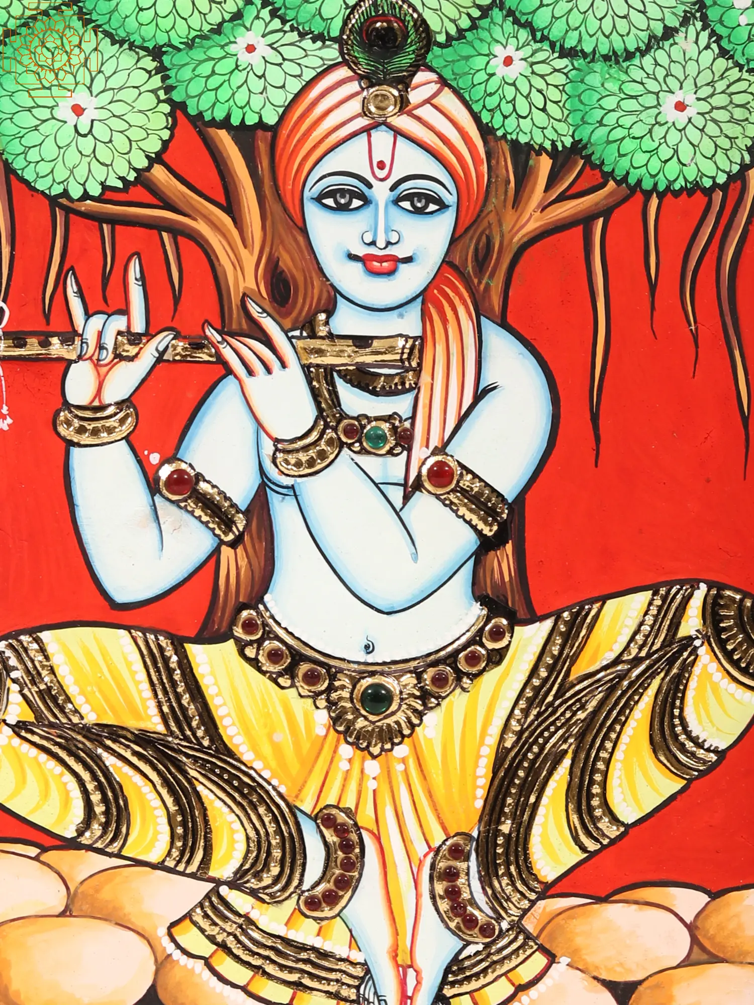 Lord Krishna, the supreme one of Vrindavan, sits gracefully with melodious-divine flute as his captivating form exudes an aura of enchantment and divinity. The heavenly melodies that flow from his flute resonate through the hearts of all the beings as they exist. This Tanjore painting serves as a reminder of the boundless joy and love that He bestows upon His devotees through the divine rhythms of music.