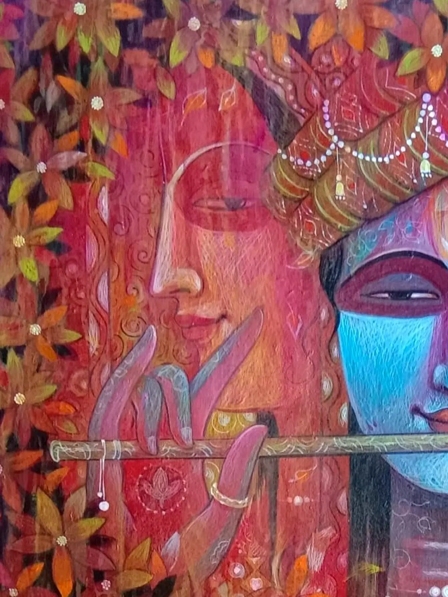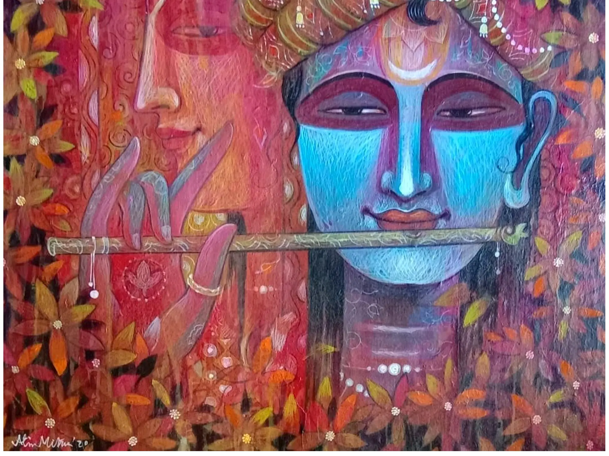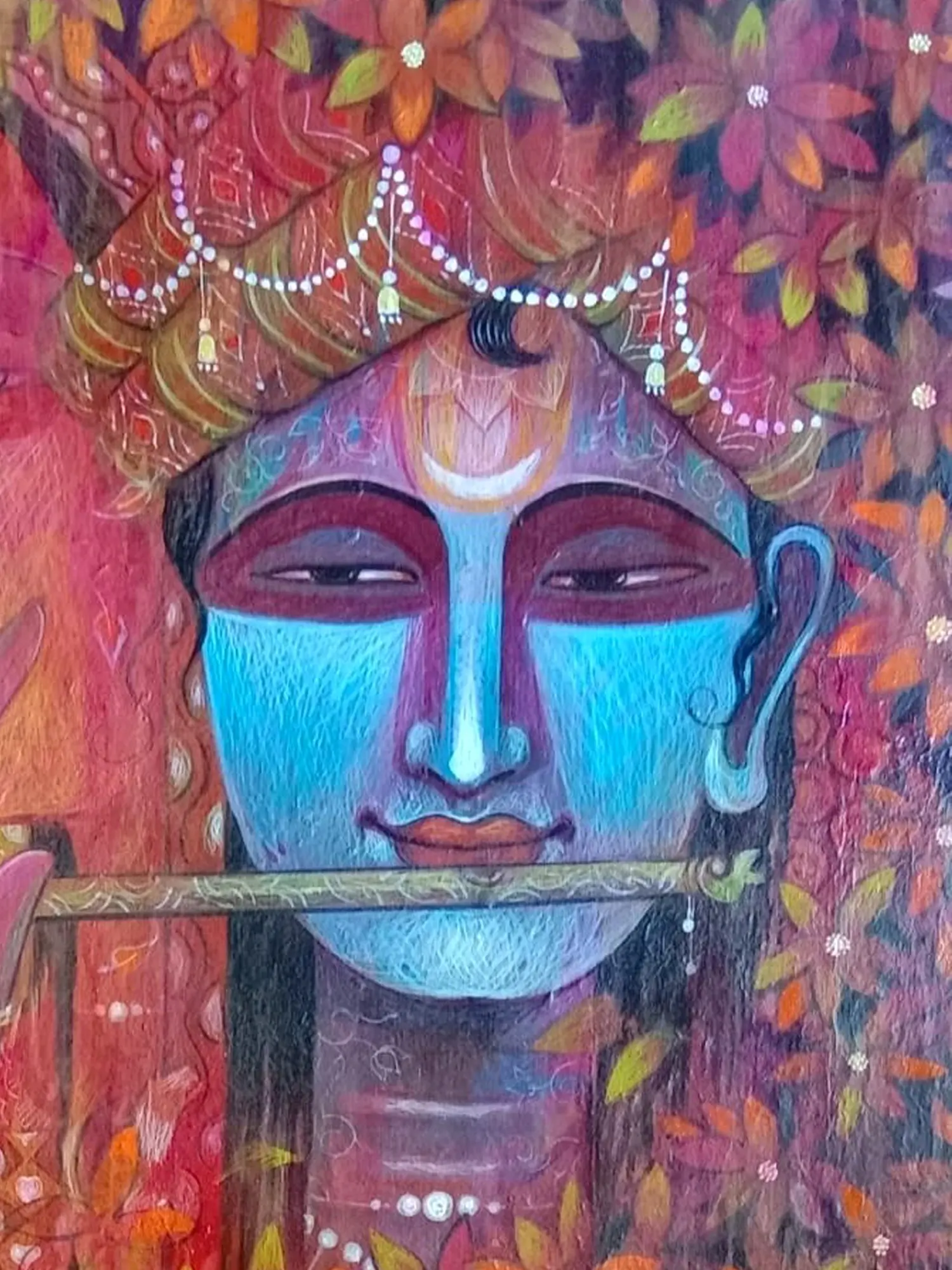 The heavenliness of Krishna, whose flute charms the three realms, whose form as nurturing as the rain-filled clouds nourishes the heart of his devotees, is presented in this acrylic on canvas by Atin Mitra in a divine visual language. The artist has placed Krishna in the front, adorned by blooming flowers that border him beautifully. Under his lovely patterned Pagdi and charming curl of hair is the crescent moon and the symbol of the sacred lotus, representing the supreme wisdom of Param Brahman, who manifests as Krishna. In the background is the image of Radha, displayed with a faint pink to symbolize her gentle affection for Krishna. Shining bright as a blue gem in the artwork, Murli Manohara- the enchanting fluting youth, Krishna smiles to fill the canvas with a sweetness beyond words.