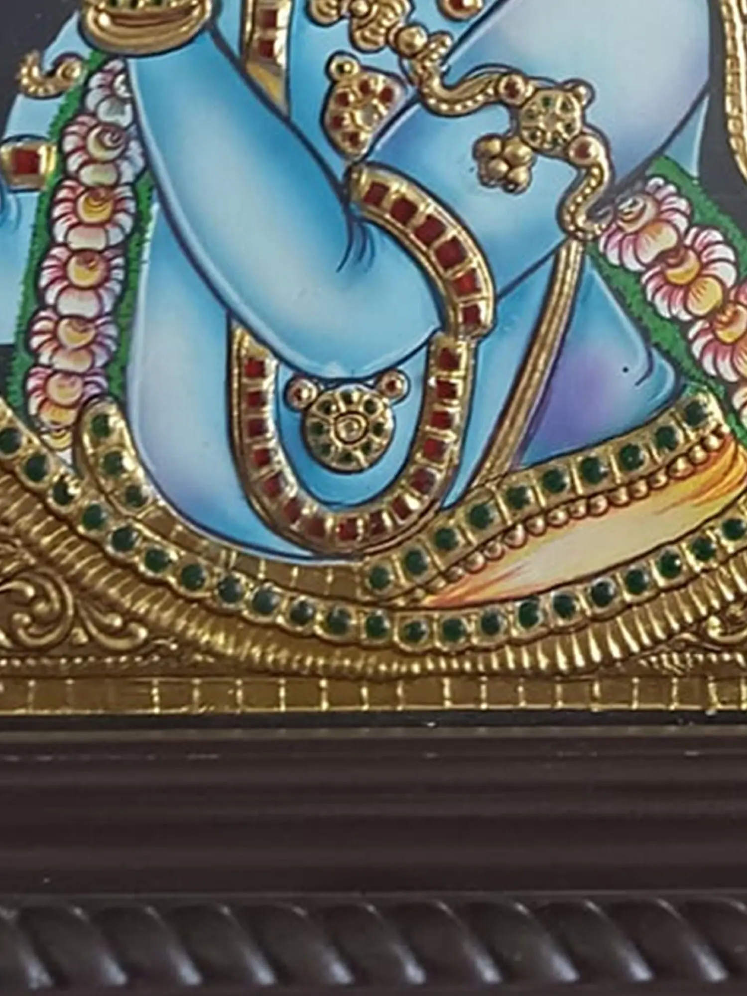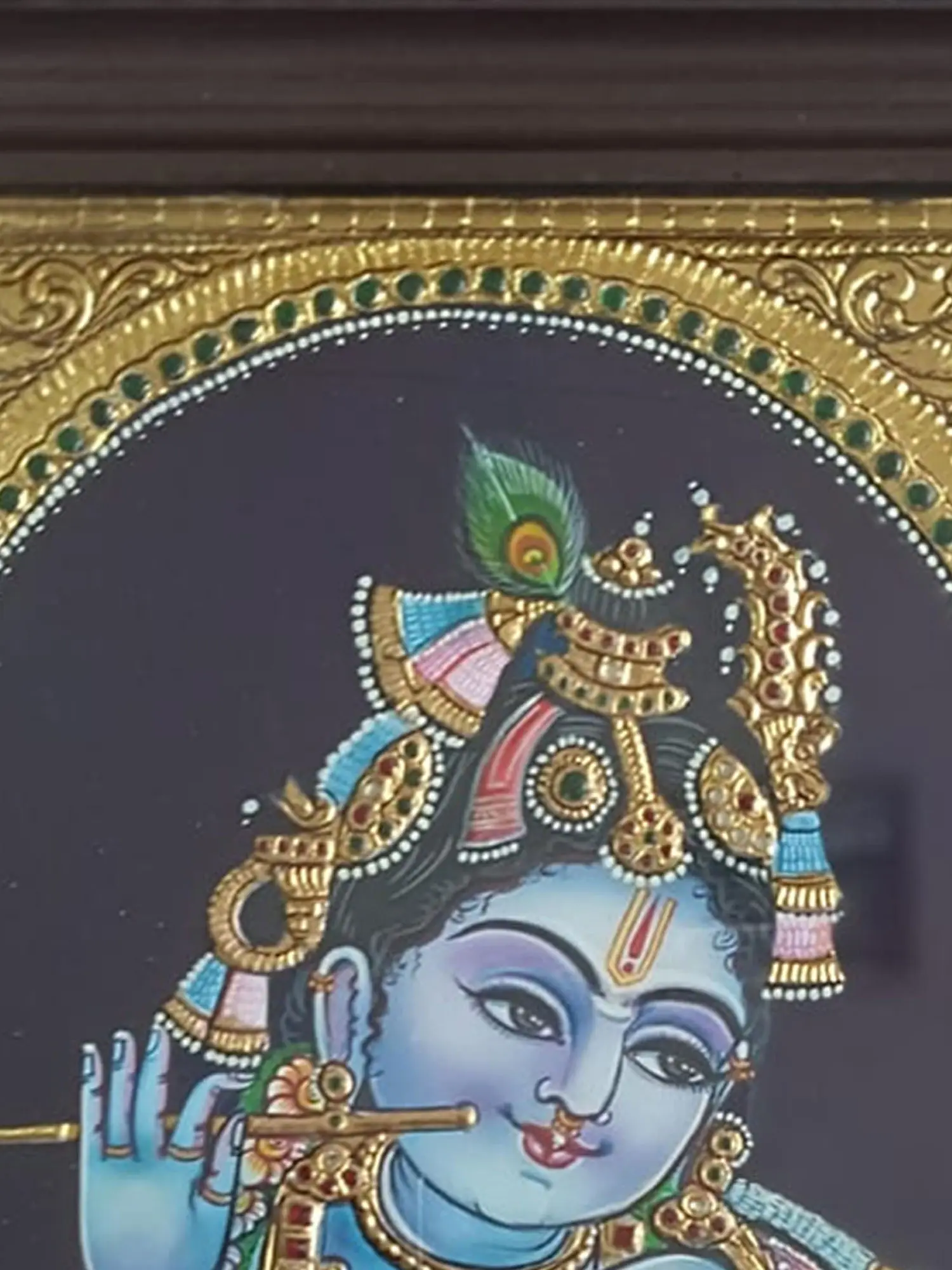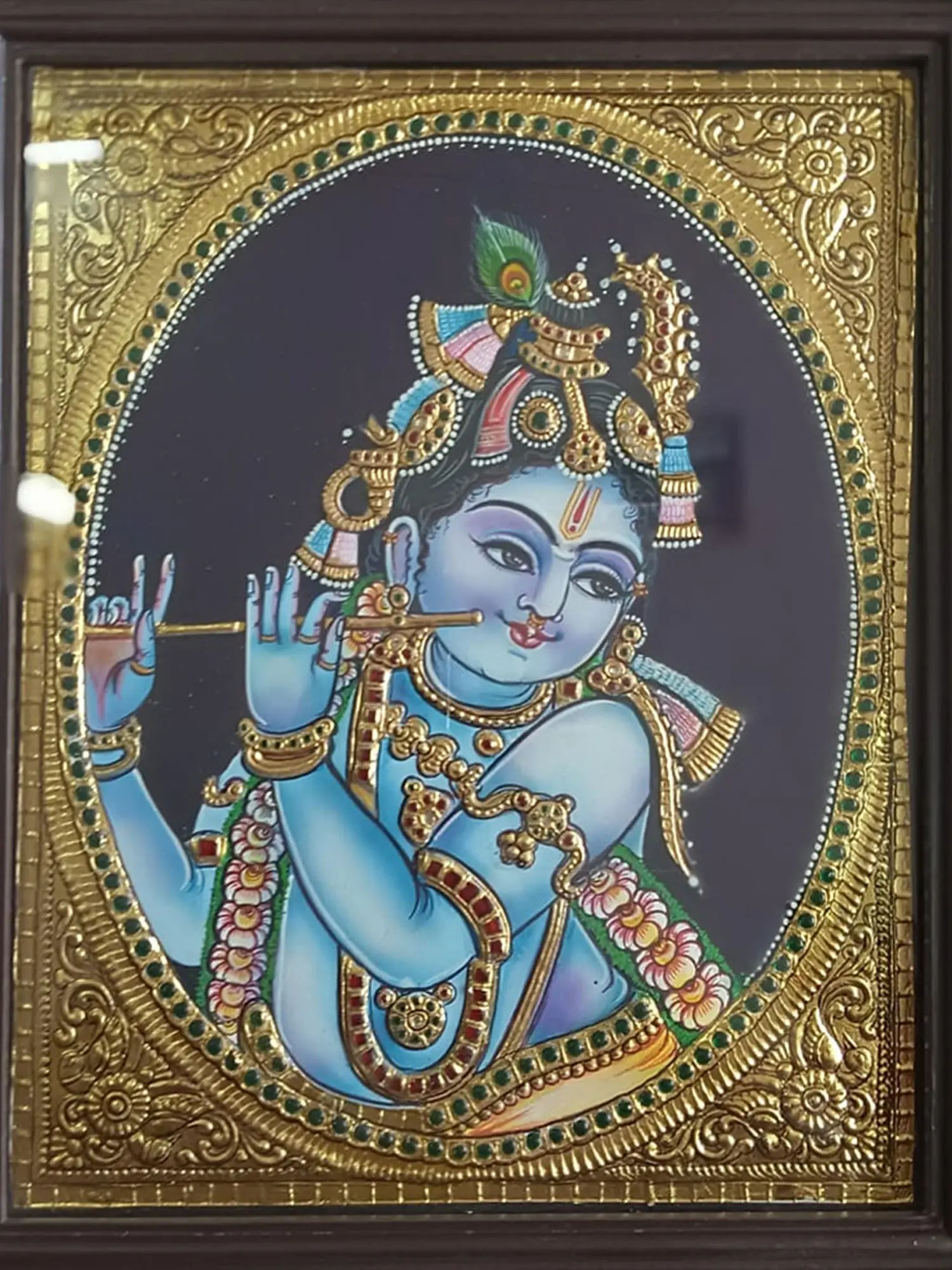 Encased in a framed composition, it becomes a sacred window to the divine, inviting viewers to immerse themselves in the timeless charm of Krishna's fluting persona. This Tanjore Painting not only captures visual splendor but also evokes a poetic essence, as if the divine melody of Krishna's flute resonates within the colors and textures, creating a soul-stirring portrayal of the Fluting Gopal.